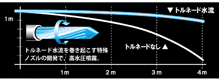 独自のポンプシステムとトルネード水流でコンパクトサイズながら高水圧の噴射を実現。