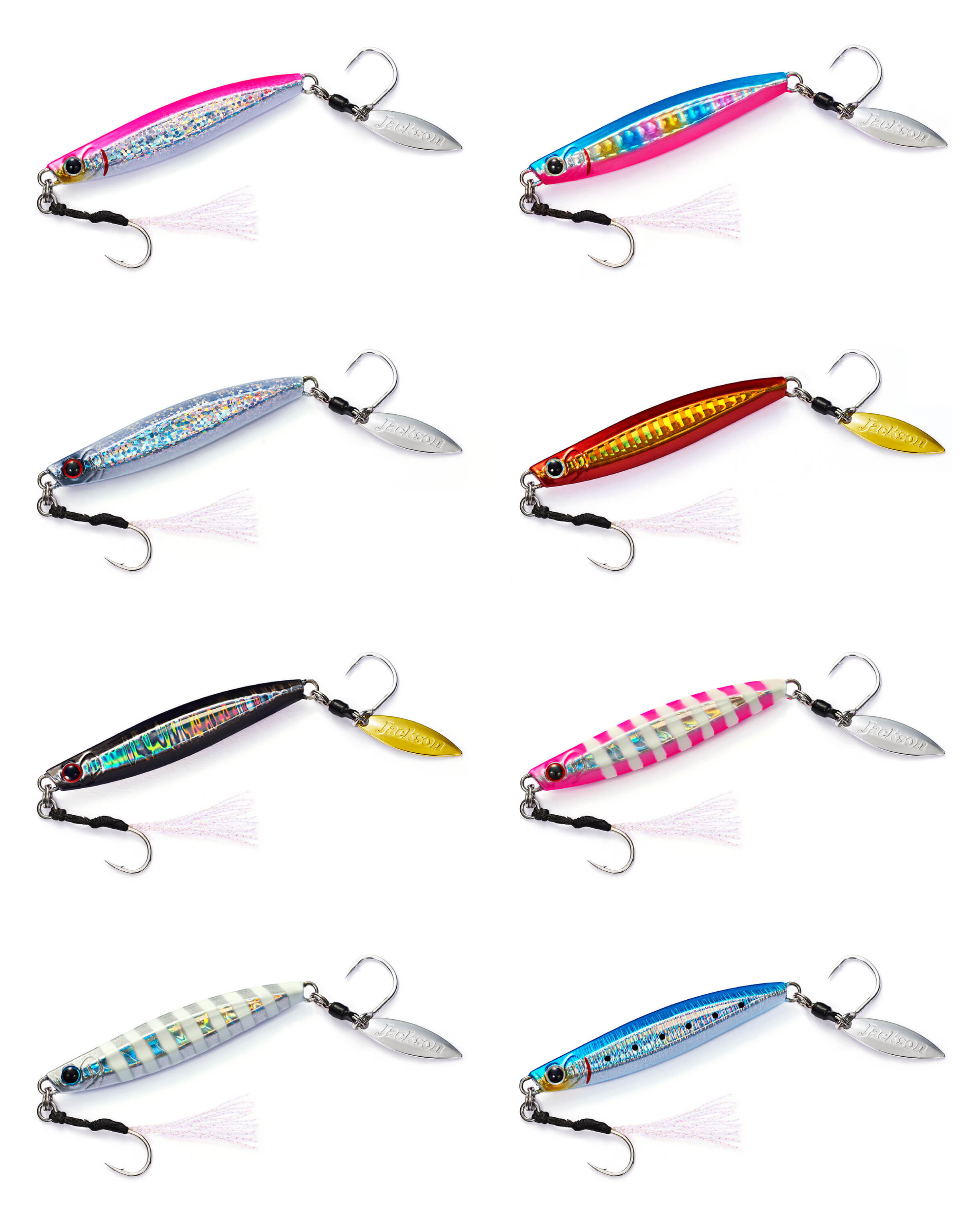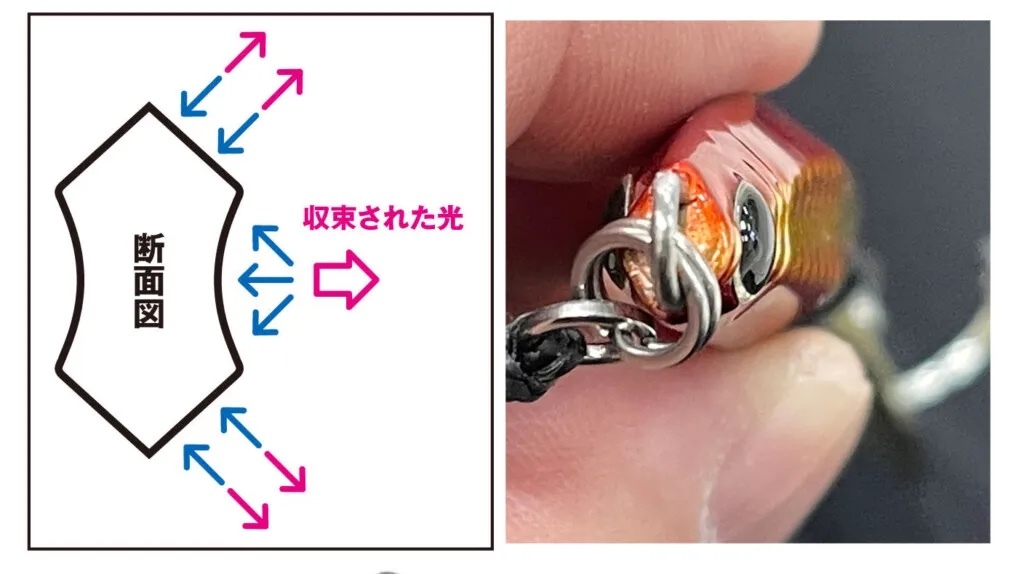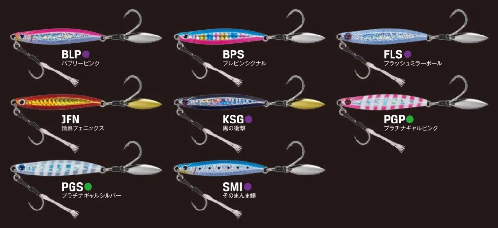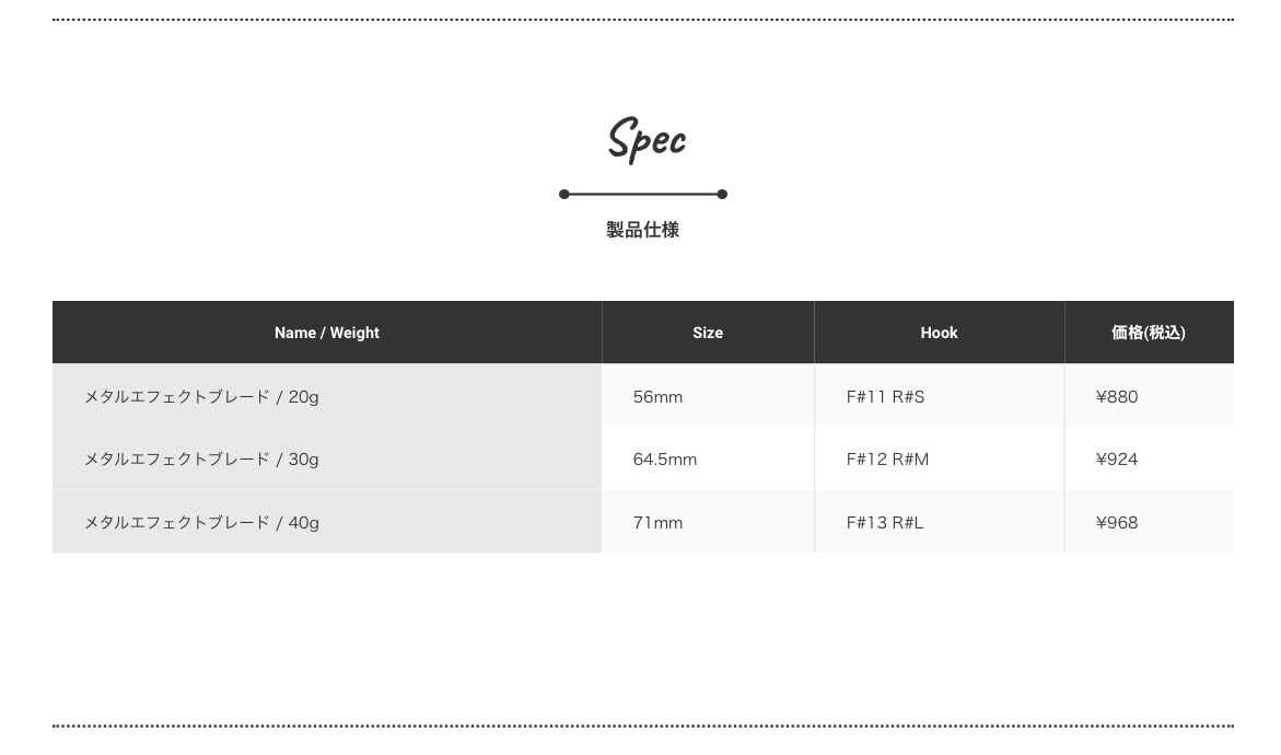 メタルエフェクトStayfallでは縦の釣りを意識した喰わせの間を演出。このメタルエフェクトBladeは巻きの釣りを意識した横の釣りに焦点を合わせ開発しました。Stayfallでは窪みを設けた面と、左右非対称エッジによるフォール専用でしたが、このBladeモデルでは、窪みとエッジを対照にする事でボディーの細かな揺れでフラッシングの強弱を発生させるように設計しています。ブレードによる煌めきアピール+強さの違うフラッシングは、高速で回遊する青物に対しダブルのフラッシング効果で集魚力をとことんまで高めました。青物の回遊スピードはとても早く、ヒットした瞬間にフックへ掛かる重量は大きい為、トリプルフックよりも強度の強いシングルフックを採用。ワンチャンスを物にする、掛けた獲物は逃さないメタルジグの完成です。