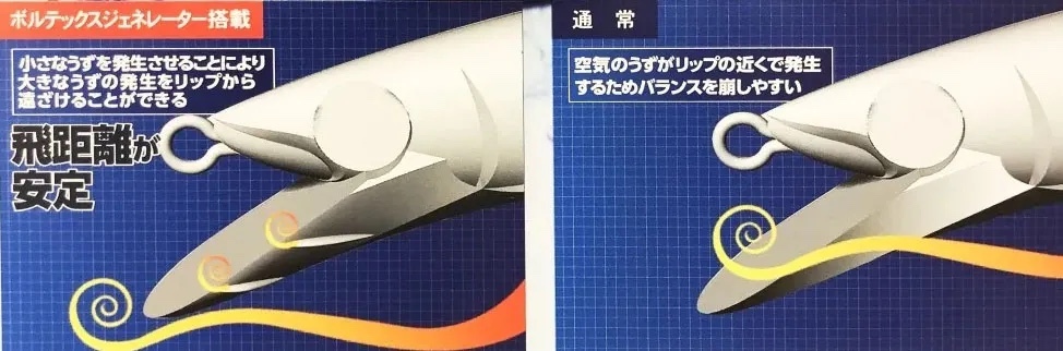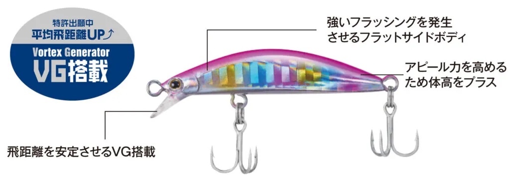 ボルテックスジェネレーターの恩恵は小型ミノーでも実感できます。細身の小型ミノーながら安定した飛距離を獲得。フラットサイドデザインによってメリハリの効いたフラッシングを発生し、水押しの強さとの兼ね合いで、サイズ感以上のアピール力を発揮します。メバル・カマス・メッキ・セイゴ等々幅広いターゲットに対応し、ライトゲーム全般をカバー。1ランク上の『使いやすい』が体感できる小型ミノーです。