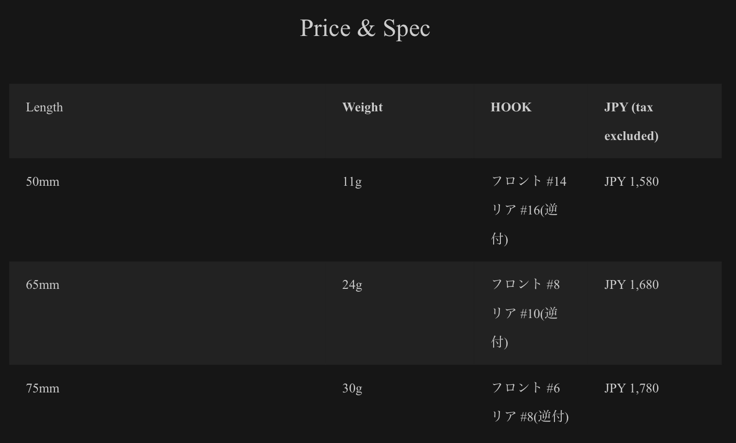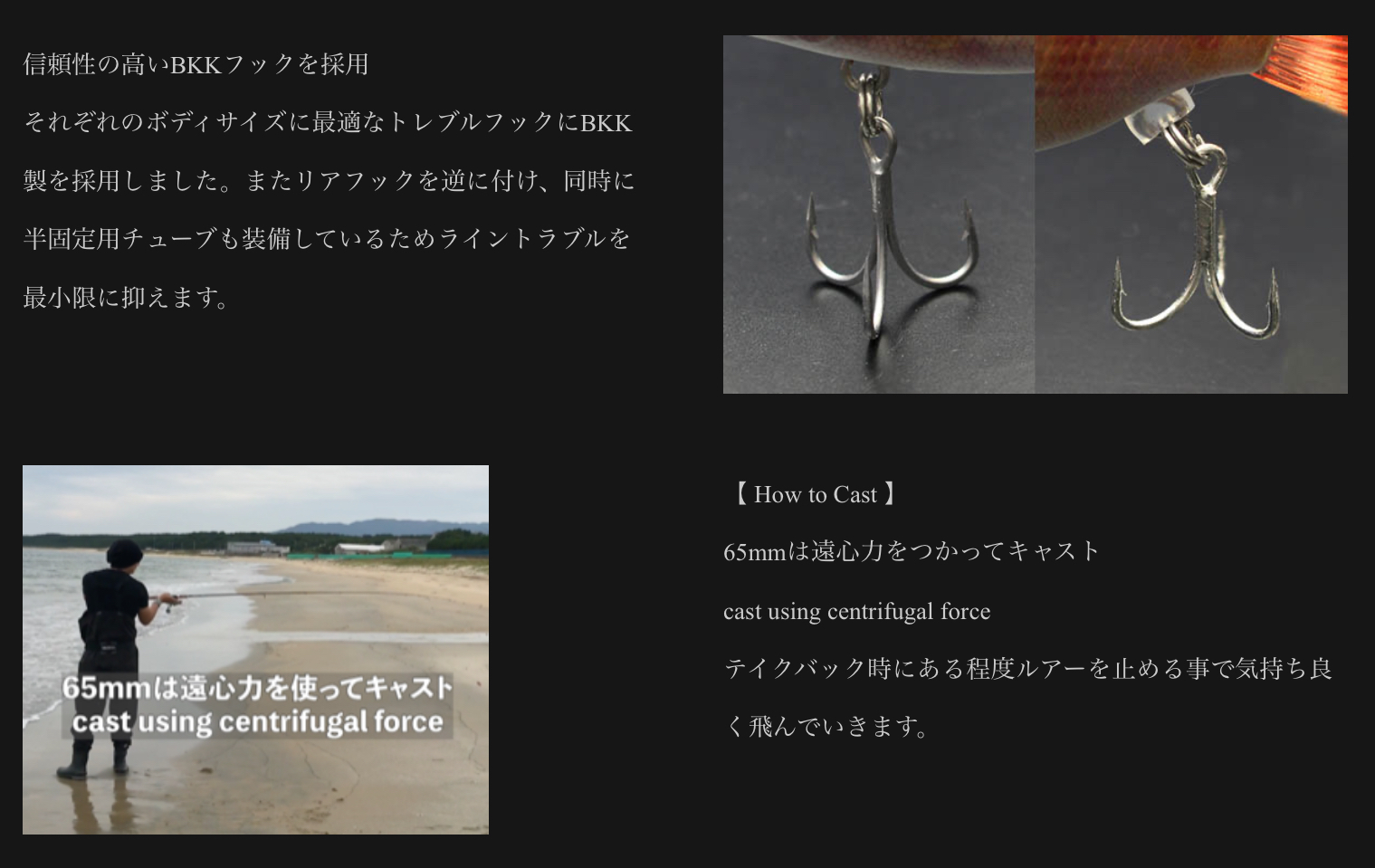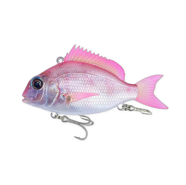 通常の使用はもちろん、チャリコの泳がせ釣りで青物やフラットフィッシュ、シーバスが狙える状況、ヒイラギなどの体高がある魚がベイトの状況でよりターゲットにアプローチします。養殖場から逃げたタイを巨大なシーバスや青物が捕食する話、泳がせ釣りでの確かな釣果などからチャリコムの開発を着手。チャリコのシルエットを徹底定期に再現し、バイブレーションとしてのアクションも追求しました。各種ヒレはソフト素材で再現。また顔やフォルム、場所による鱗目の大きさなど造形にこだわり抜き、リアルに作り込んでいます。フックはささりと強度に定評のあるBKKフックを採用。内部も骨形状にリブを張り巡らし、強度も確保しています。