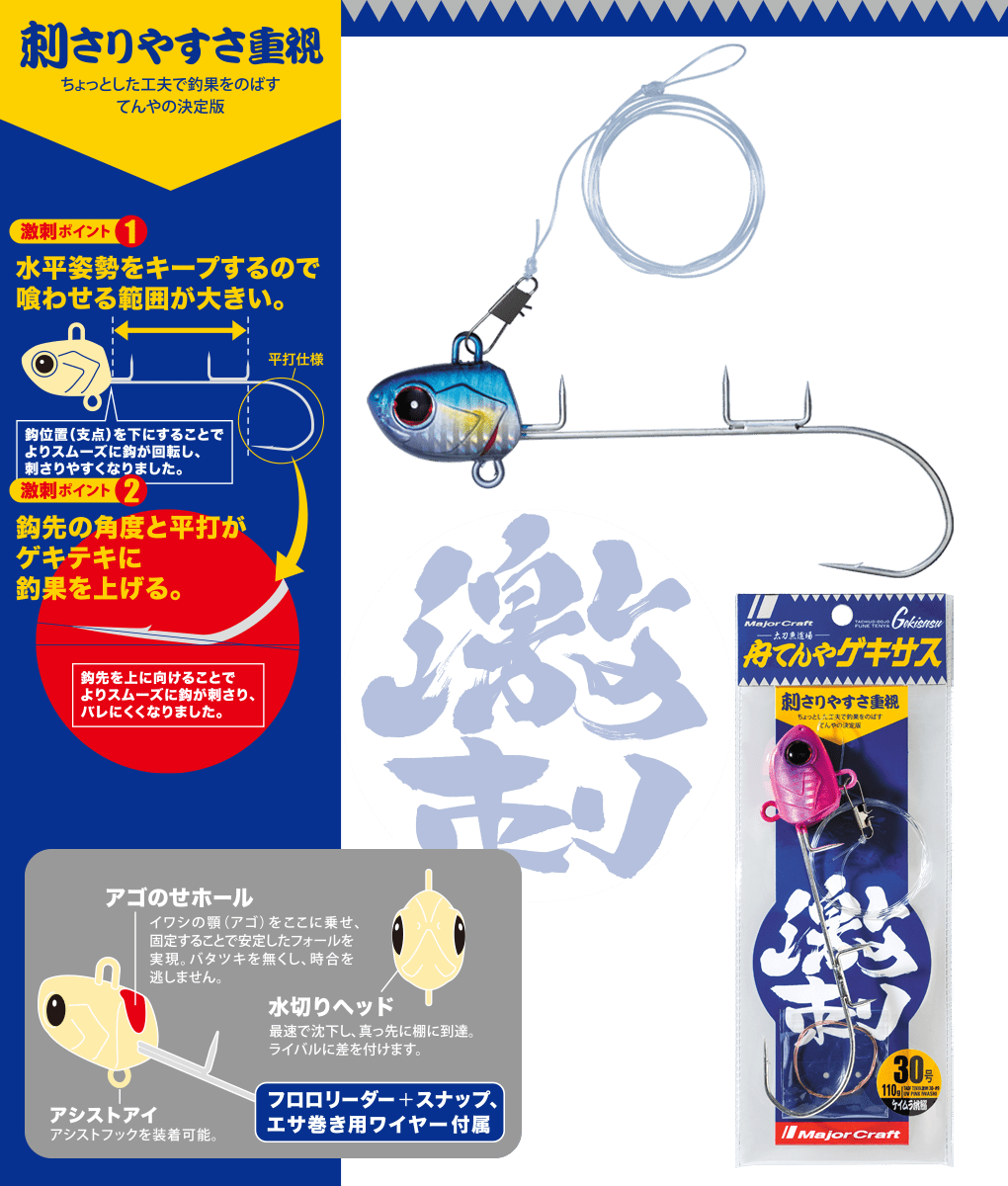 と言いたいのですが、完全にこの釣りにハマった社員の企画が商品化されました。餌のイワシをテンヤに巻いて、船長の指示棚に落とし込んで誘うだけで、あの美味しく調理簡単な太刀魚が釣れてしまう…釣り入門者や女性にオススメな釣りですが、ハマれば奥が深く抜け出せなくのが「太刀魚テンヤゲーム」。より簡単に、より沢山釣れるように工夫されたヘッド形状は、水中での安定性を重視のバランス設計。ラインアイ形状は、合わせた時に瞬時にヘッドが上を向くように工夫しているので針掛かり抜群。随所にこだわりを込めた「太刀魚道場」で舟テンヤゲームの黒帯を目指して頂きたい。