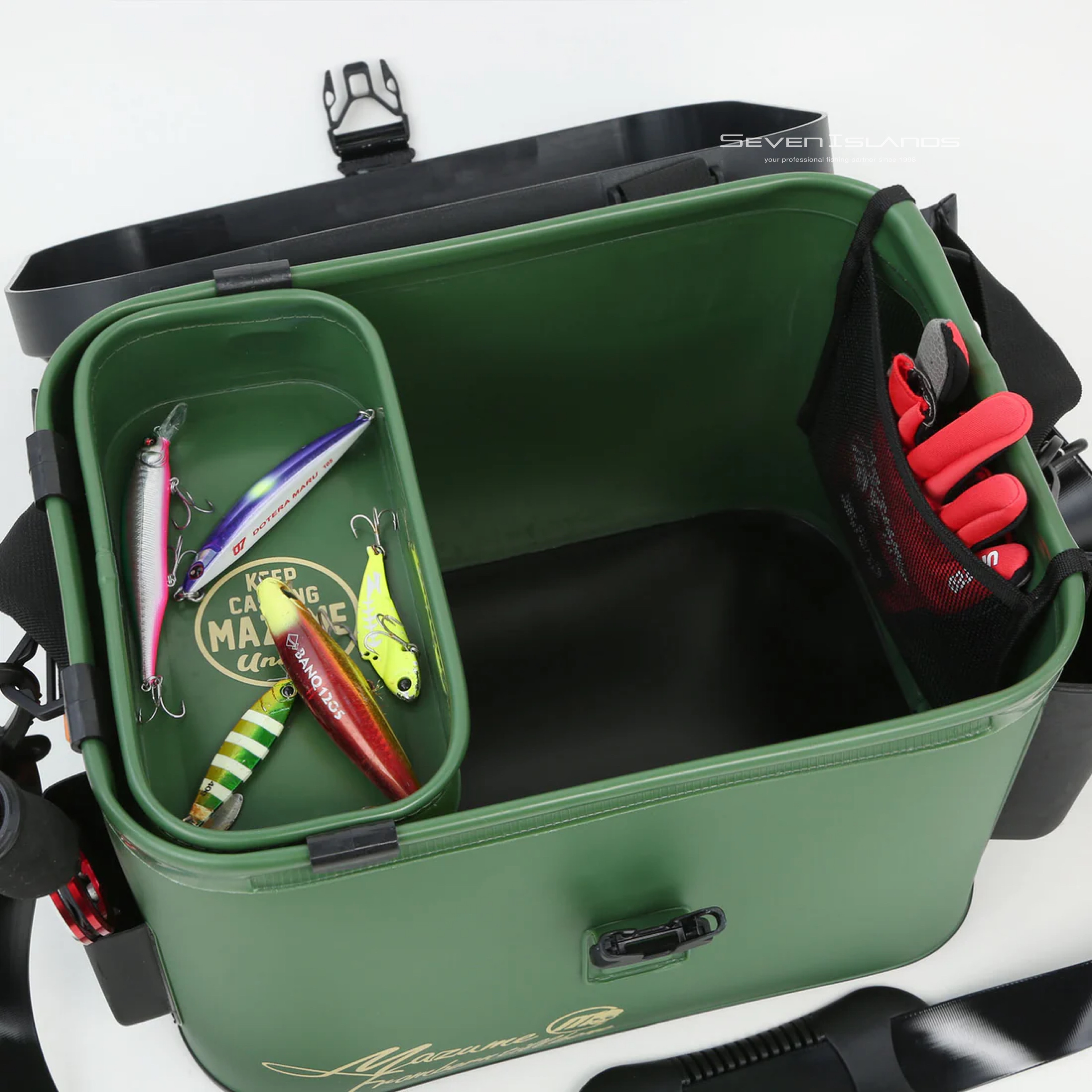 反対側には頻繁に使うハサミ、プライヤー、フィッシュグリップや魚バサミ等を収納できるサイドポケット付き。