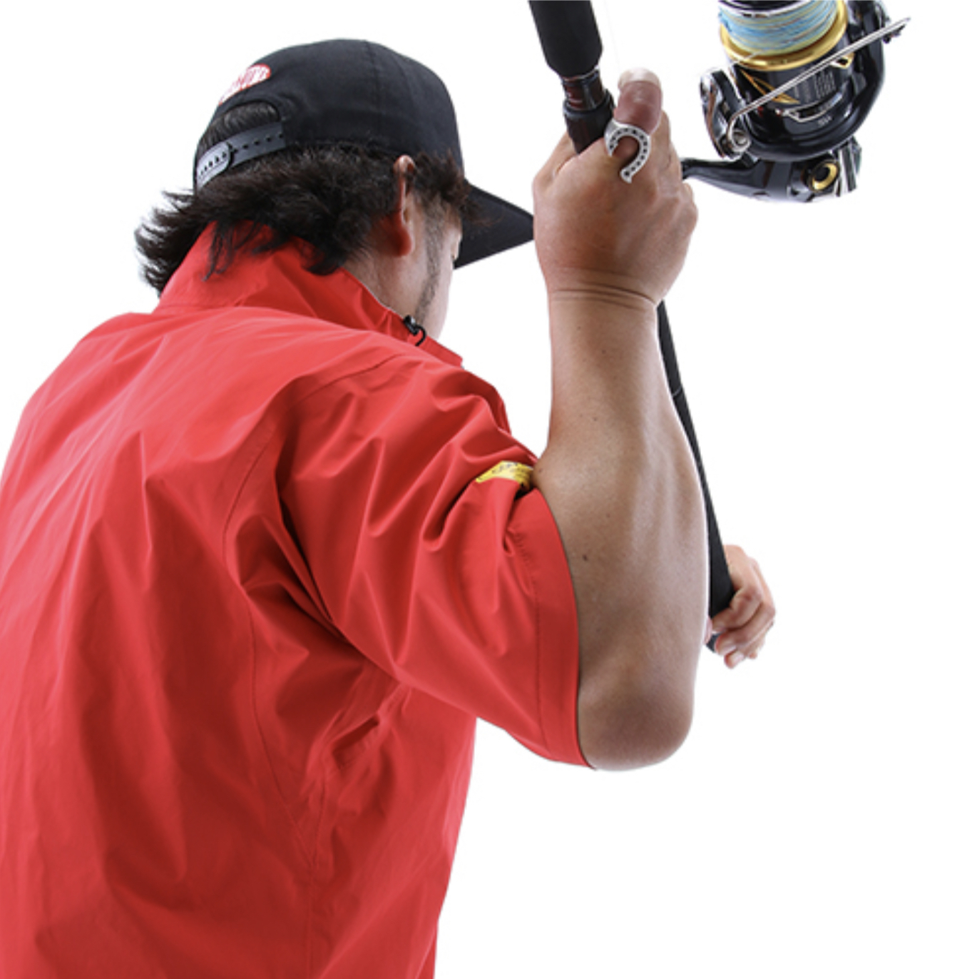 夏場の蒸し暑く、ロングスリーブのレインジャケットを着ていられない状況でどうすれば快適に釣りができるのかを最優先に考え、不要なパーツをなくして身軽さを追求したアイテムです。