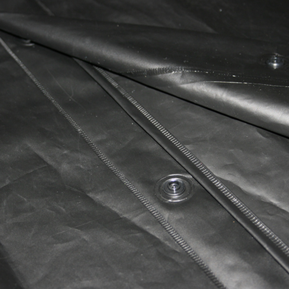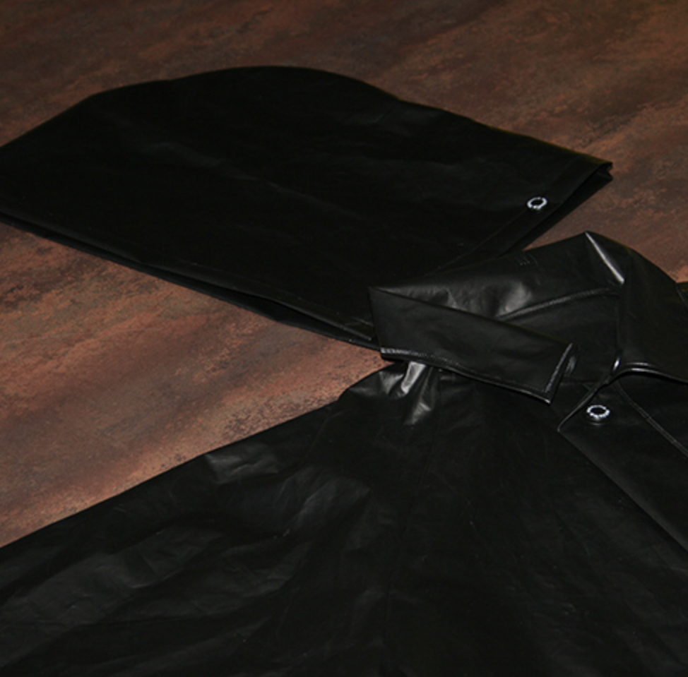 腕まわりのカッティングはキャストやロッドアクションがしやすいようにゆとりをもたせ、丈はヒザまで隠れる長さにしました(ニーブーツを履けば濡れるところがありません)。フロントはボタンの数を多くし、ボタンとボタンの間から雨水が入ってこないようにするため、生地に折り返しを作りました。取り外しが可能なフードは、キャップを被ることを想定して深めにデザインしています。