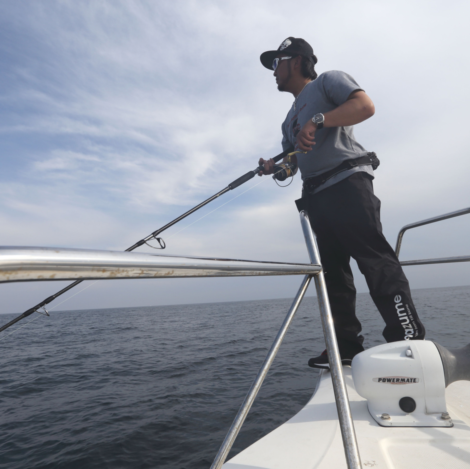 相模湾のキハダゲームであれば、ショートパンツにプルオーバー。春マサ狙いにはオフショアパンツにレインジャケットというのが一例です。