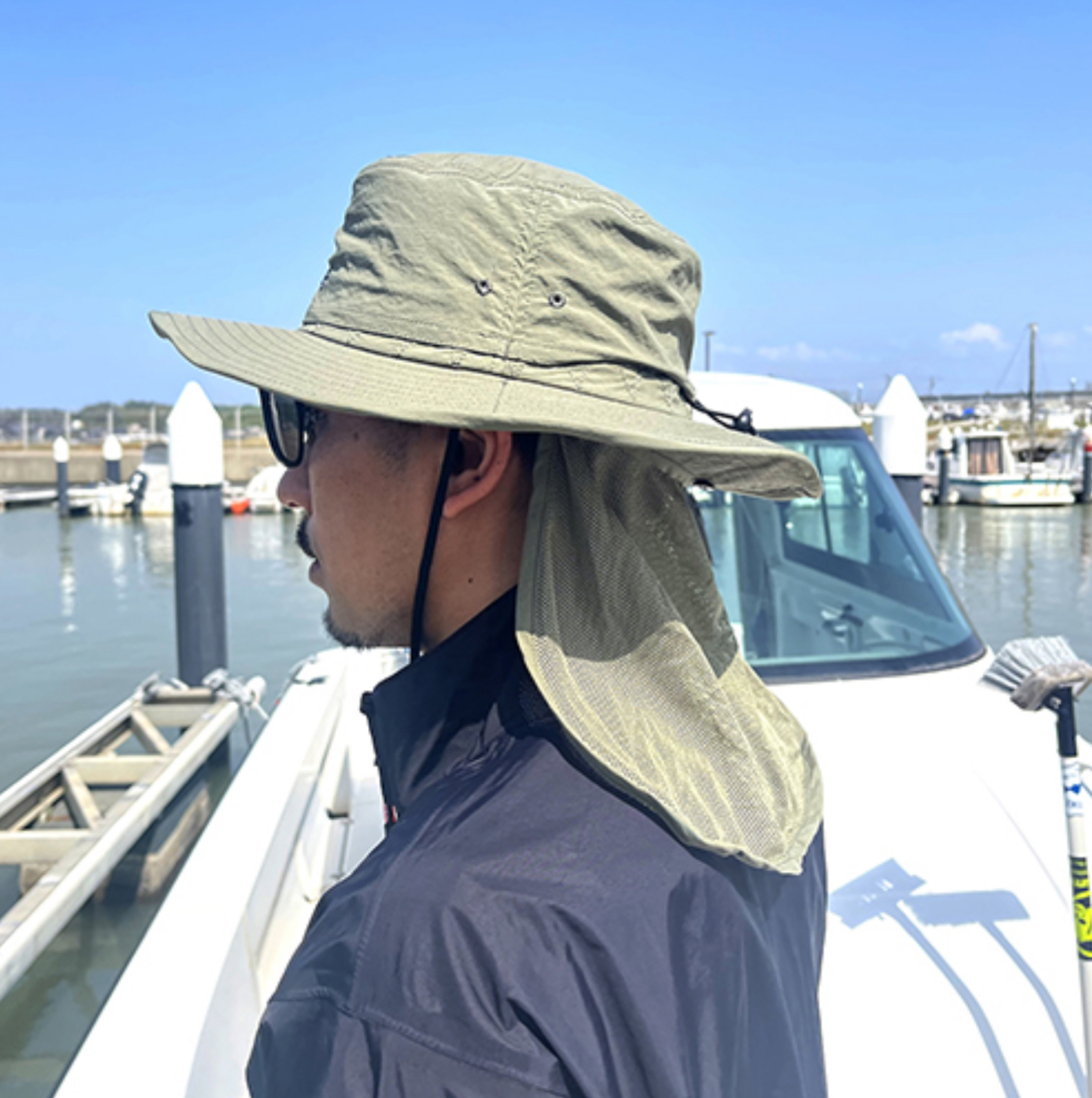 撥水素材を使用しているので雨をしのぐことができ、釣りに必要な広い視界、聴覚を確保します。