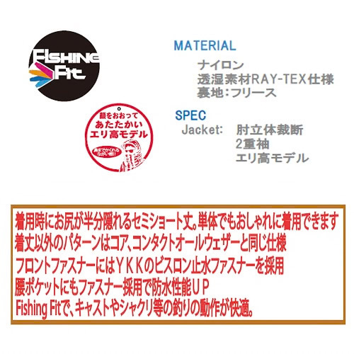 とにかく暖かいをコンセプトに、コア、コンタクトオールウェザースーツのジャケットと同様に、首はエリを高くして鼻まで隠れるようにし、顔の露出部分を減らして体感温度の低下を防ぎます。