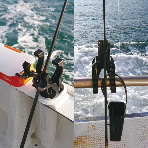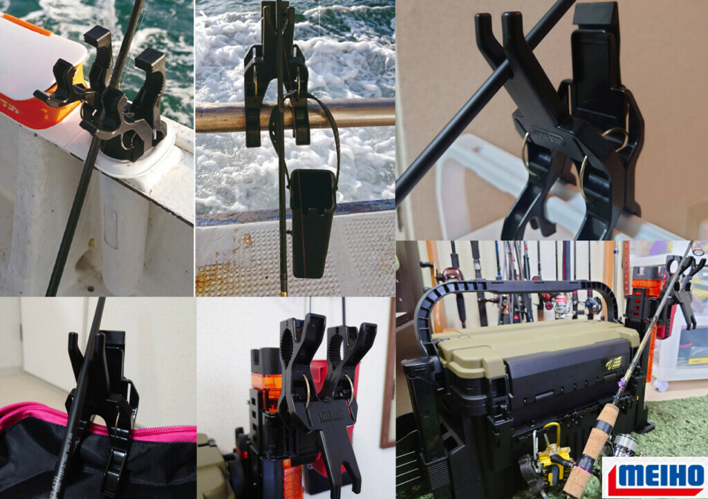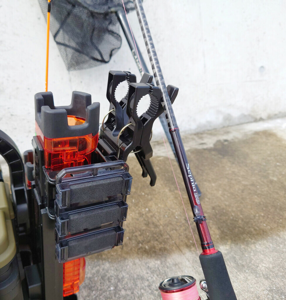 バケットマウスシリーズやランガンシステムBOXシリーズのオプションパーツ、マルチホルダーへ装着することで、竿掛けとして使用できる便利なクリップ。さらに船釣りでは、船べりのロッドホルダーや、パイプへ取り付けて、竿掛けとして使えたり、洗濯バサミのようにロッドを挟むことも可能です。ショア・オフショア問わずマルチに活躍する便利クリップです。