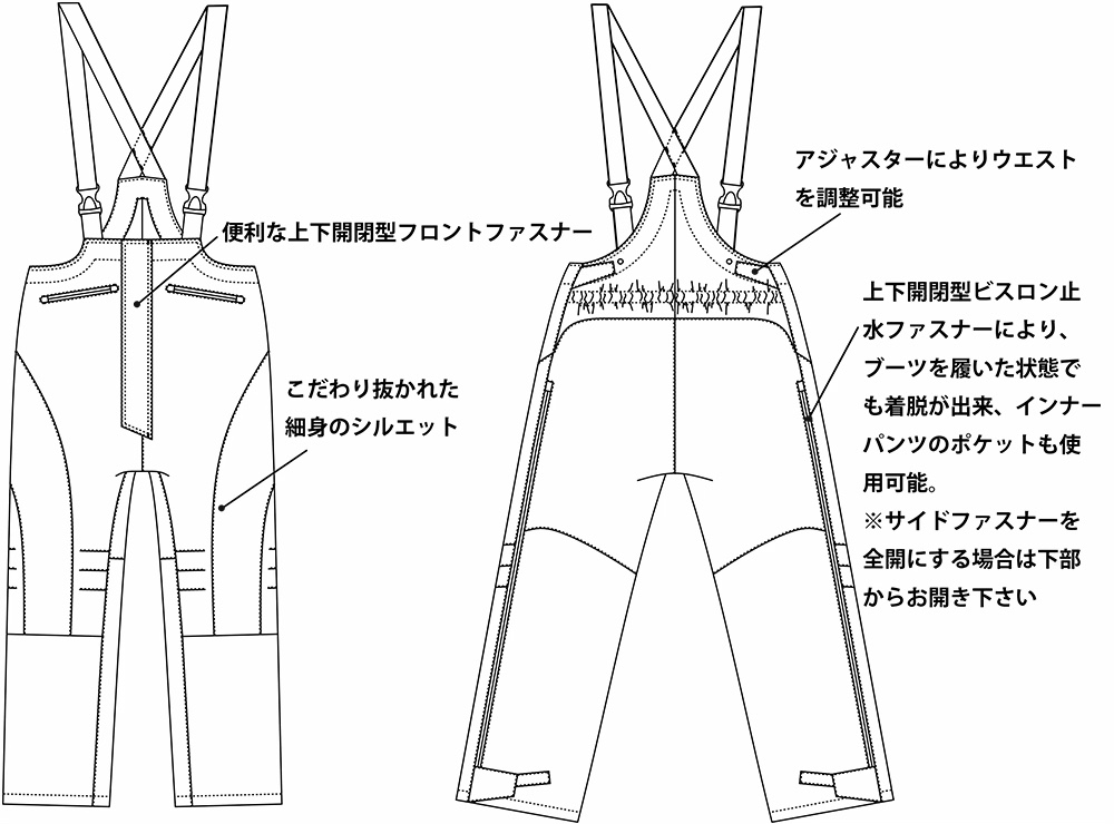 素材には耐摩耗性、透湿防水性が優れた生地を採用。現在のアウトドア用ビブ、そして釣り用レインパンツを徹底的に見直し、こだわりぬいたシルエットは履いてみれば一目瞭然。一見スリムに見えますが,履いてみると臀部から大腿部には程よくゆとりがあり、膝下からはテーパードされた細身のシルエット。さまざまな防寒インナーパンツにマッチします。サイド部のロングビスロン止水ファスナーはブーツを履いた状態でも脱ぎ履きを可能にし,上部ファスナーの開閉によりベンチレーションとしての機能とインナーウエアーのポケットから物の出し入れが可能です。センターファスナーも上下両方からの開閉が可能でウエストタイプの救命胴衣やオフショアベルト類を脱着しなくても用足しできます。まさにソルトウォーターアングラーの為のオールシーズン活躍するスタイリッシュなビブに仕上げました。
