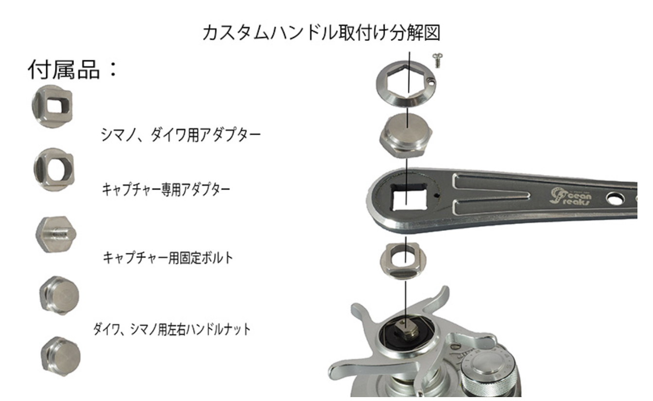 計3個を付CAPTCHAシリーズとシマノ社、ダイワ社の8mm×5mmサイズの袋ナットタイプに取り付けできるように、アダプターを2種、CAPTCHA用ボルト1個、8mm×5mm用ナット左右各1個を属しています!