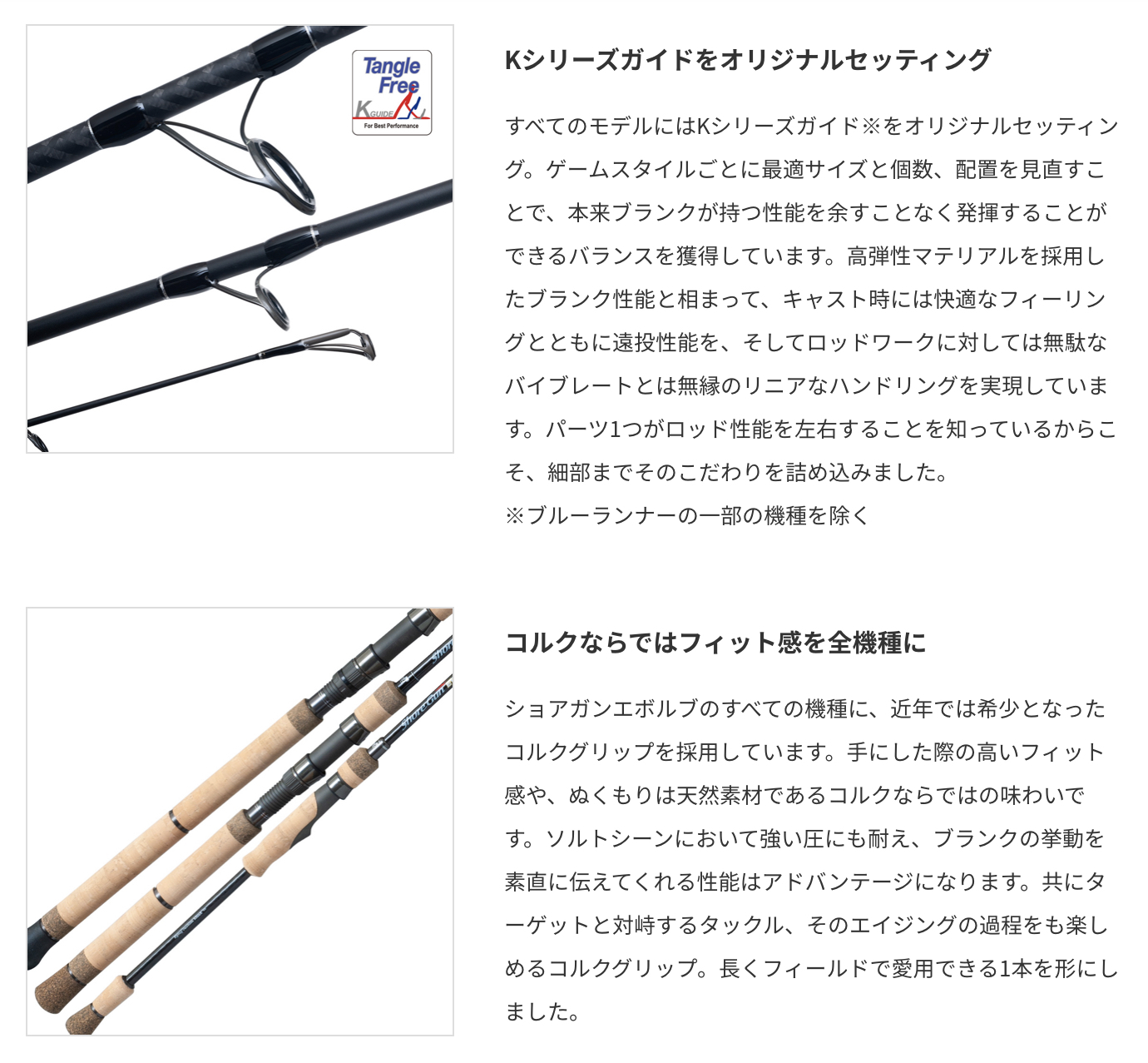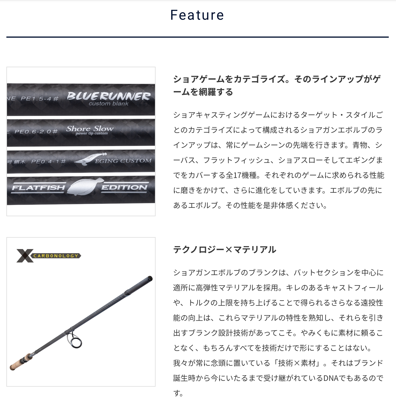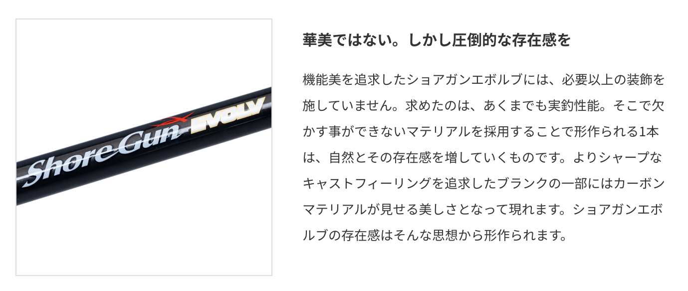シーバス、青物、ショアスロー、餌木、ヒラメ。ターゲットやタクティクスごとにカテゴライズされたショアキャスティングロッドシリーズとして、数々の実績を築き上げてきたショアガンエボルブが、2021年モデルチェンジして登場します。バットセクションのカーボン配置を見直し、よりシャープなキャストフィーリングを追求。一部機種ではハンドル形状の見直しや、ガイド位置の調整を行い、より高い実戦でのパフォーマンスを実現しました。コルクグリップならではの手に吸い付くような使用感。それはカーボンマテリアルの素材感を織り込んだ意匠とも相まって、永く釣りを共にできる1本に仕上がっています。華美ではない、あくまでも機能美としての存在感。 我々が求める“最良”を是非体感してください。