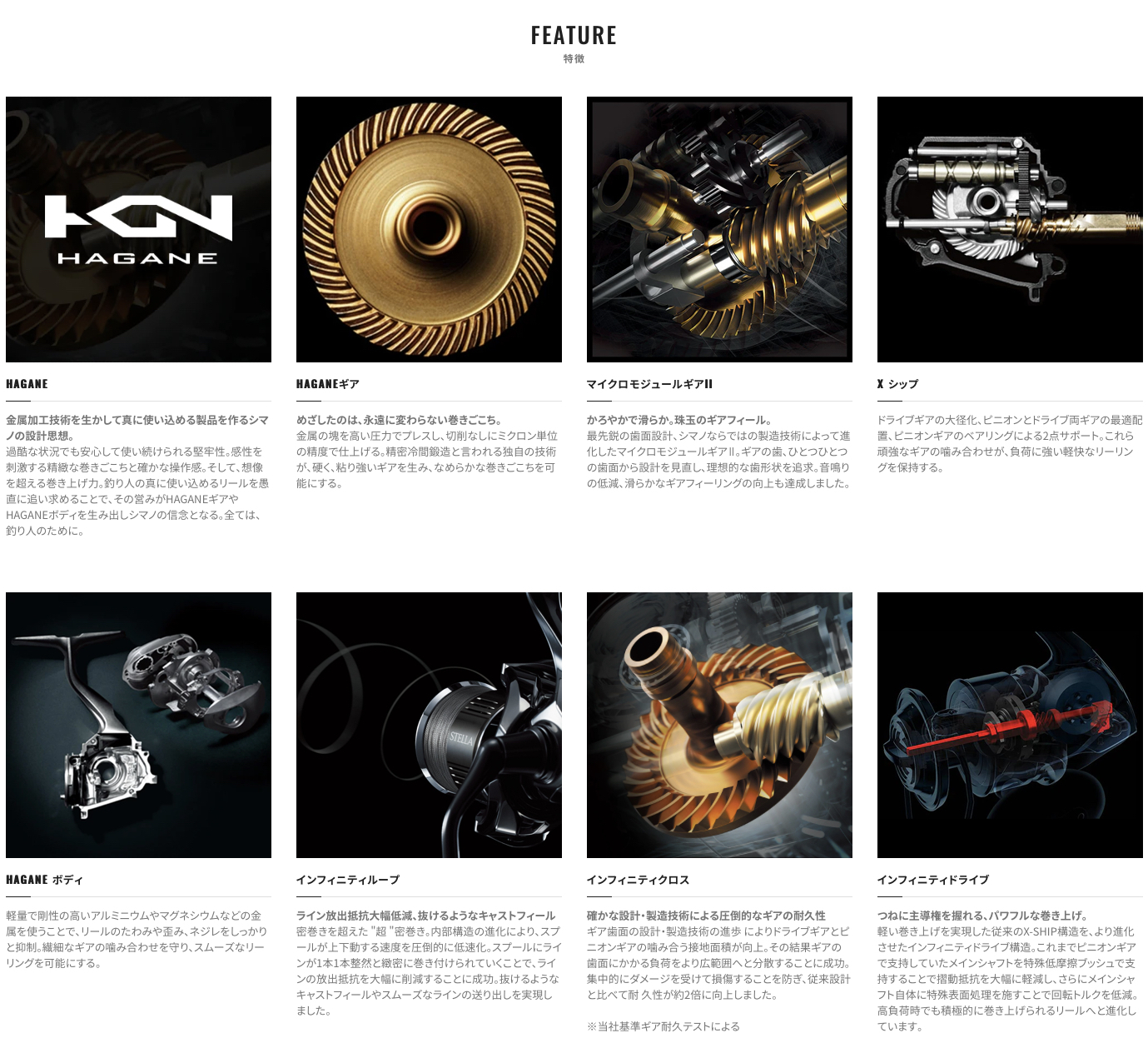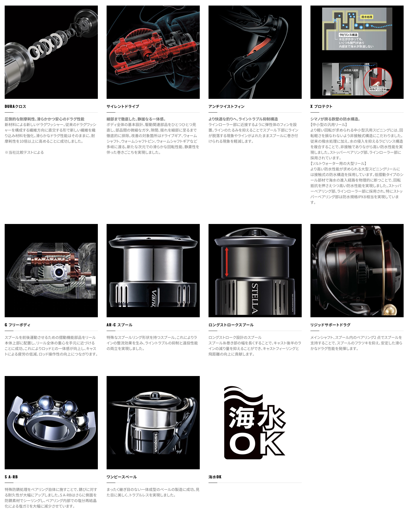 ギア歯面の設計・製造技術の進歩により実現した、高耐久ギア設計インフィニティクロス。ラインをより密に、整然とスプールへと巻き上げ、放出時の抵抗を軽減するインフィニティループ。高負荷時でもグイグイと軽快に巻き取れる特殊構造インフィニティドライブ。スピニングリールの頂に挑み続けてきたSTELLAが、3つのインフィニティ(無限大)を纏ってさらなる高みへと到達しました。スプール周りにおけるライントラブルを抑えるアンチツイストフィン、優れた耐摩耗性により滑らかなドラグ性能が持続するデュラクロスなど、細部に至るまで機能性を追求。最高峰の矜持がアングラーの手元で眩い輝きを放ちます。