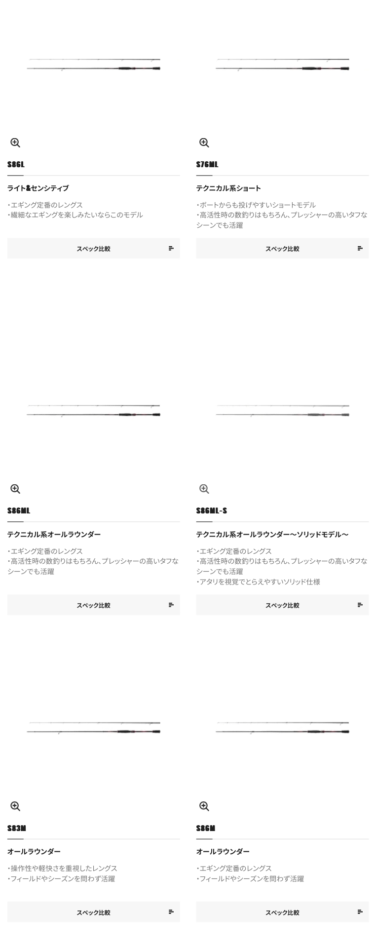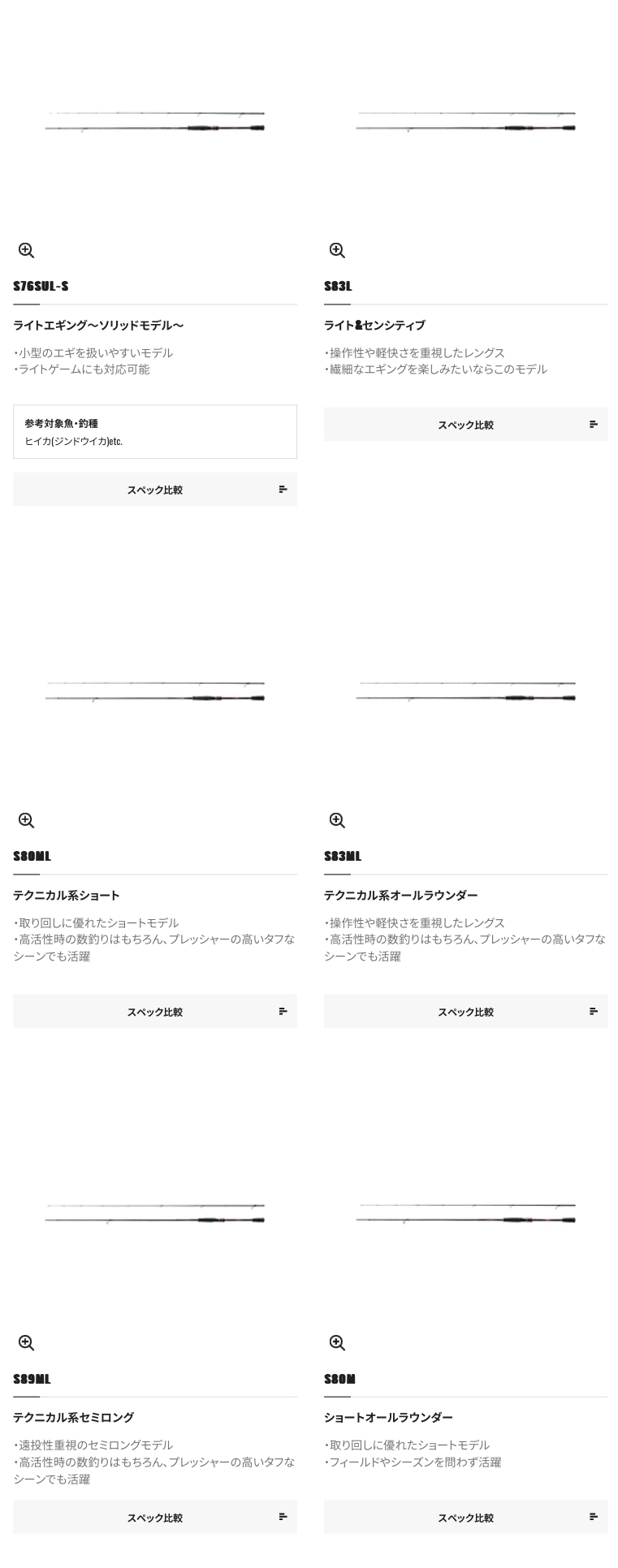 また、ソリッドティップ搭載モデルも含め、シリーズ全16アイテムをラインナップ。春の大型アオリイカ攻略から秋の繊細なサイトエギング、さらにボートエギング、あらゆるゲームに幅広く対応。76モデルは、エギだけでなくライトゲームも楽しむことが可能なバーサタイルな仕様。一本でマルチに展開したいアングラーにもマッチします。