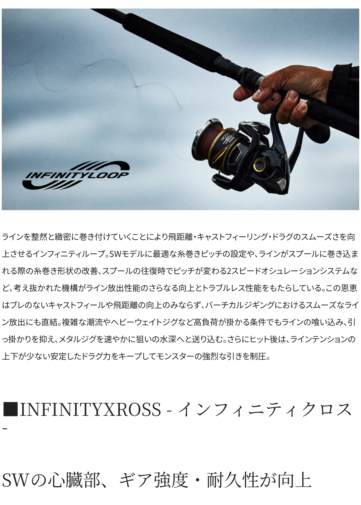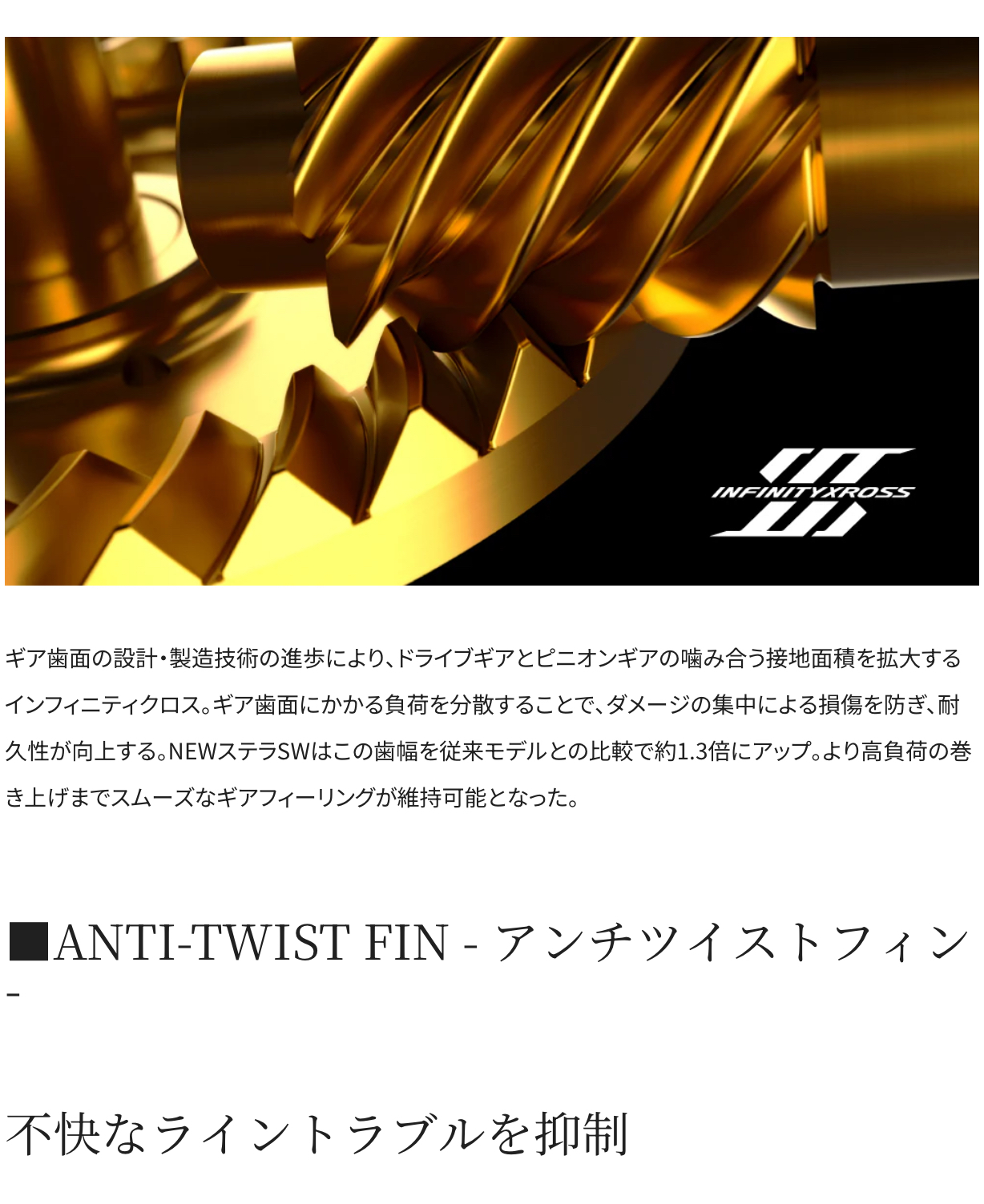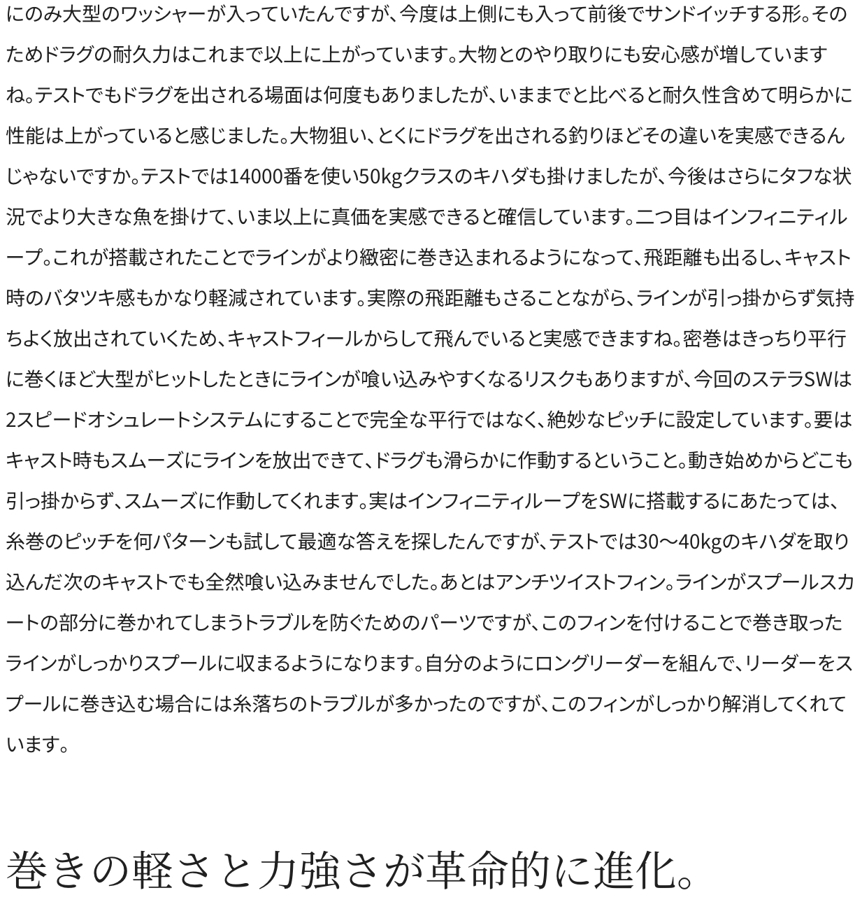 国内外で数多の実績をあげてきたステラSWが数々のテクノロジーとともにモデルチェンジ。XXタフドラグによるドラグ性能の向上、インフィニティループによるキャスタビリティの向上、インフィニティクロスによるギア強度・耐久性の向上、アンチツイストフィンによるライントラブルの防止など、さらなるアドバンテージをプラス。また、ハンドルノブへの防水シールの追加、ドラグノブの大径化など細部に至るまでブラッシュアップ。ソルトウォーターシーンで大物と真っ向から対峙するための性能にさらなる磨きをかけ、新生ステラSWが解き放たれる。