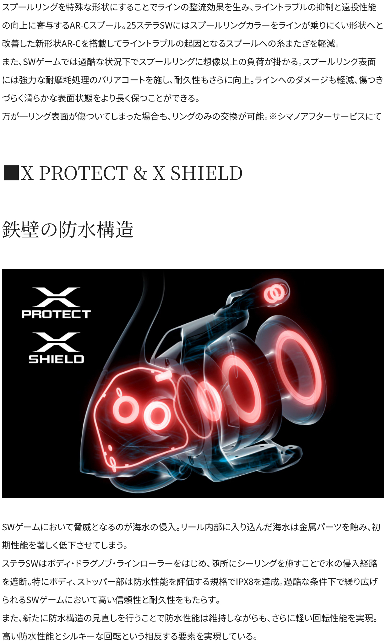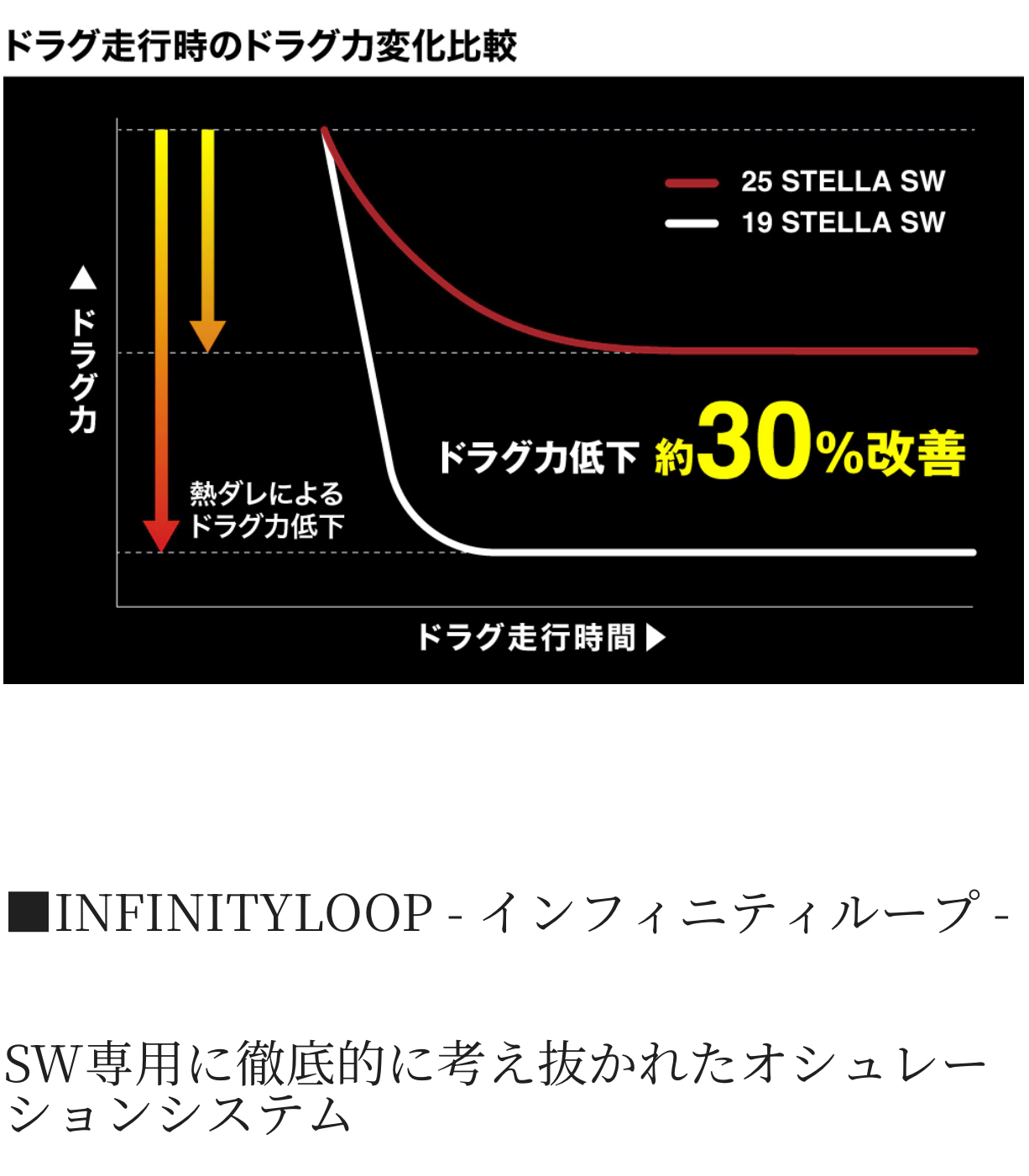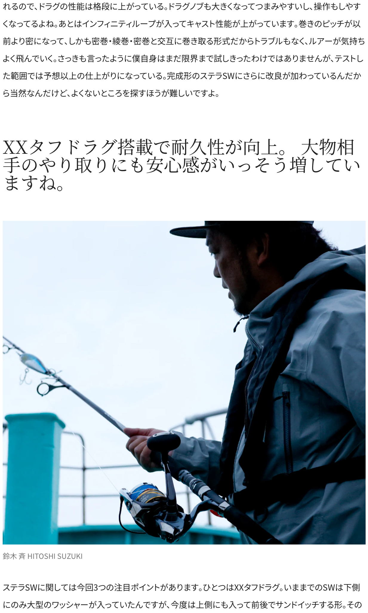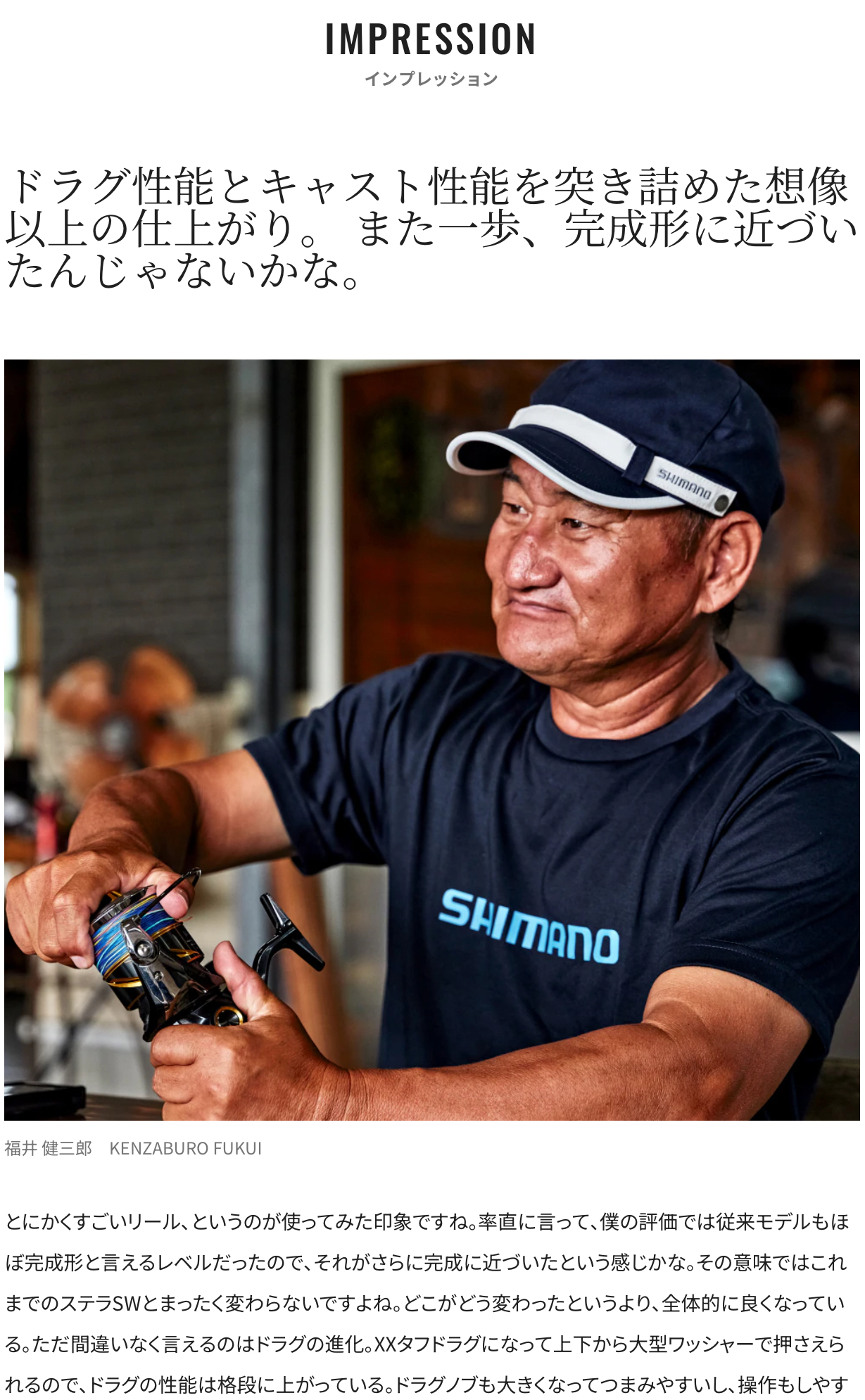 国内外で数多の実績をあげてきたステラSWが数々のテクノロジーとともにモデルチェンジ。XXタフドラグによるドラグ性能の向上、インフィニティループによるキャスタビリティの向上、インフィニティクロスによるギア強度・耐久性の向上、アンチツイストフィンによるライントラブルの防止など、さらなるアドバンテージをプラス。また、ハンドルノブへの防水シールの追加、ドラグノブの大径化など細部に至るまでブラッシュアップ。ソルトウォーターシーンで大物と真っ向から対峙するための性能にさらなる磨きをかけ、新生ステラSWが解き放たれる。