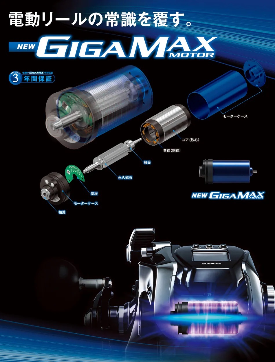 ※GIGA-MAX MOTORを搭載したリールでは、性能を充分に発揮させるためにも大容量バッテリー(電動丸10Ah)の使用をおすすめします。