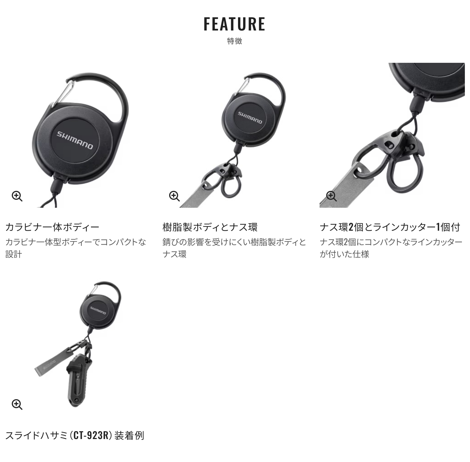 カラビナ一体型のコンパクトなカラビナリール、ラインカッター付きカラビナ一体型のコンパクトボディー、樹脂製ボディーで錆にも強いのが特徴です。コンパクトなラインカッターを装備、ナスカン2個付きで複数のアイテム搭載可能 。
