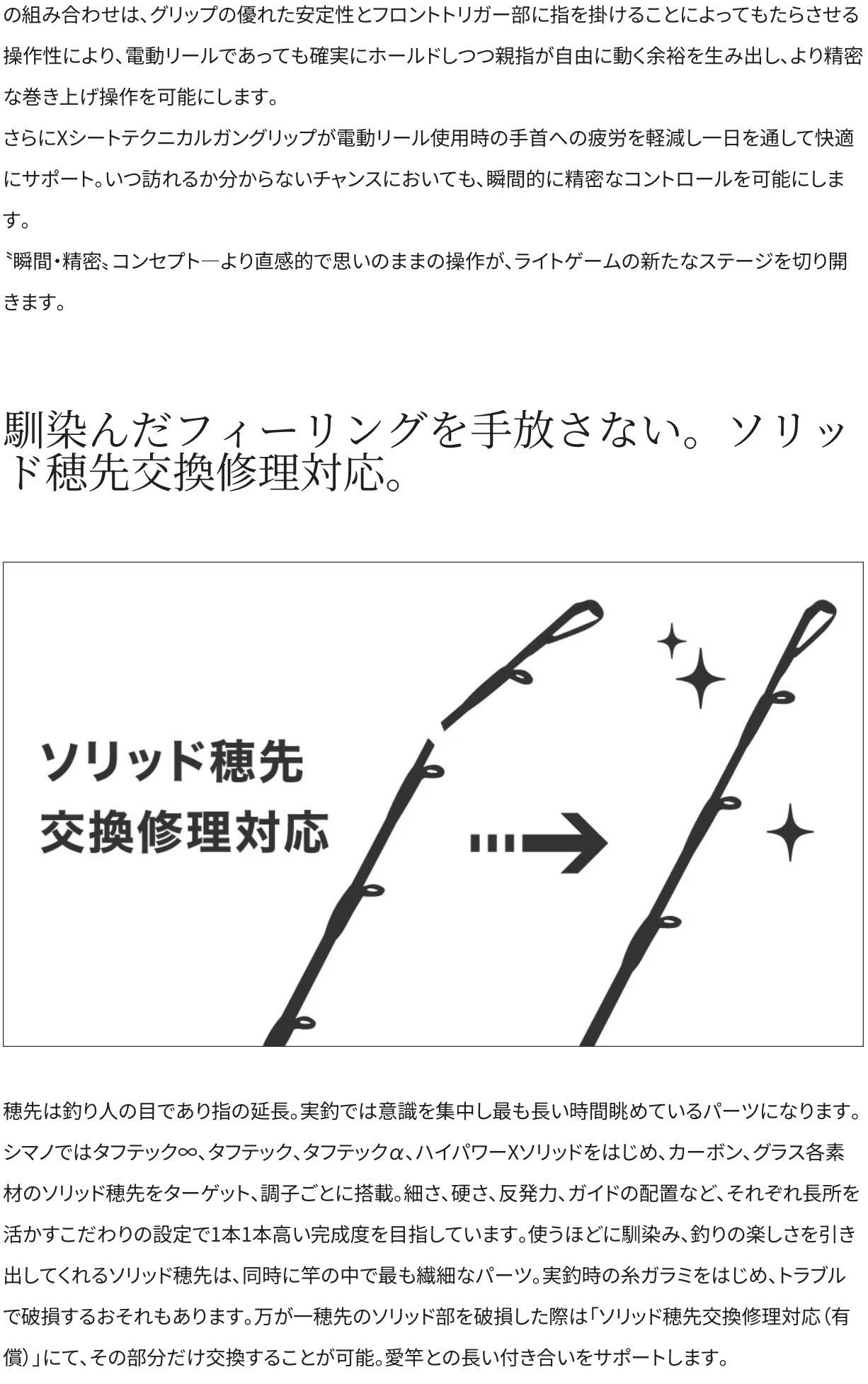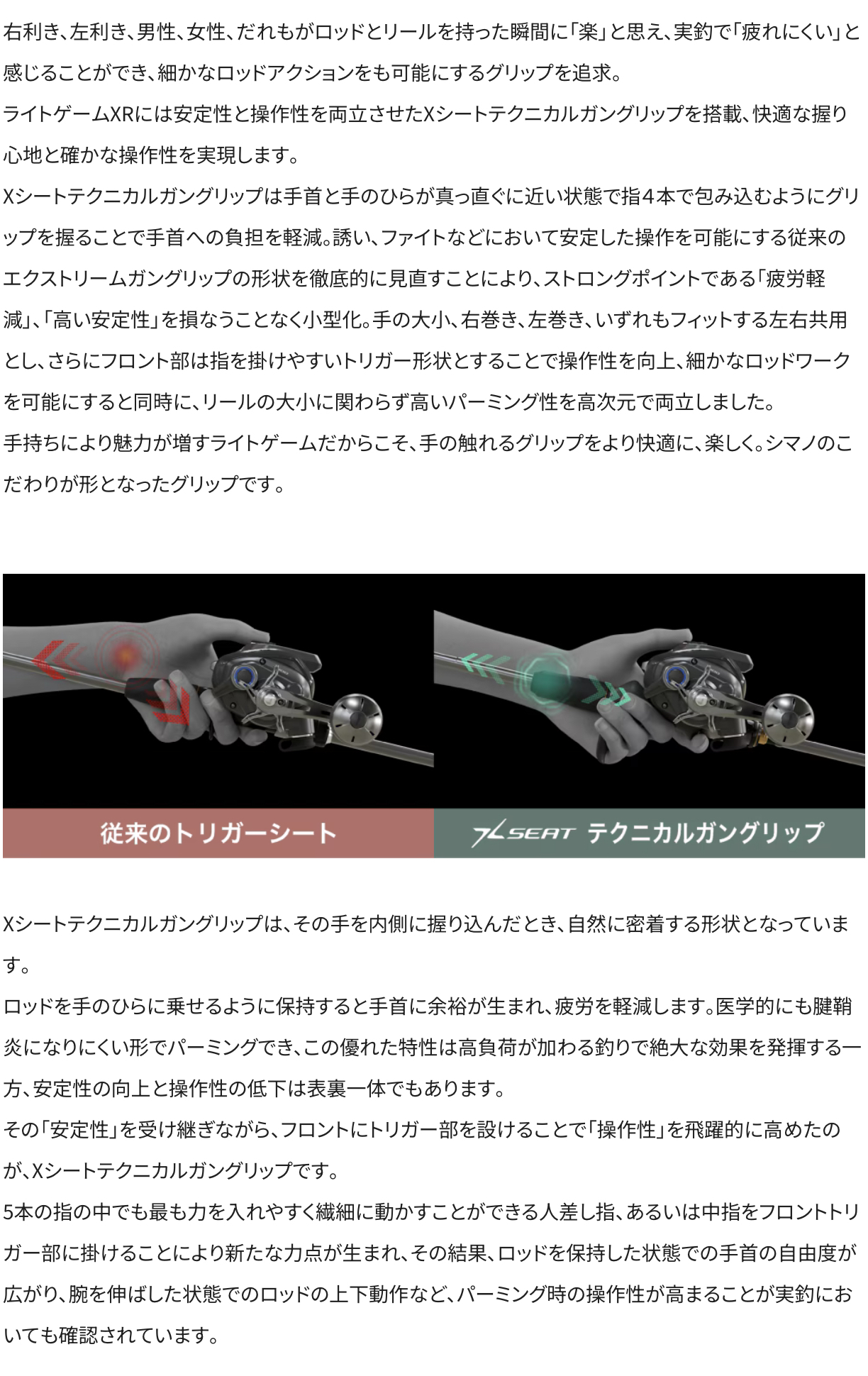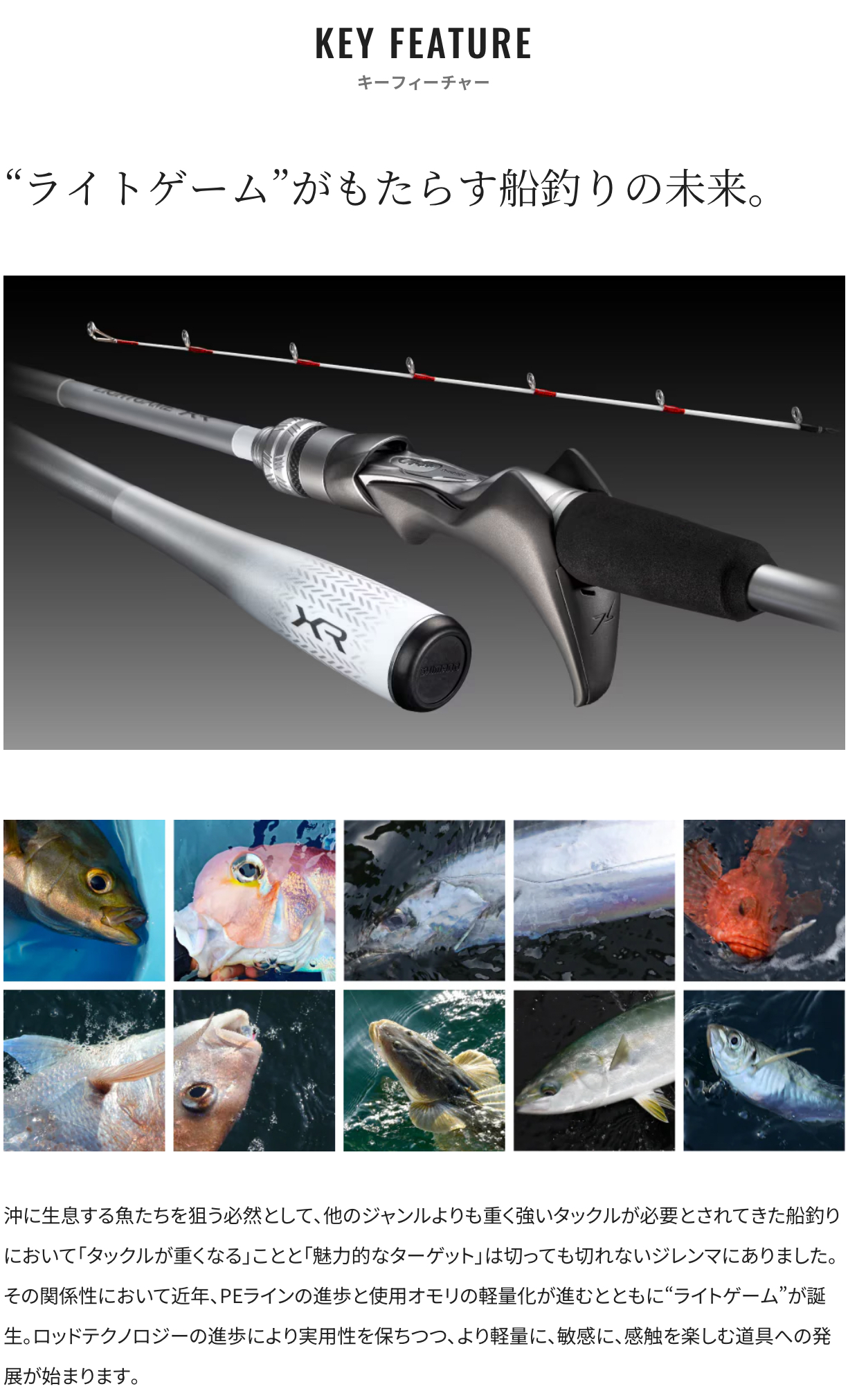 シマノの誇る先端技術をまとったライトゲームXR。本体の基本構造には軽量・高強度を実現するスパイラルXコアを採用。そしてカーボンモノコックグリップの新規採用により、シマノの高感度カーボン穂先タフテック∞が捉えた情報を増幅し海中の状況を明確に伝えます。加えてリールシートには、フロント部にトリガーを設けたXシート テクニカルガングリップを導入。高いパーミング性能により、軽快かつ繊細な誘い操作とファイト時の安定感が向上しました。ライトゲームXRとともに、船釣りをより深く、より緻密に。