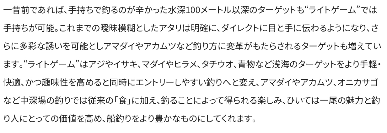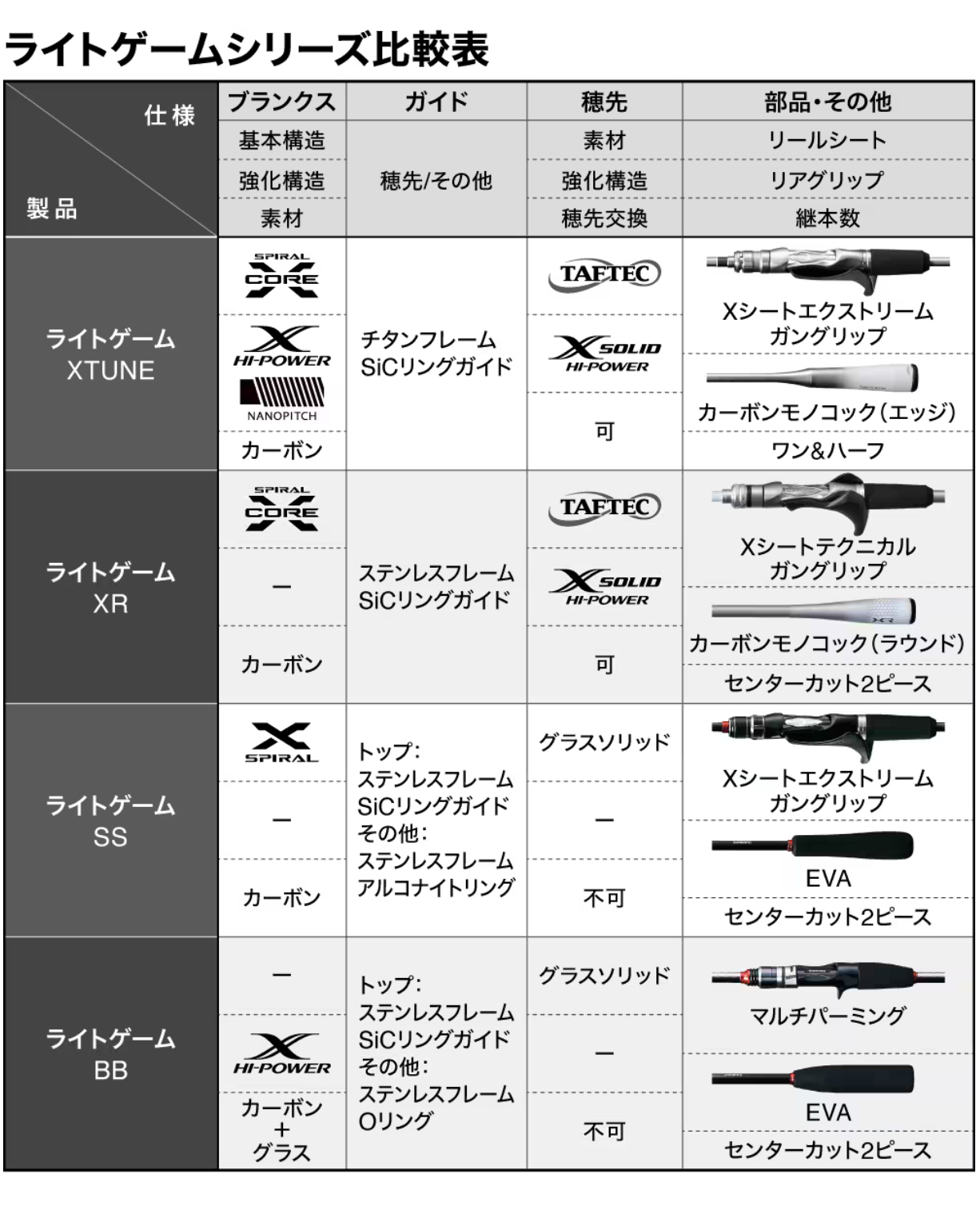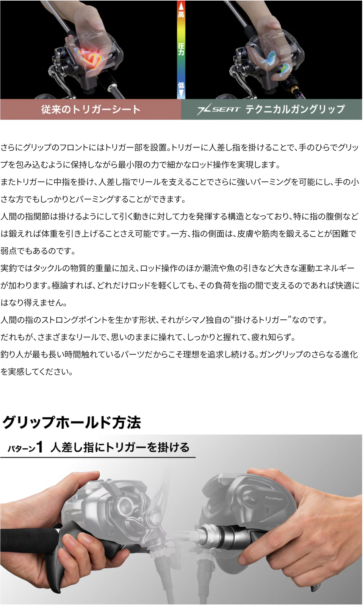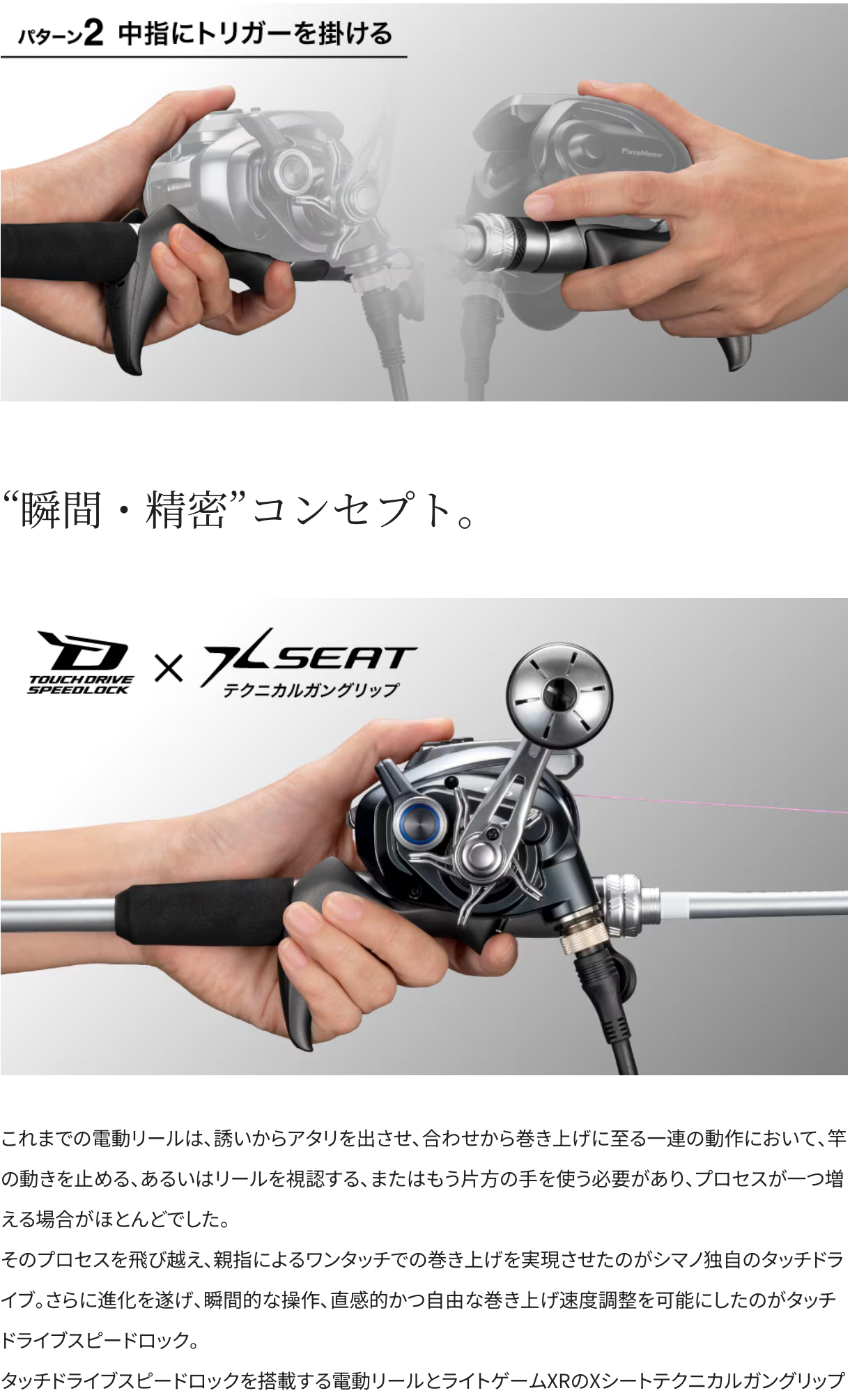 シマノの誇る先端技術をまとったライトゲームXR。本体の基本構造には軽量・高強度を実現するスパイラルXコアを採用。そしてカーボンモノコックグリップの新規採用により、シマノの高感度カーボン穂先タフテック∞が捉えた情報を増幅し海中の状況を明確に伝えます。加えてリールシートには、フロント部にトリガーを設けたXシート テクニカルガングリップを導入。高いパーミング性能により、軽快かつ繊細な誘い操作とファイト時の安定感が向上しました。ライトゲームXRとともに、船釣りをより深く、より緻密に。