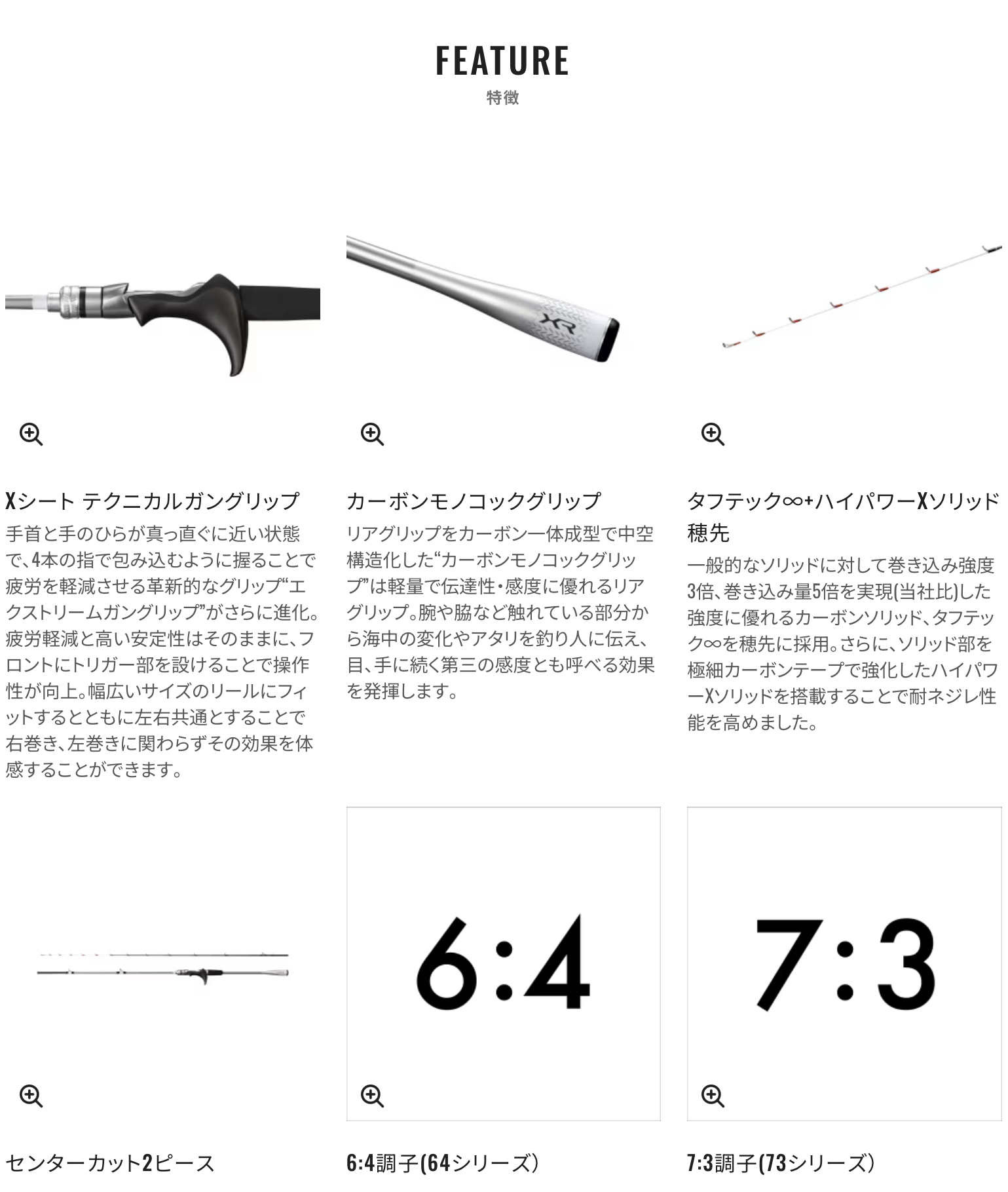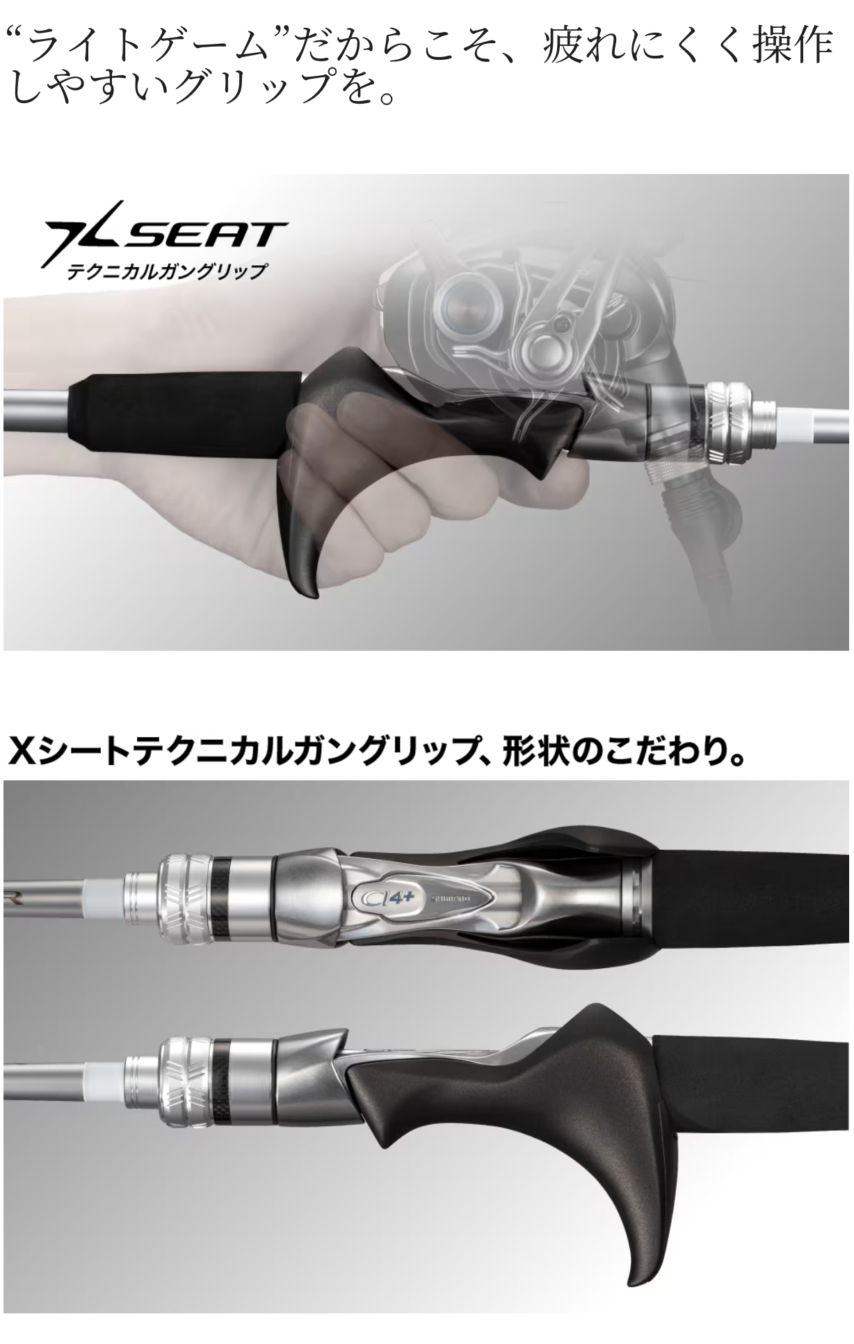 カーボンモノコックグリップ+Xシートテクニカルガングリップ搭載の高性能ゲームロッド。その感度と操作性は、価値ある一匹を手にするために。