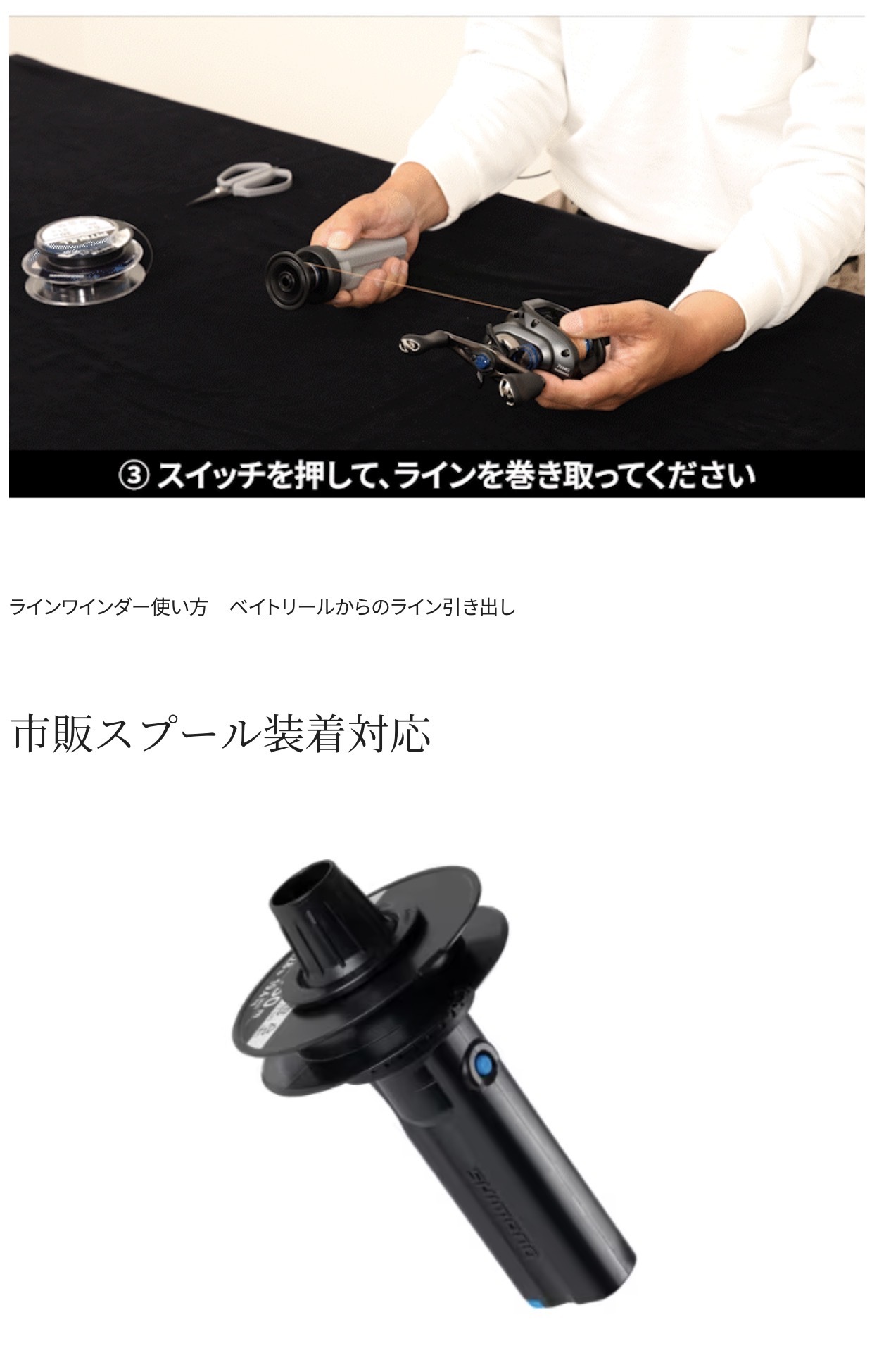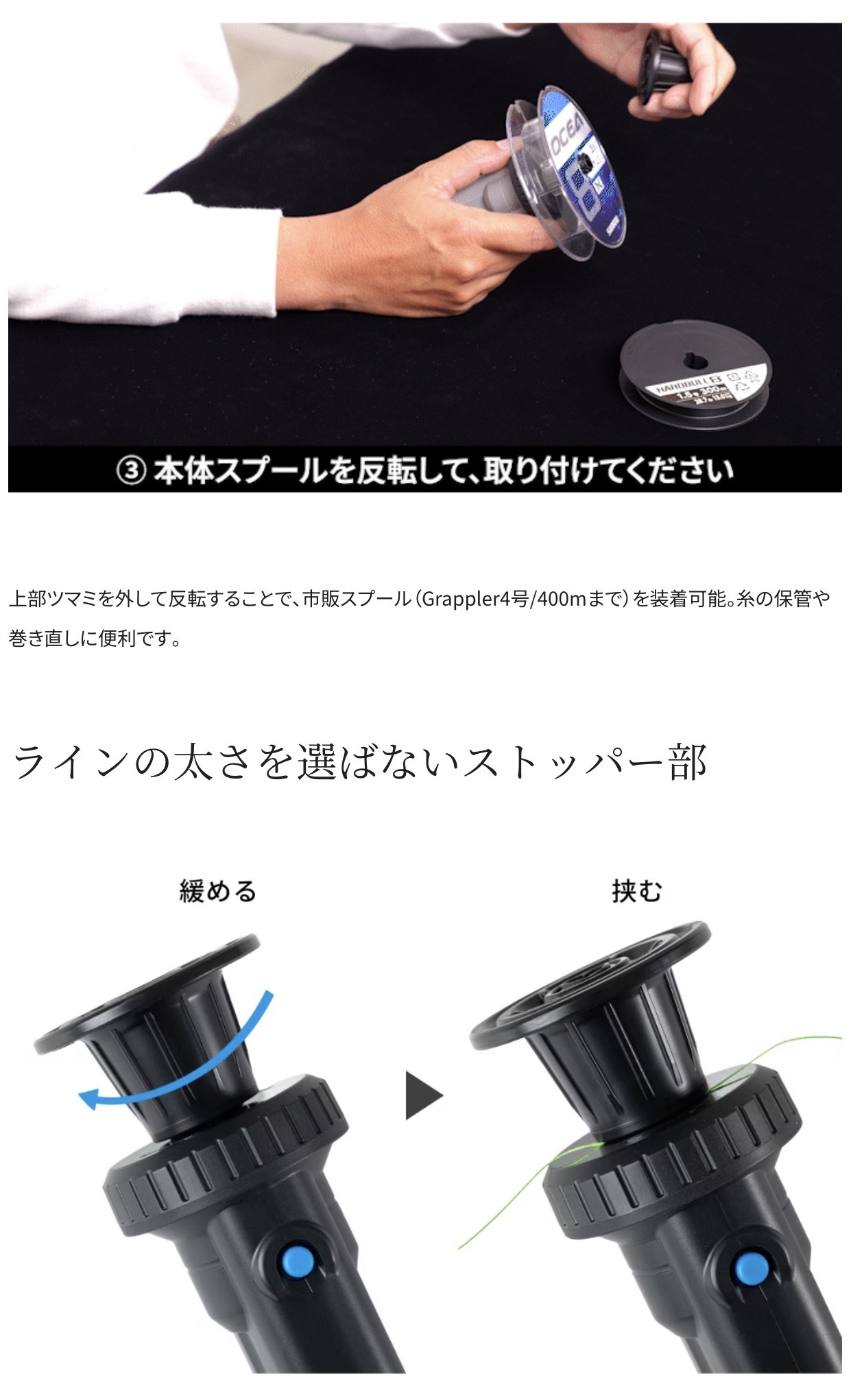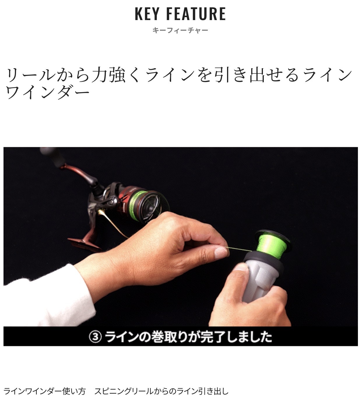 ナイロンやフロロカーボンはもちろん、PEラインもスムーズに引き出せるラインワインダー。引き出したラインはまとまりやすく、廃棄が簡単です。さらに、市販スプールを装着すれば、ラインの巻き取りや保管にも対応します。