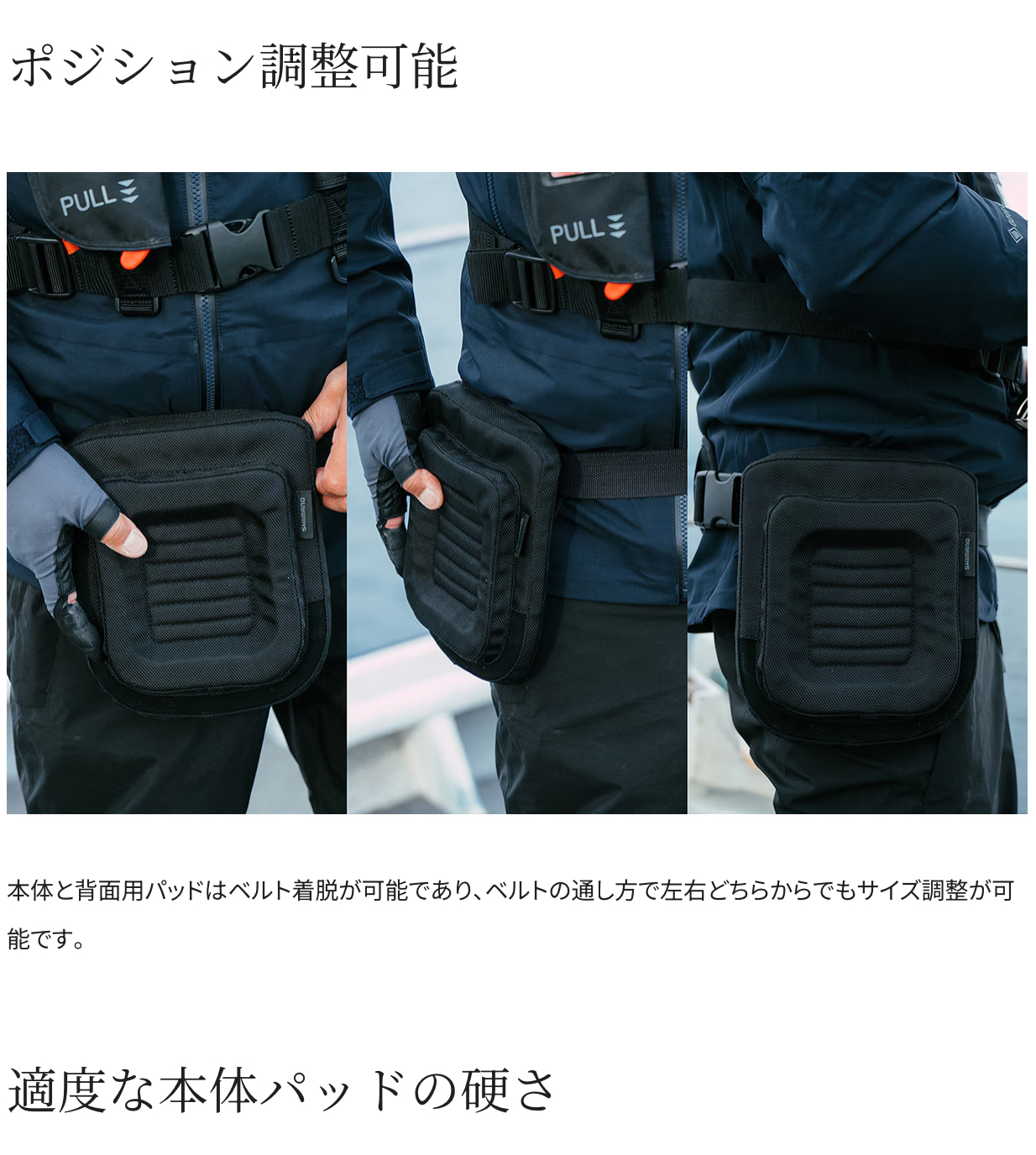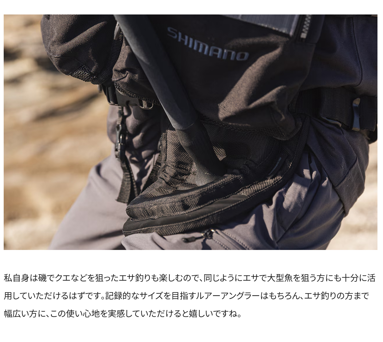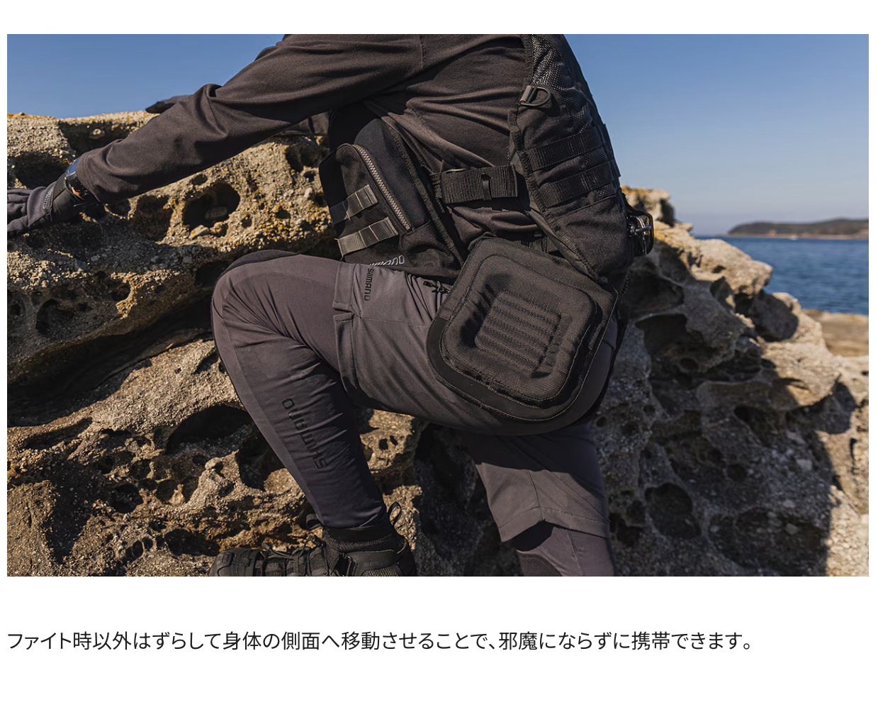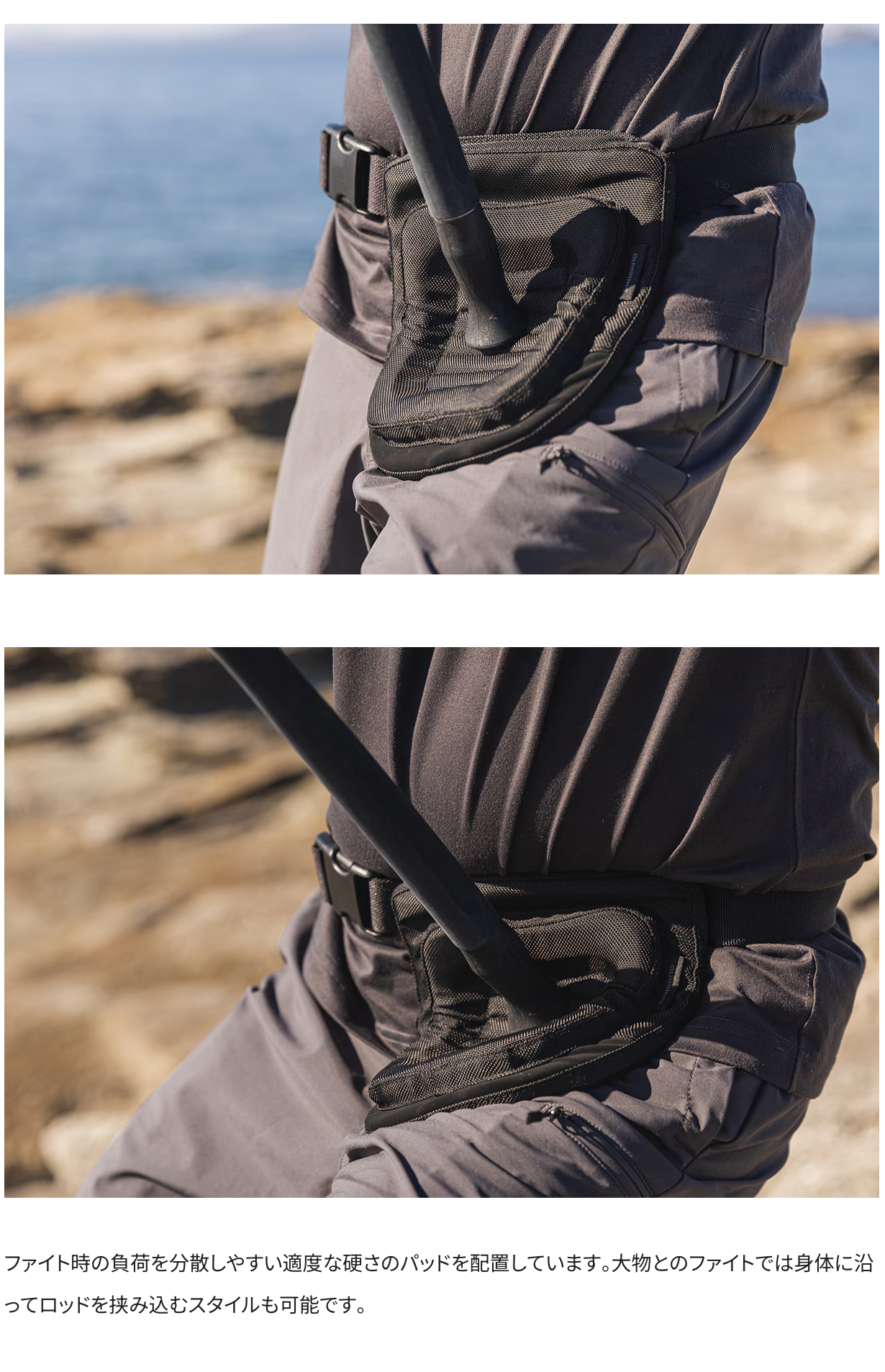 魚とのファイト時、ロッドエンドが身体に食い込むことを簡易的に予防します。非使用時には身体の側面に、ファイト時は太腿上に移動させ使用します。オフショアでの使用はもちろん、ロックショアでもその優れた携帯性で大活躍します。