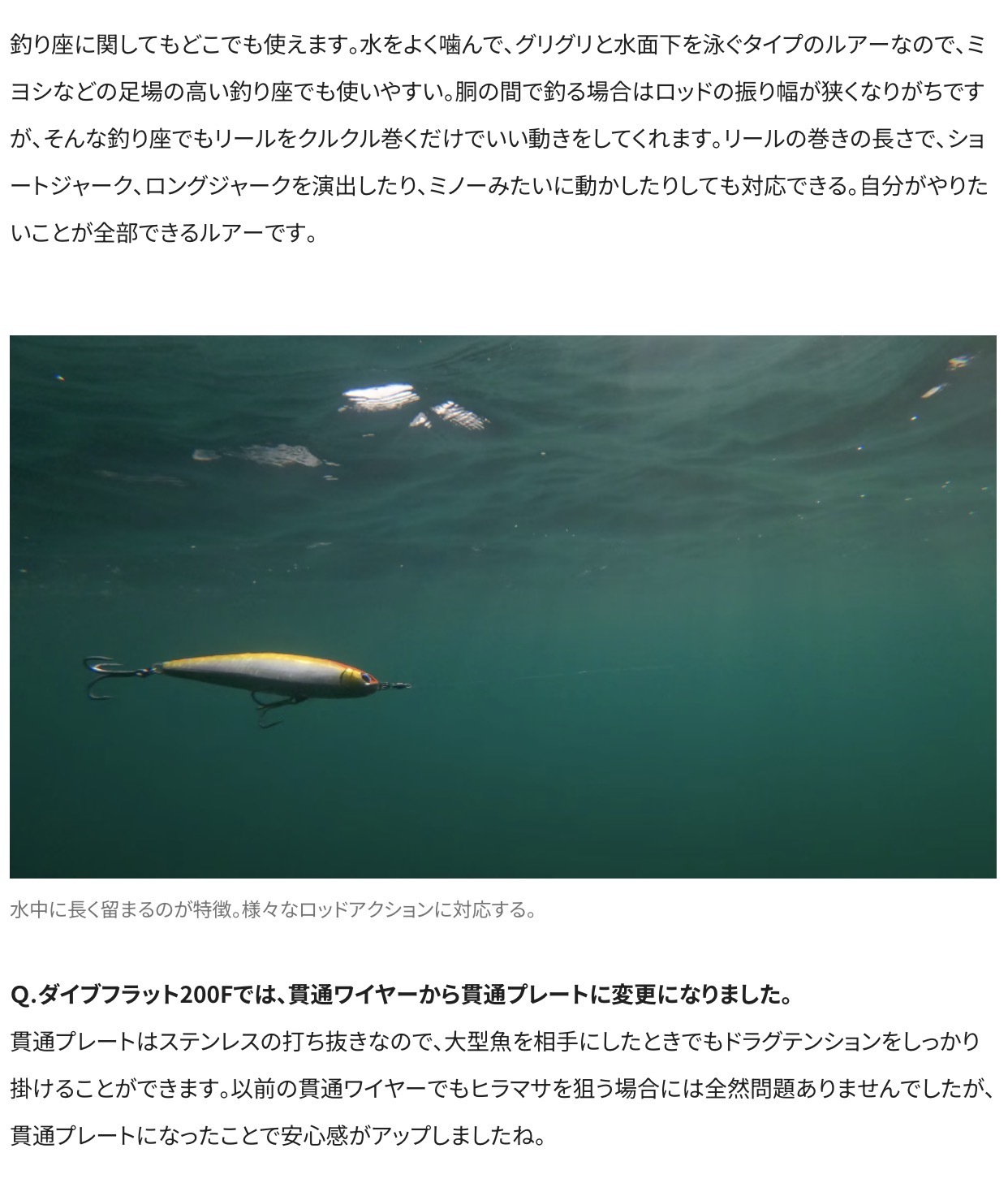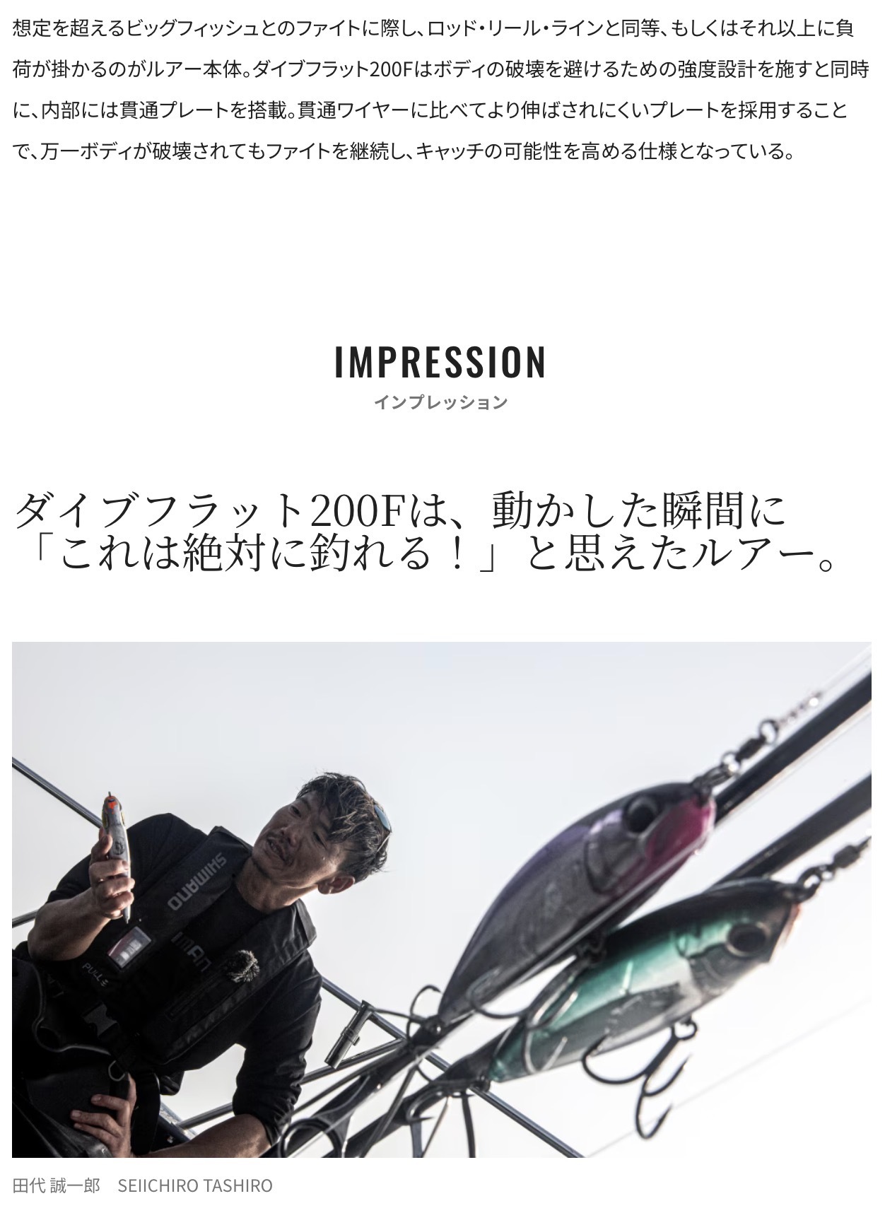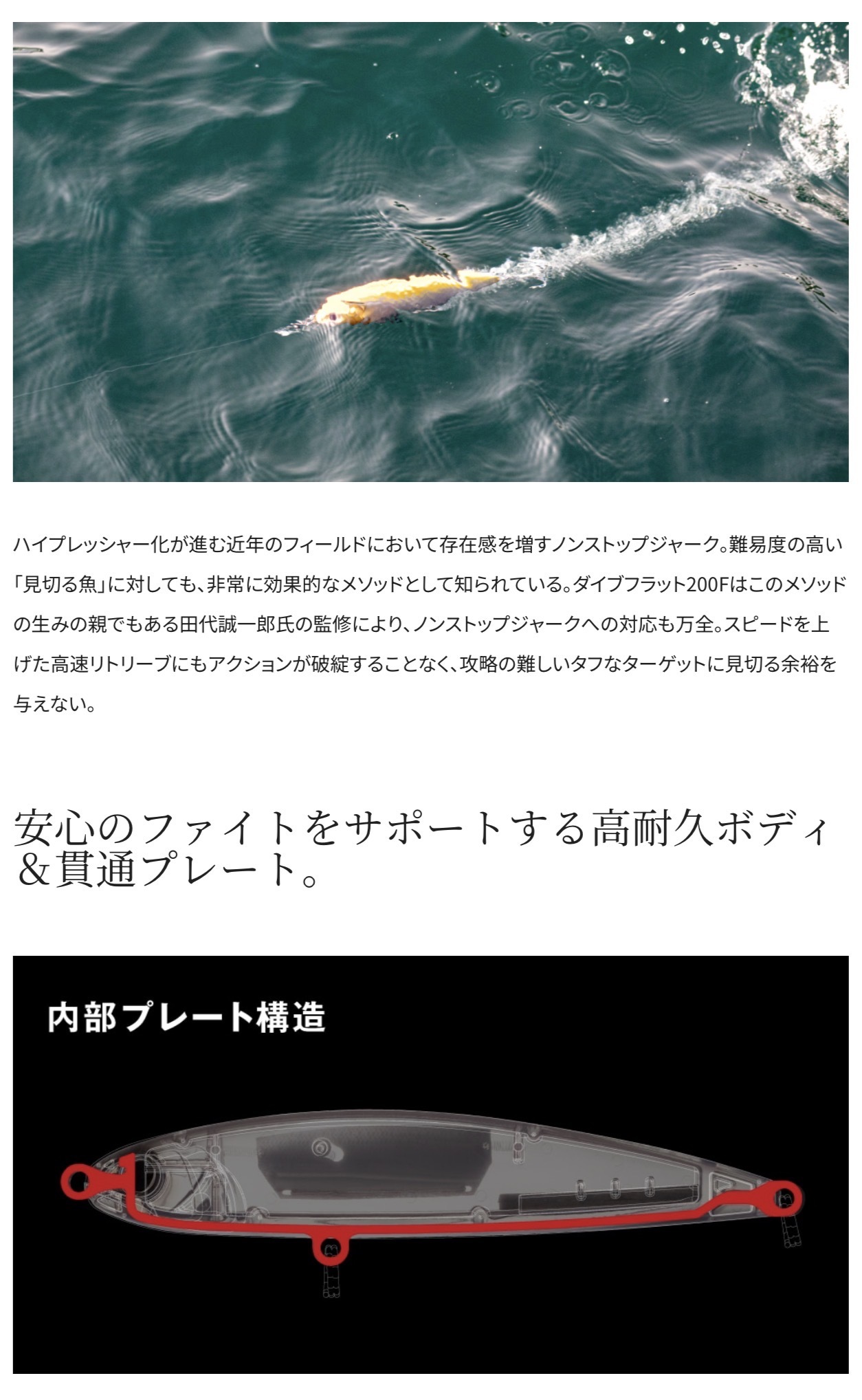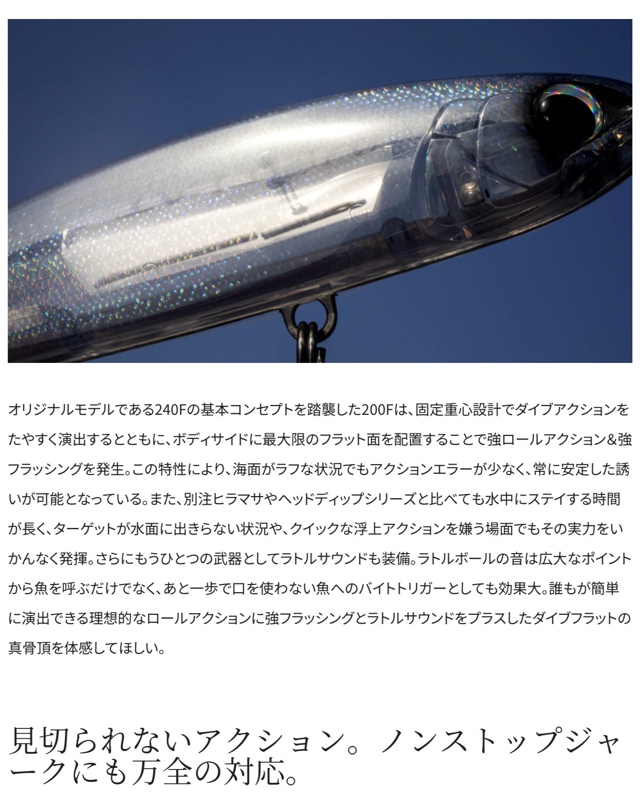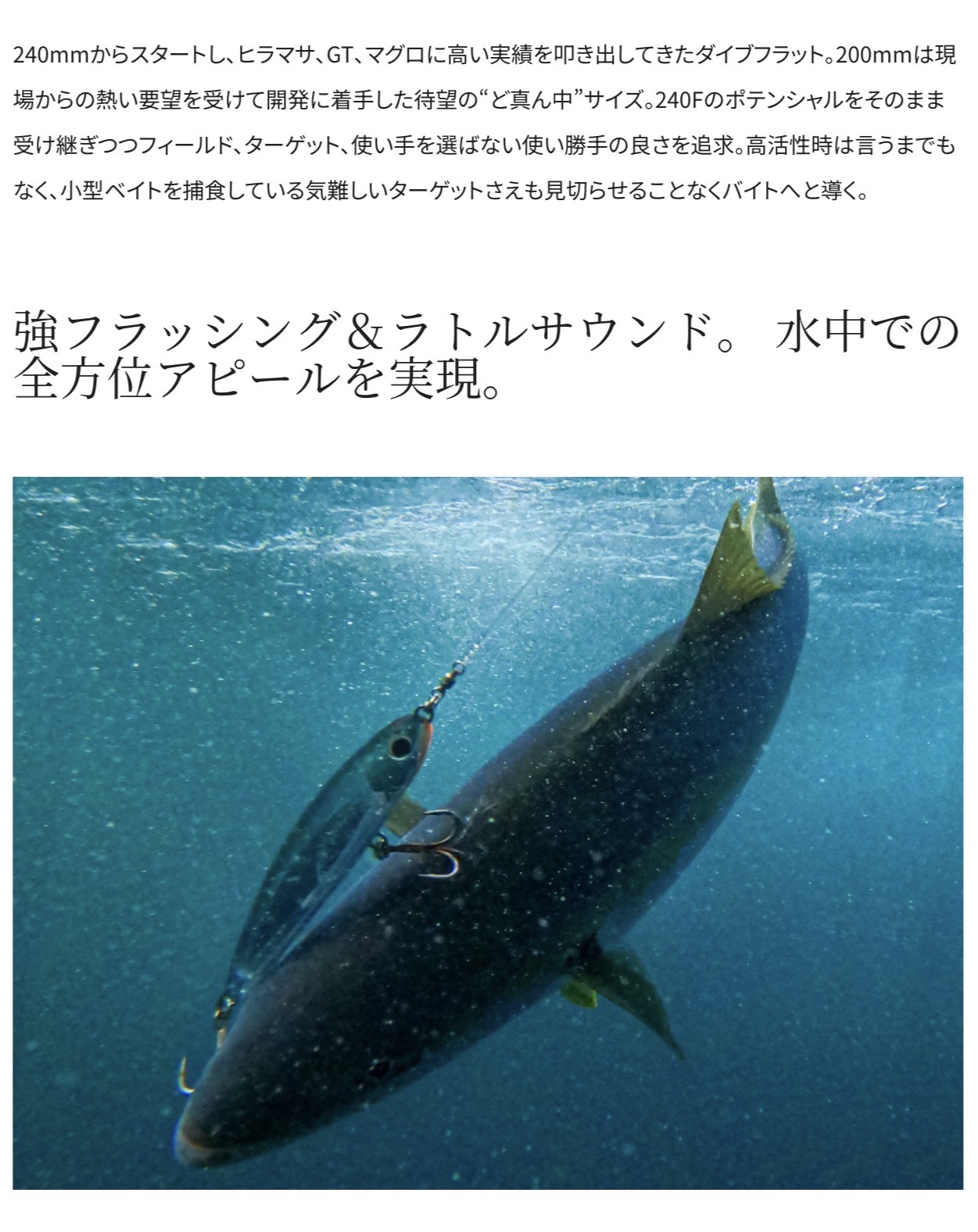 ターゲットが水面に出きらない状況においてより真価を発揮するダイビングペンシル・ダイブフラットのダウンサイズモデル。全長200mm・本体重量87gのフォルムはベイトサイズも使い手も選ばない王道の“ど真ん中”サイズ。その日のファーストキャストを託すパイロットルアーとして、あるいはスモールベイト&タフコンディション対策の切り札として、国内外を問わず絶対に外せない1本に仕上がっている。もちろん、キレ味鋭いローリングと強烈なフラッシング、ラトルサウンドのアピール力は先行モデル240Fをそのまま踏襲。高速リトリーブにも破綻することなく泳ぎ切るアクションは注目のノンストップジャークにも高度に対応。新たに採用した高強度貫通プレートの内部構造も相まって、ヒラマサ、GTといった大型魚との出会いをいっそうエキサイティングに演出する。