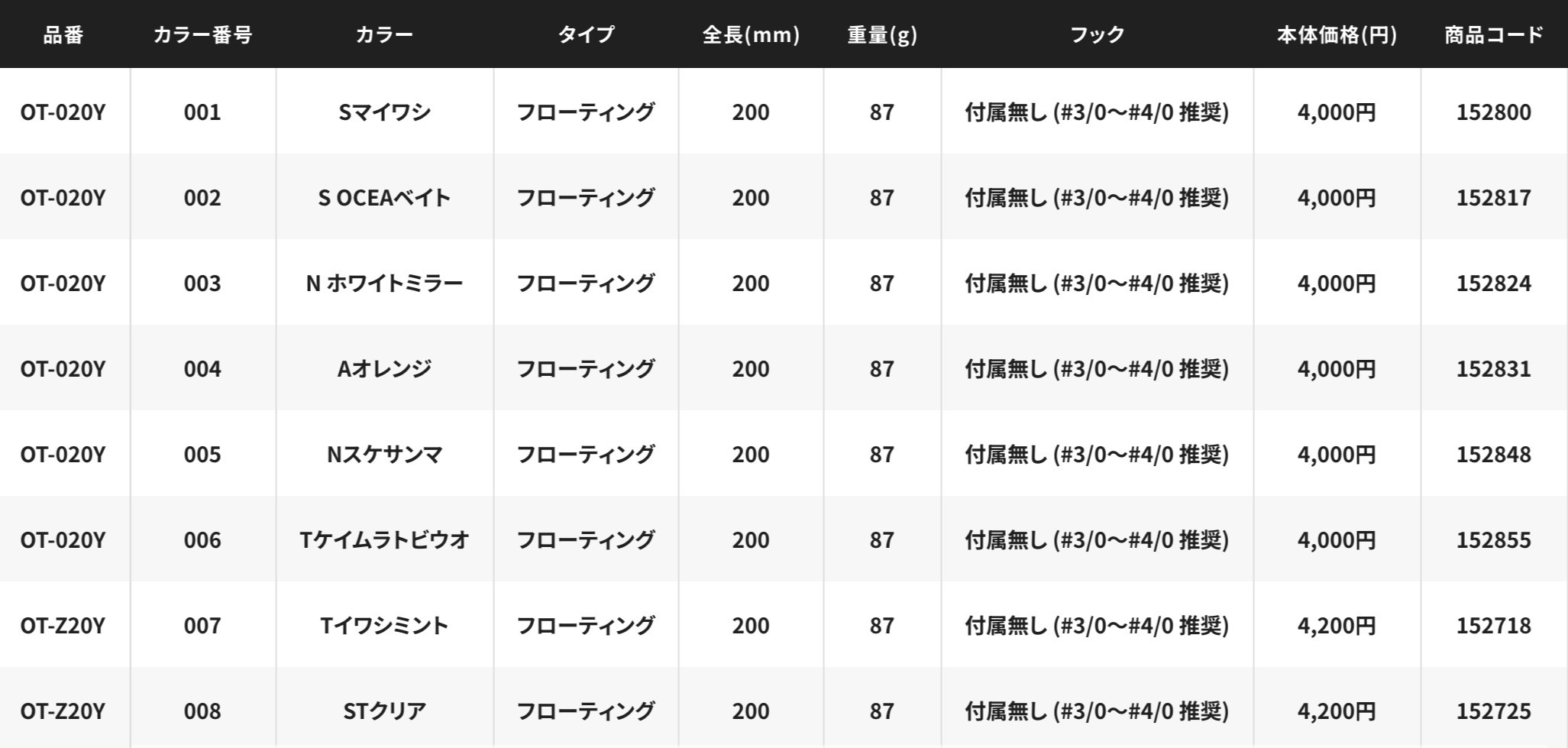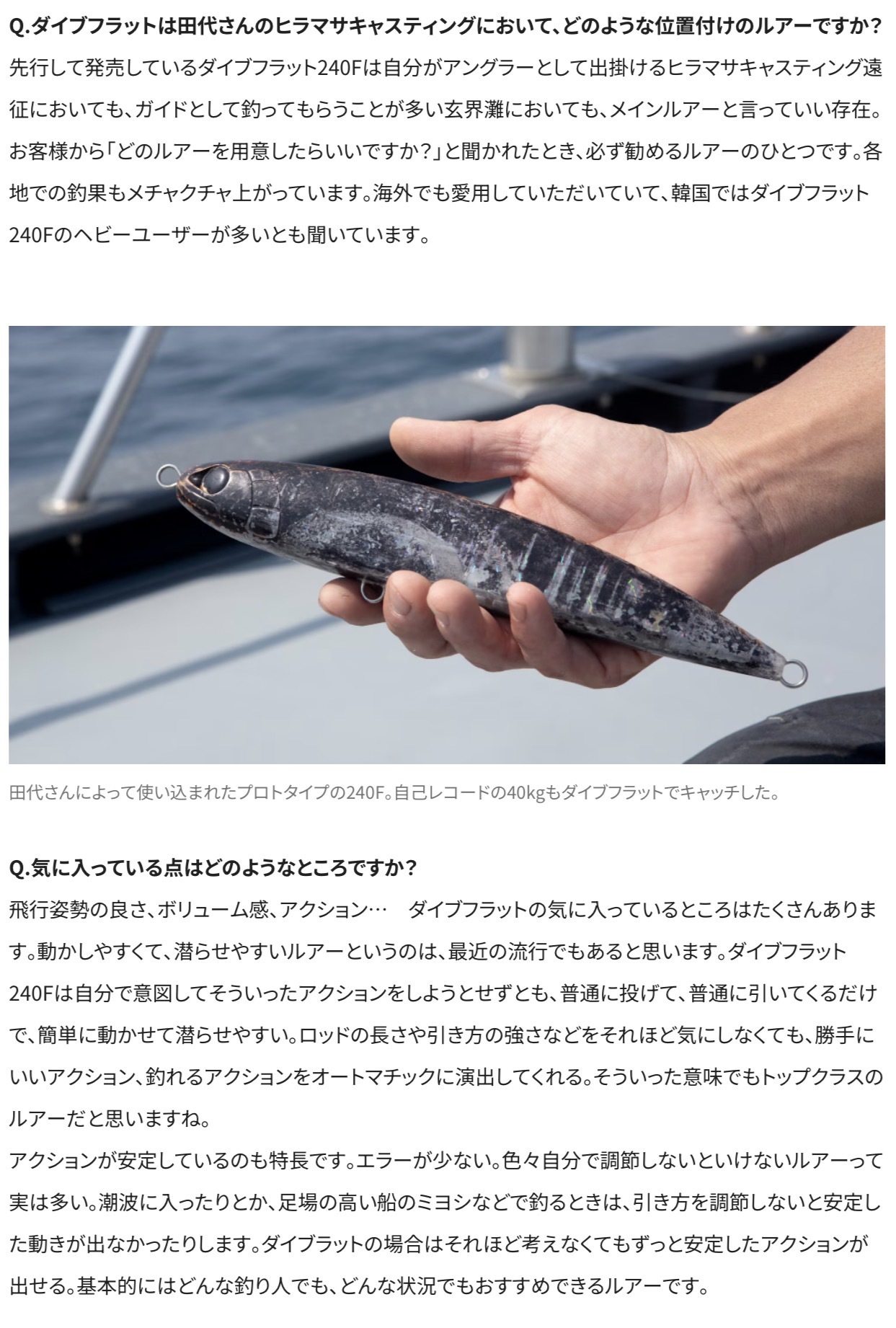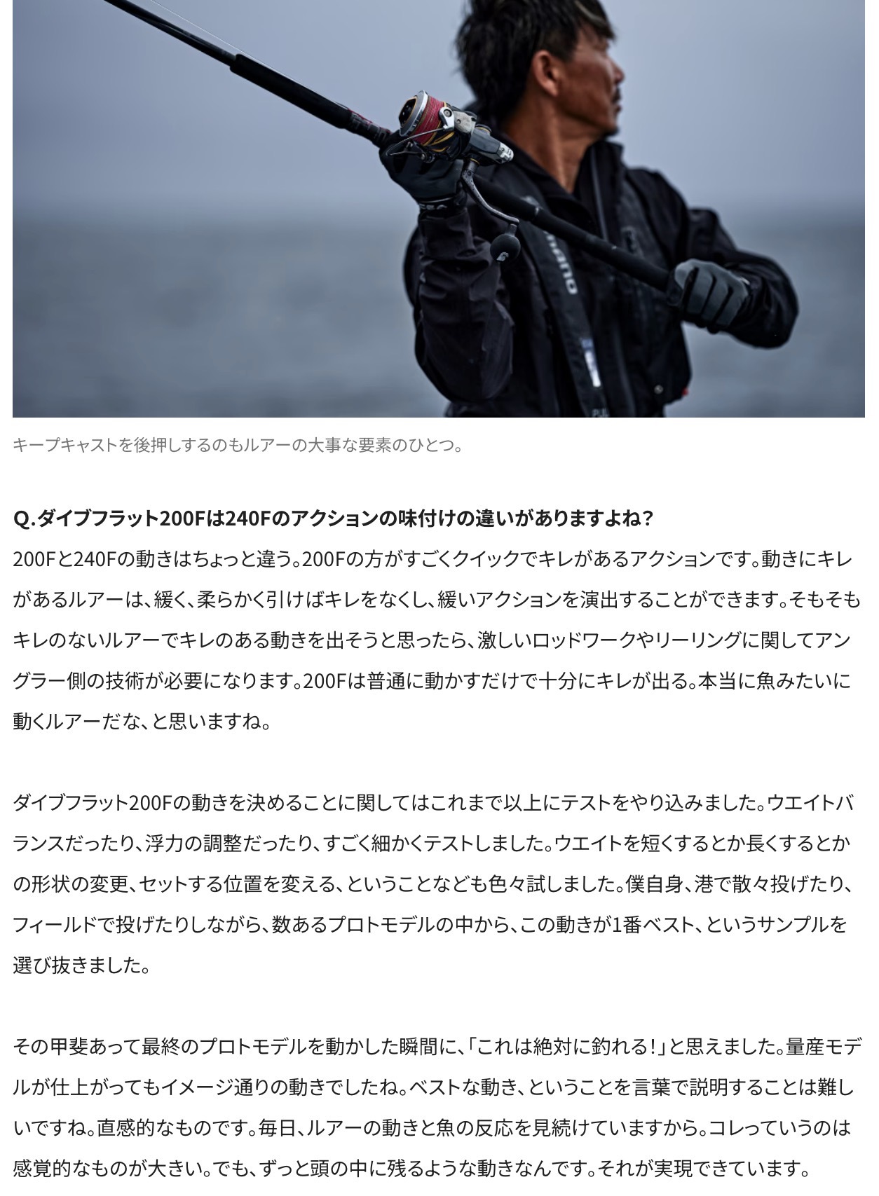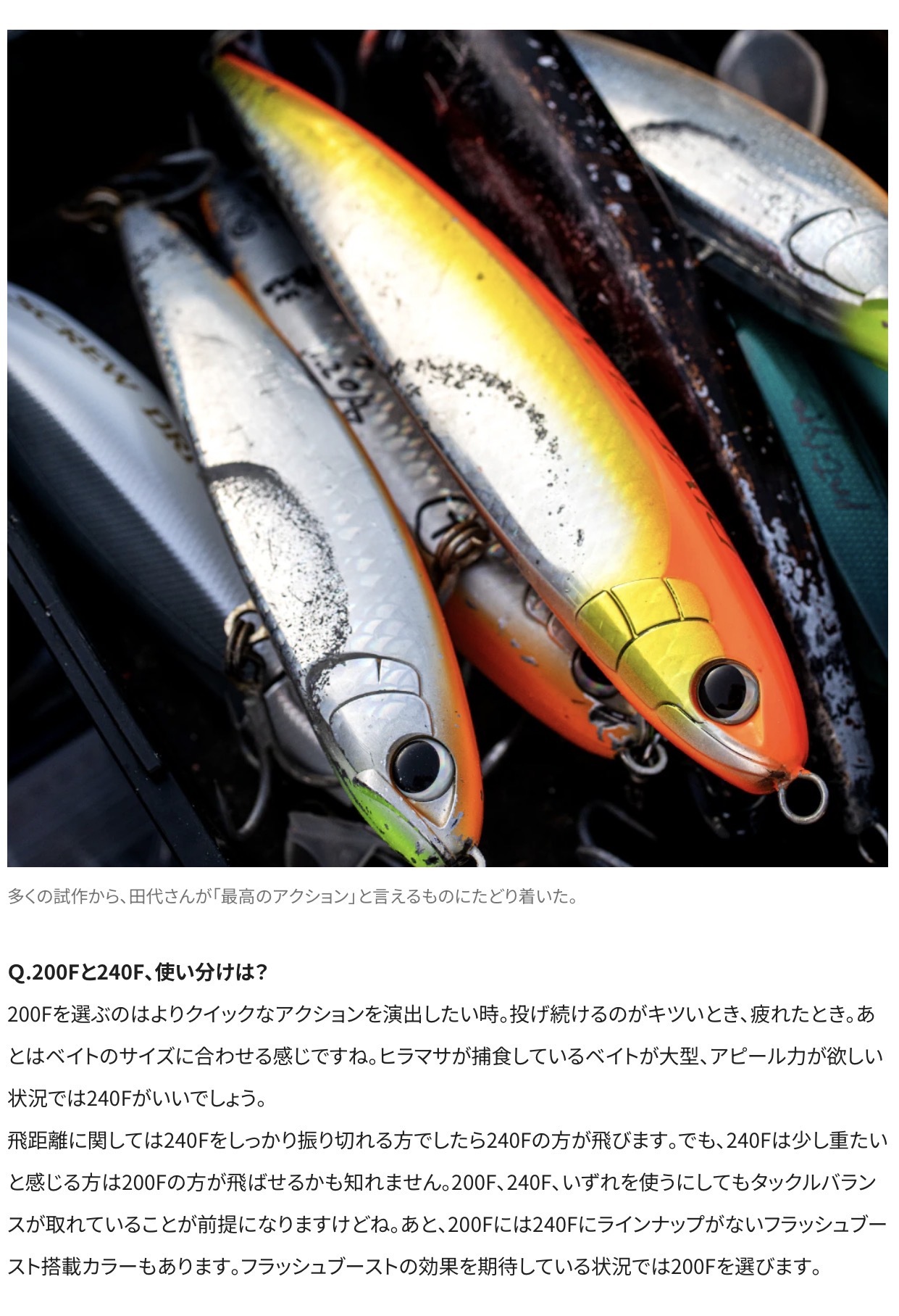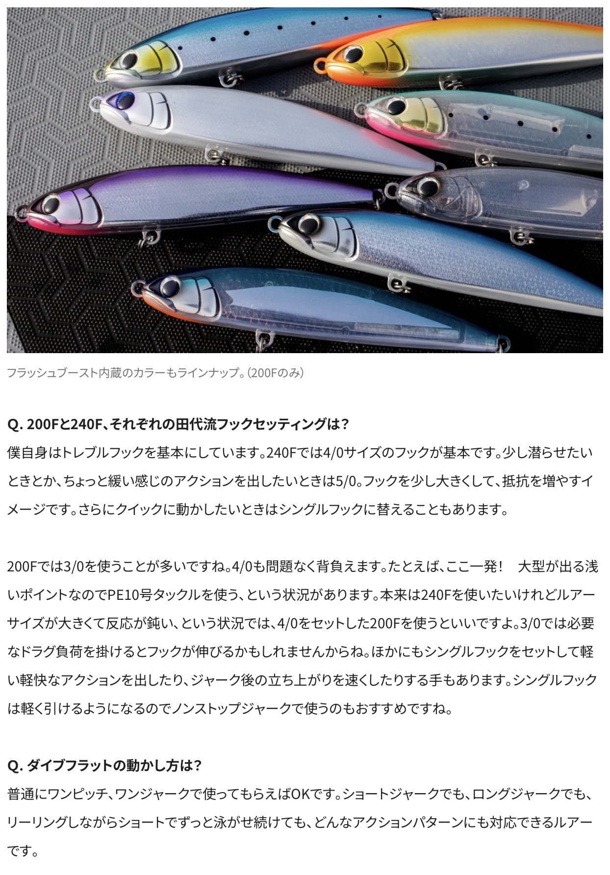 ターゲットが水面に出きらない状況においてより真価を発揮するダイビングペンシル・ダイブフラットのダウンサイズモデル。全長200mm・本体重量87gのフォルムはベイトサイズも使い手も選ばない王道の“ど真ん中”サイズ。その日のファーストキャストを託すパイロットルアーとして、あるいはスモールベイト&タフコンディション対策の切り札として、国内外を問わず絶対に外せない1本に仕上がっている。もちろん、キレ味鋭いローリングと強烈なフラッシング、ラトルサウンドのアピール力は先行モデル240Fをそのまま踏襲。高速リトリーブにも破綻することなく泳ぎ切るアクションは注目のノンストップジャークにも高度に対応。新たに採用した高強度貫通プレートの内部構造も相まって、ヒラマサ、GTといった大型魚との出会いをいっそうエキサイティングに演出する。