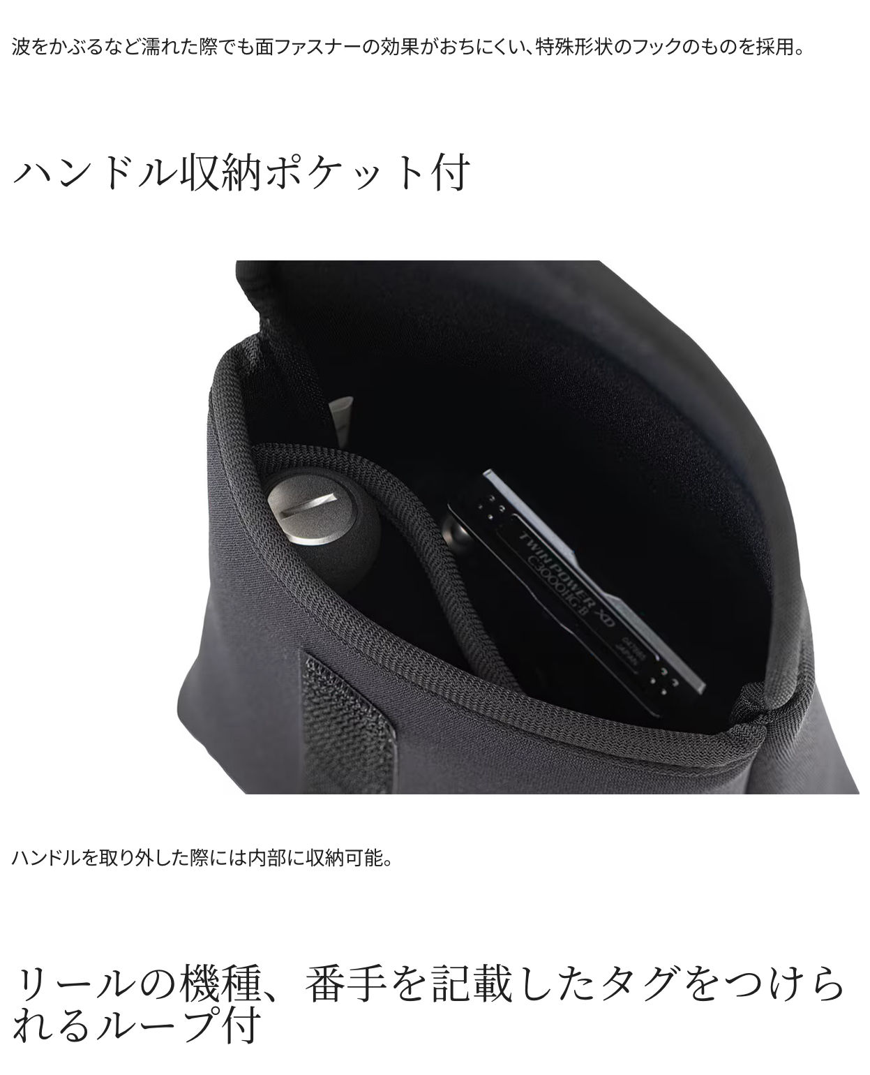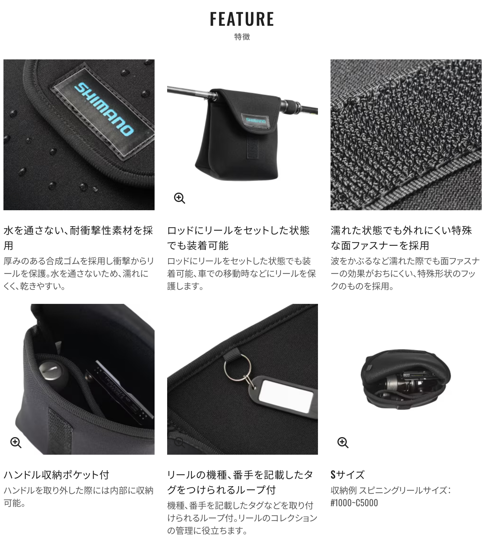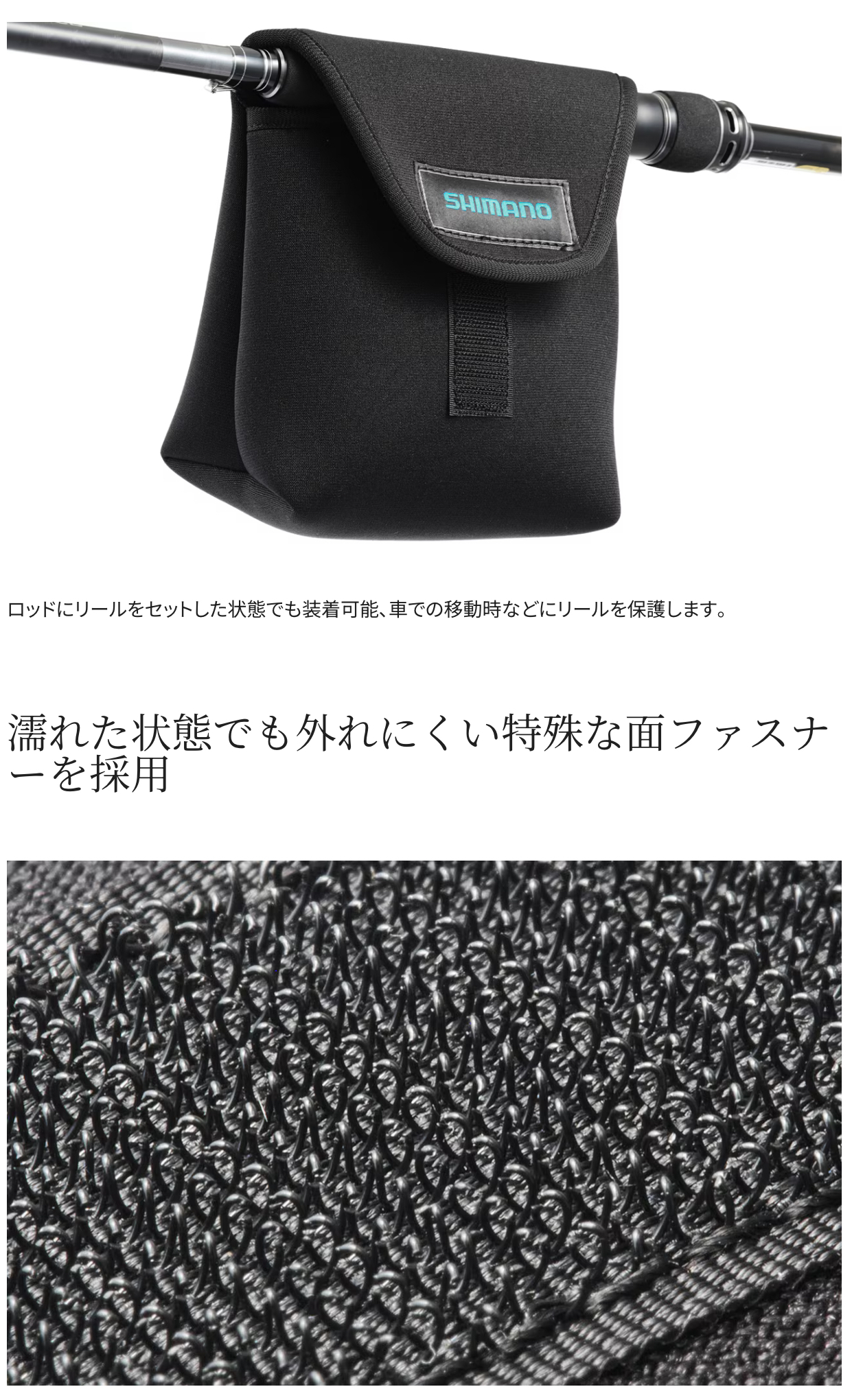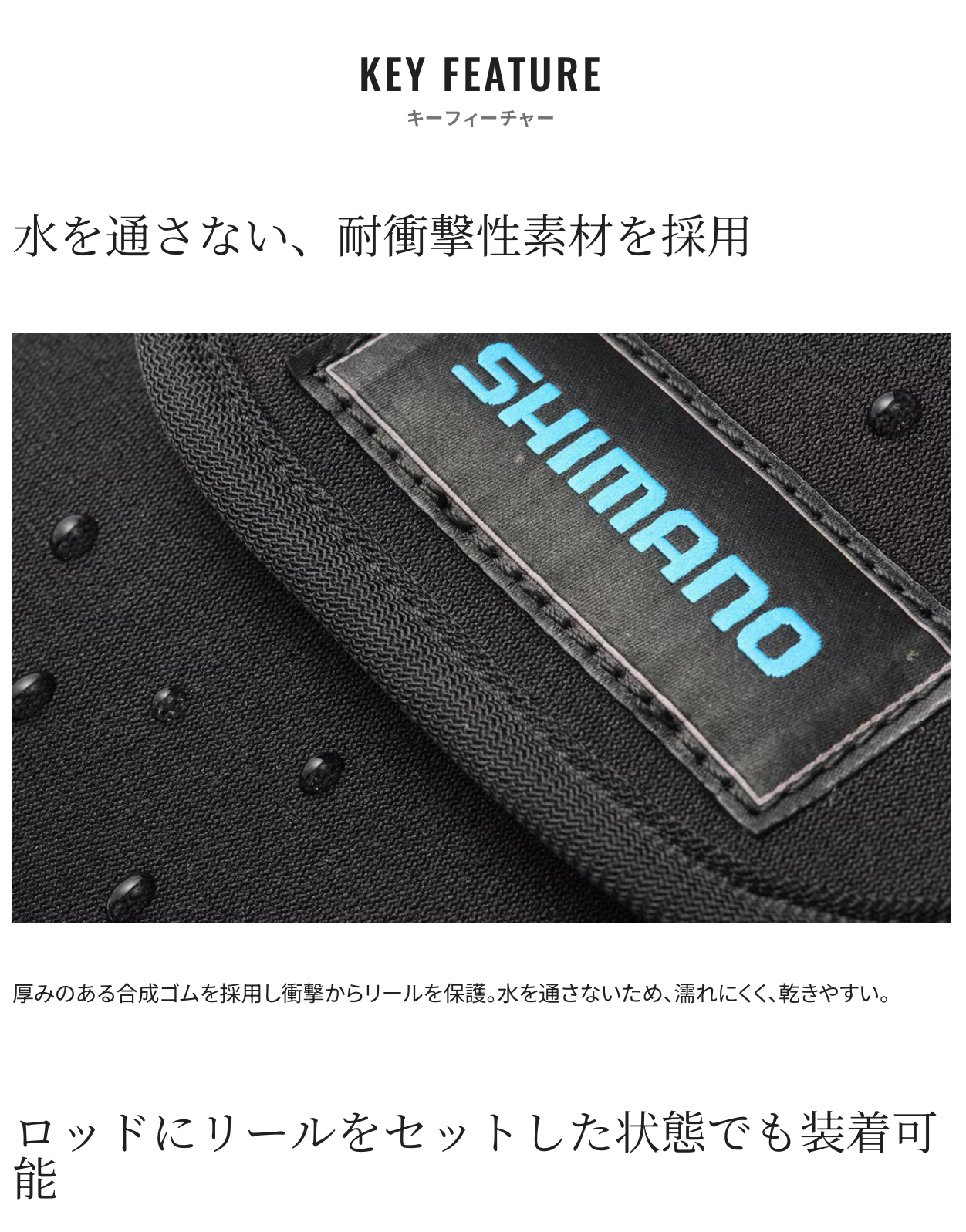 耐衝撃性のある素材でキズや衝撃を軽減するシマノスピニングリール専用リールガード。ロッドにつけた状態でも取り付けが簡単。内部にハンドル収納ポケットを配置した、シンプルなリールガード。