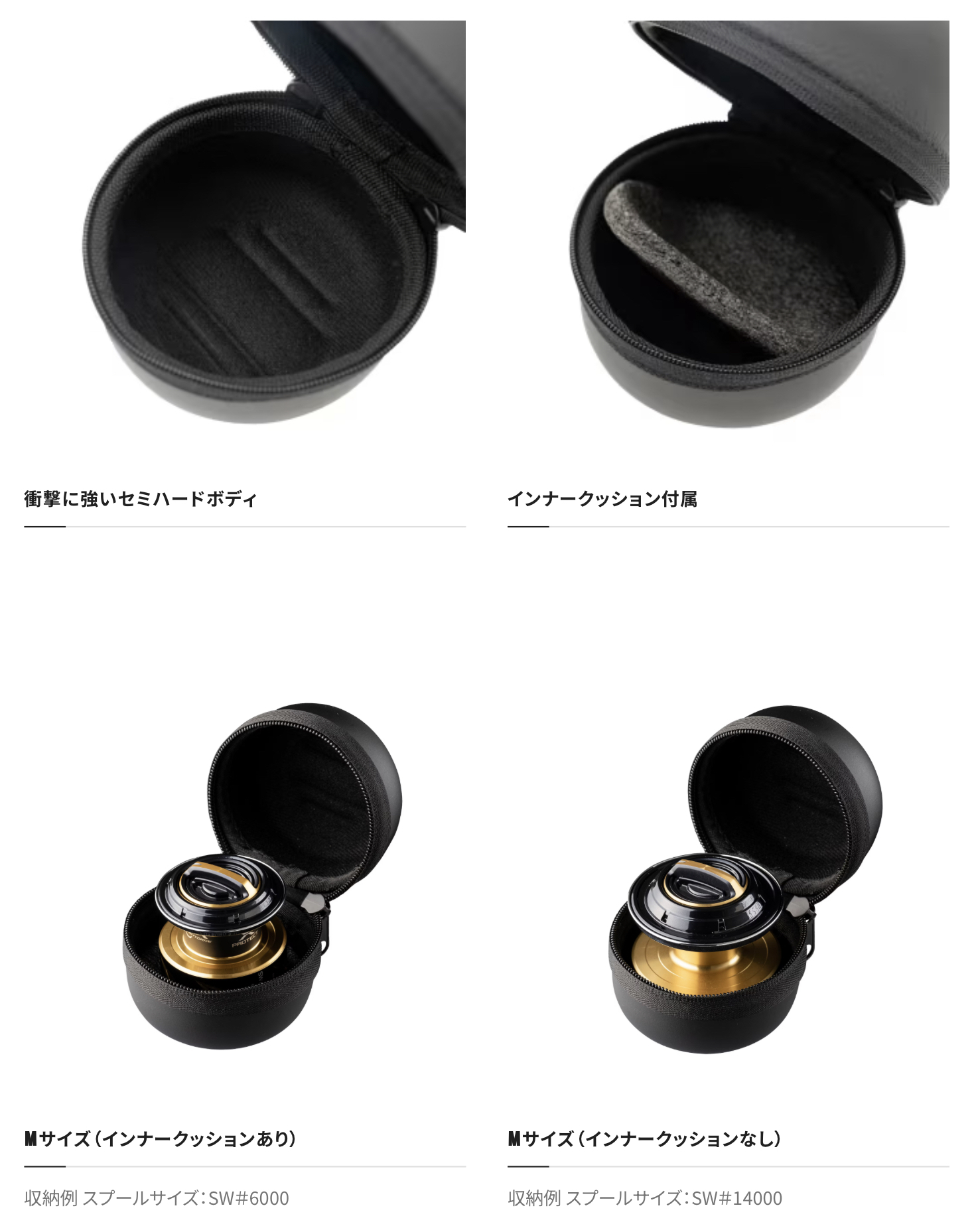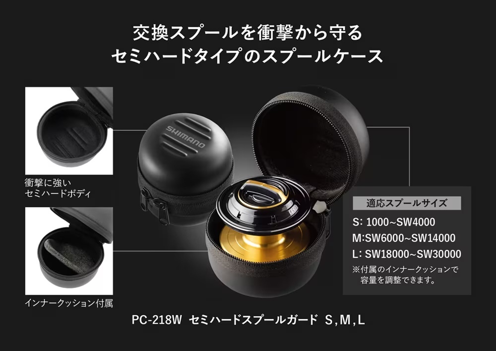 スピニングリールのスプールを釣り場に携帯する際や、遠征釣行、家で保管する際に便利なセミハードケースです。本体はEVAの発泡素材。クッション性があり、繊細なスプール本体を衝撃やゴミから保護できます。