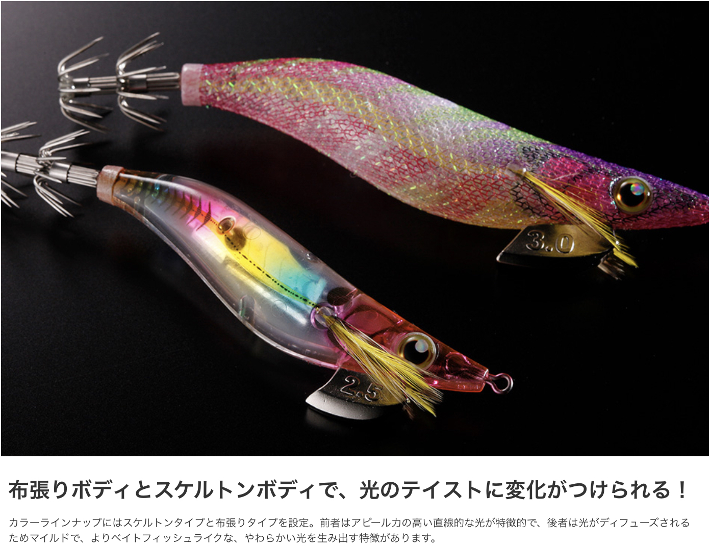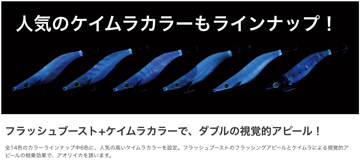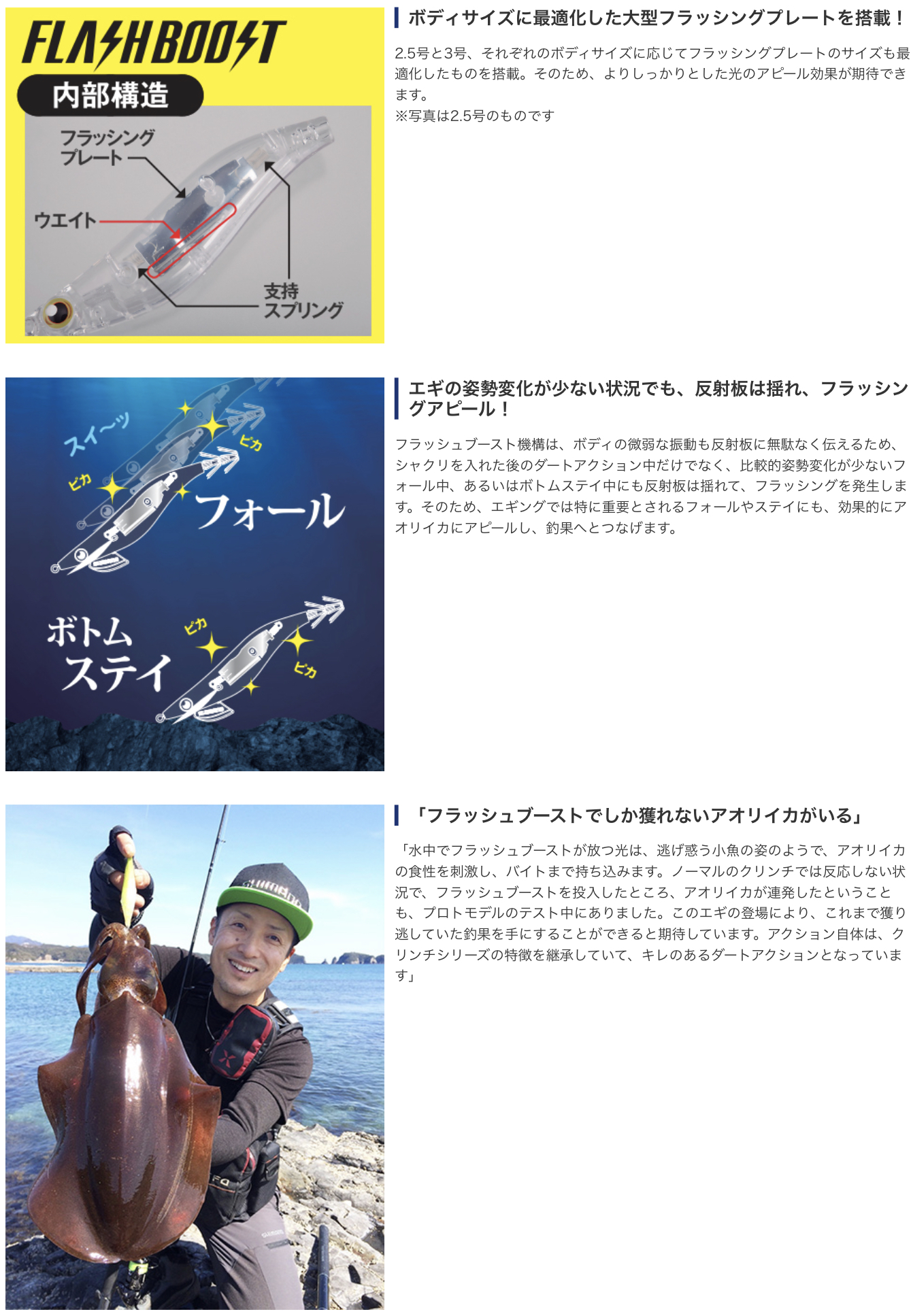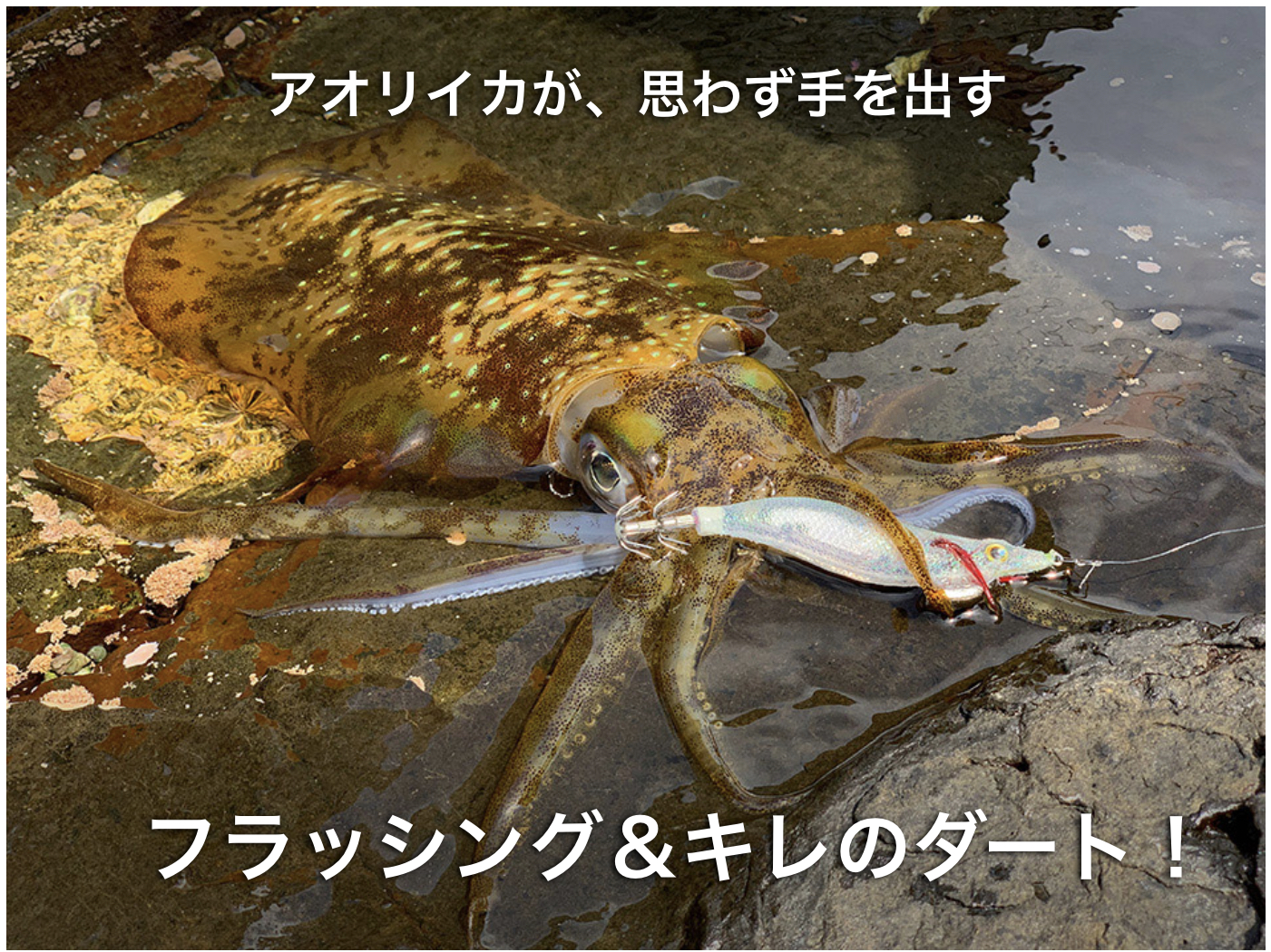 クリンチシリーズが持つ高い動力性能はそのままに、ボディ内部にフラッシュブースト機構を搭載。ダートアクション中はもちろん、フリーフォールやテンションフォール中にも反射板が揺れて、アオリイカを誘います。通常のローテーションに組み込むことで、幅広い展開が可能となります。
