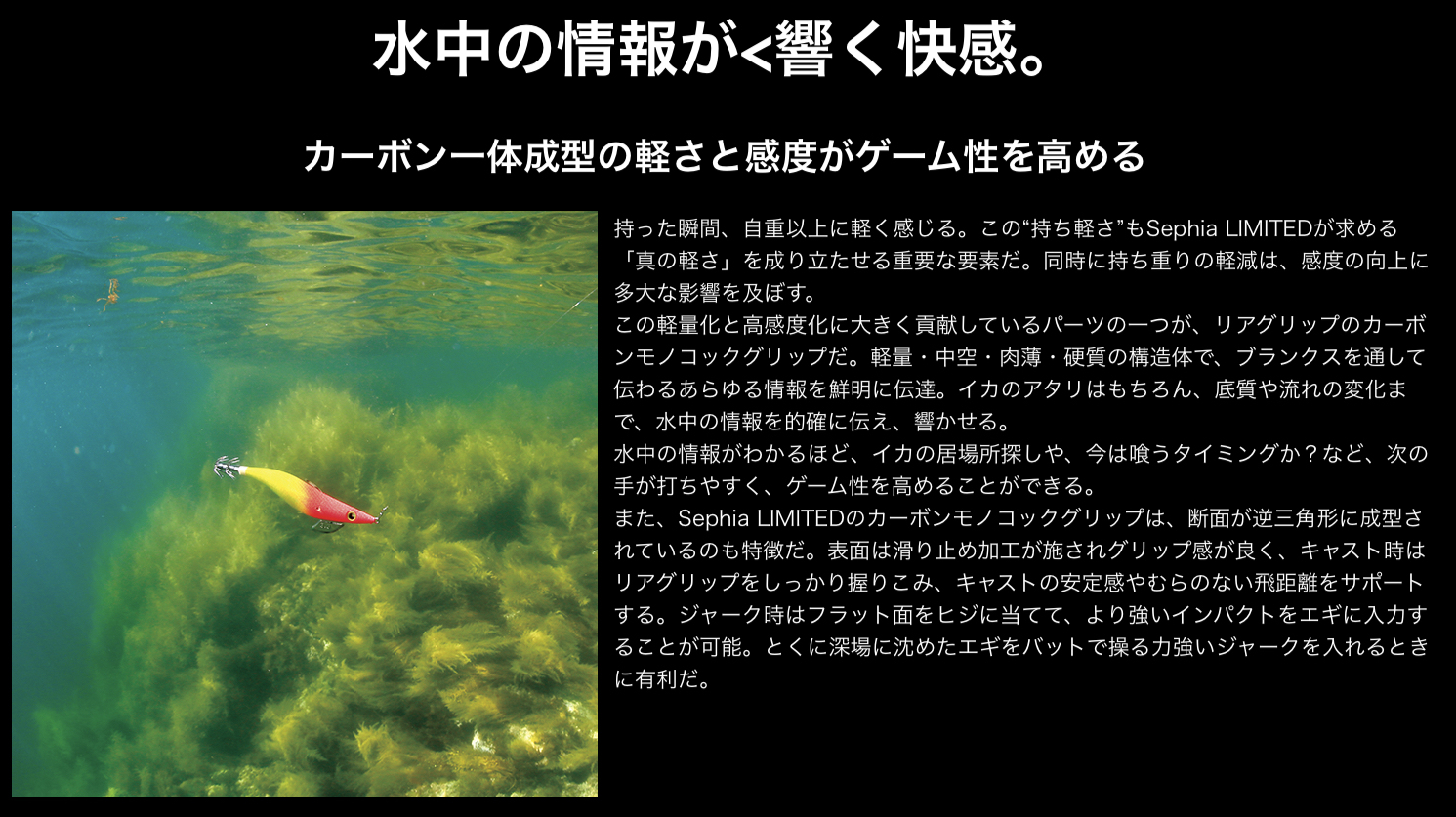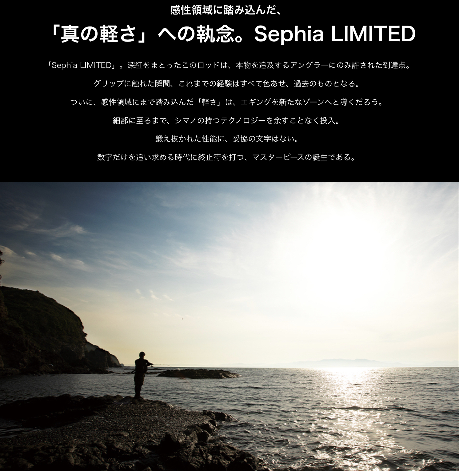 シマノ最高峰のエギングロッド『Sephia LIMITED』が目指したのは、これまでの限界を超越する「真の軽さ」。ブランクスのスパイラルXコアを軸に、カーボンのみの中空構造で創り上げたカーボンシェルグリップや、小型軽量で空気抵抗を軽減するXガイド エアロチタンなど、シマノの最新のテクノロジーを惜しみなく導入。シマノが様々な釣種で幾年もかけて磨き上げてきたテクノロジーとノウハウを高次元で融合させ、“軽さ”と“強さ”を集約して完成させたエギングロッドといえるだろう。持った瞬間の感動的な軽さ。キャストした瞬間、ジャークした瞬間の空気を切り裂く振り軽さ、そして奏でる心地よい風切り音。エギングにおける実釣動作すべてを軽快かつ正確に行うことができる。この「真の軽さ」は手に響き渡るような高感度も実現。エギンガーの感覚を研ぎ澄まし、エキスパートにさえ上達するよろこびをもたらせる。Sephia LIMITEDで、エギングの奥深さを堪能していただきたい。