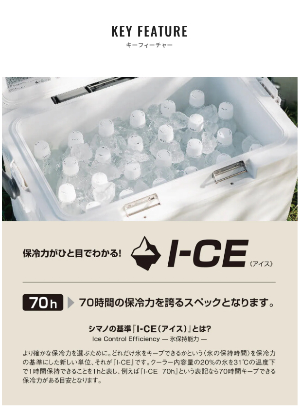 最大60cmの魚を曲げずにまっすぐ収納が可能。断熱材に軽量な発泡ポリスチレンと底面に真空パネルを採用することにより、I-CE値50hという十分な保冷力を確保。さらにキャスター付きで持ち運びもラクラク。車から釣り場への移動、遠征や電車釣行も快適です。