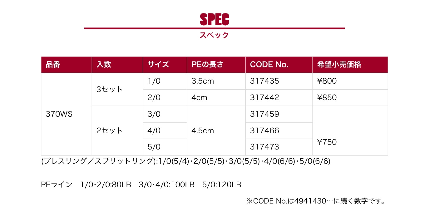 7×7のナイロンコートワイヤー入りのアシストPEラインを使用することにより、鋭い歯によるアシストPE切れを大幅に減少。タチウオパターン時にはロングジグを使用することを前提に、アシストPEの長さも長めに設定。