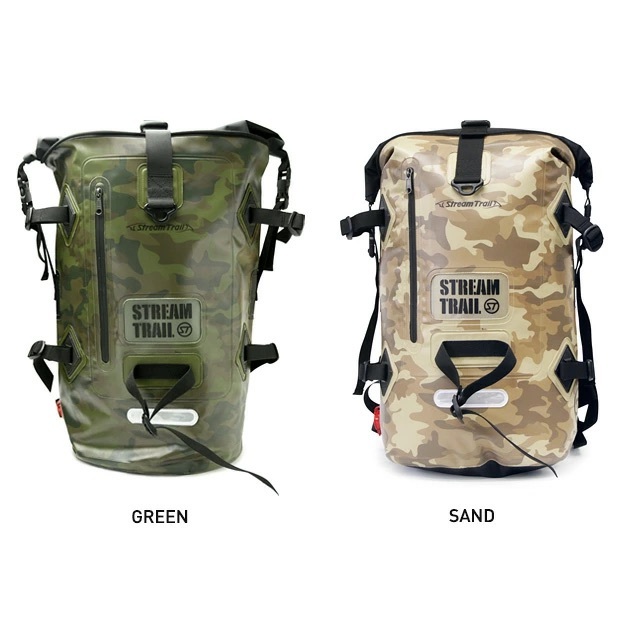 DRY TANK 40Lのカモフラージュ柄は、2色展開。暗すぎず、主張も強すぎないカモフラージュの定番GREENと、自然に馴染む落ち着いたアースカラー・SANDです。