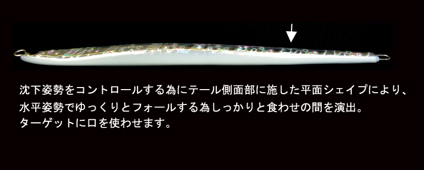 テール側面の平面シェイプにより、ジャーク後はスローで浮遊感のある水平フォール。ターゲットに口を使わせる食わせの間を演出します。