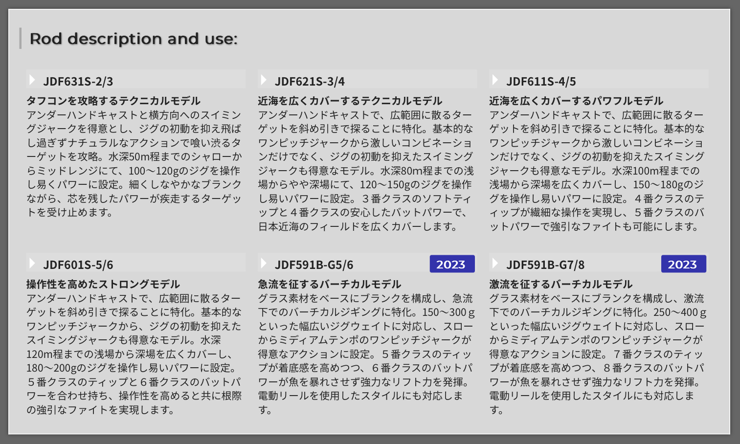 近海ジギングにおいてフィールドやターゲット別に存在する攻略法に応えるため、感度・操作性・パワーなどシーン別に必要な要素を集約し特化型のジギングロッドとして進化。唯一無二と言えるコンセプトが、新たなジギングシーンを切り開きます。