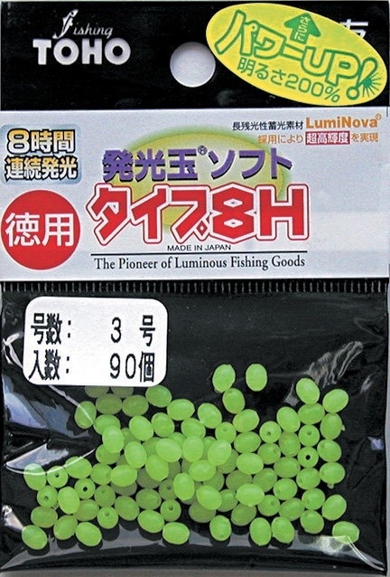 ★太陽光やライトの明かりから紫外線を吸収し、フル蓄光して連続8時間発光するソフトタイプビーズです。特に初期の1時間は従来の発光玉を大幅にしのぐ光で誘魚効果を高めます。ソフトタイプのため、状況に応じて鈎先からの脱着が可能です。