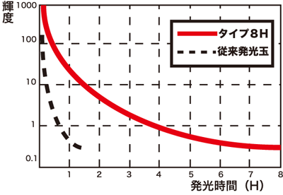 長残光性蓄光素材の世界的シェアを有する日本のトップメーカー「根本特殊化学」社製「LumiNOVA」を採用(PAT)。その性能は、発光輝度、発光持続時間ともに従来の蓄光顔料をはるかにしのぐ。