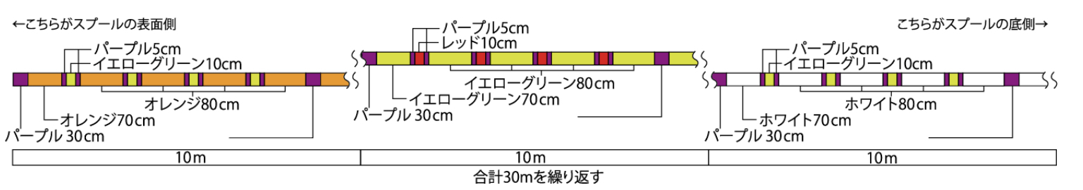 (10m毎に3色の1mマーキング分けと5m毎にパープルのマーキング付き)
