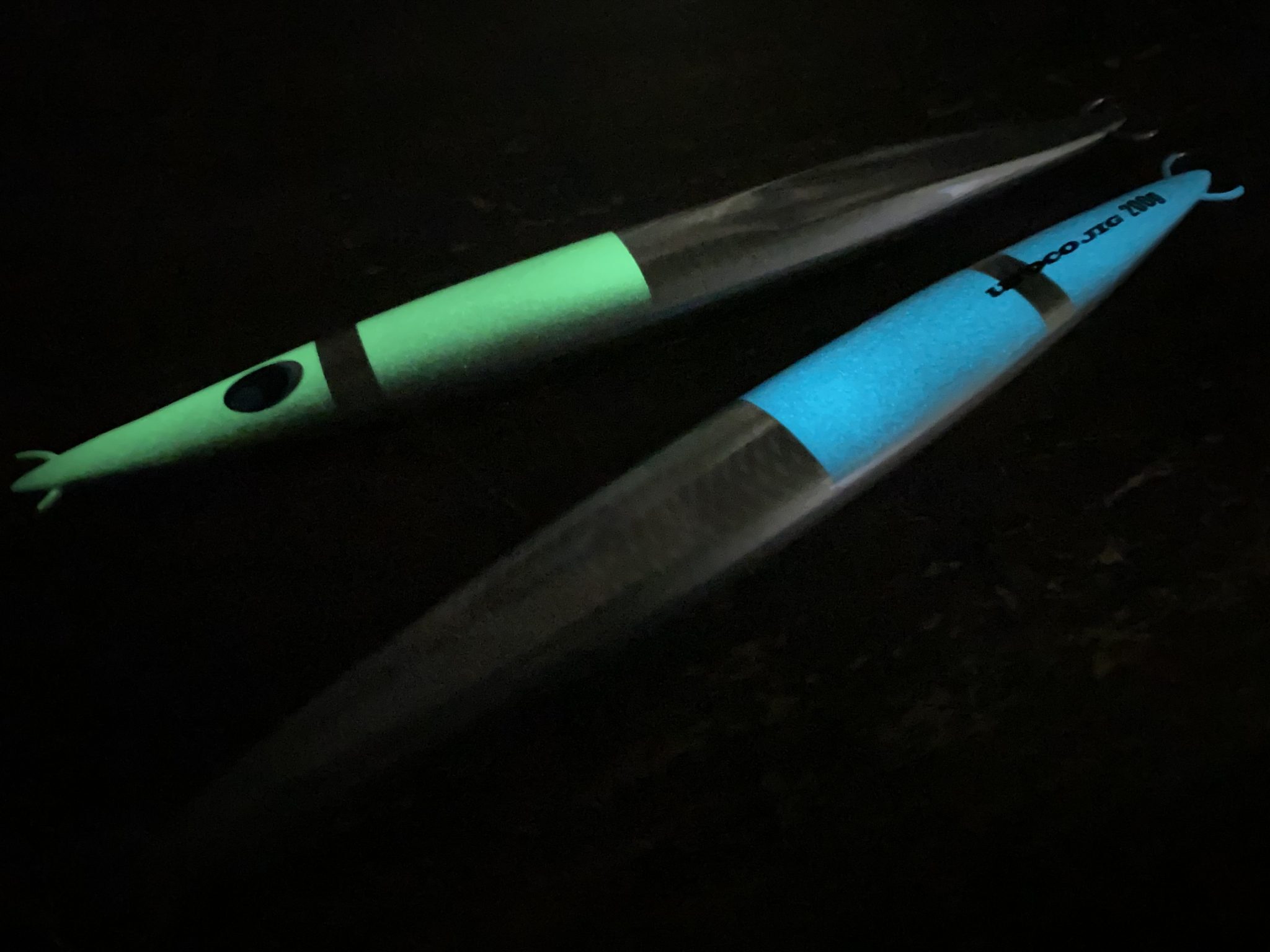 暗闇で見るとこの通り!表と裏で発光色が違うのがダブルハーフグローです!