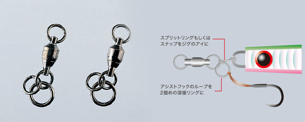 アシストのループを溶接リングの2個めにセット。そしてスプリットリングにジグをセット。回転が良いため魚がバレにくく、ラインの磨耗も低減。