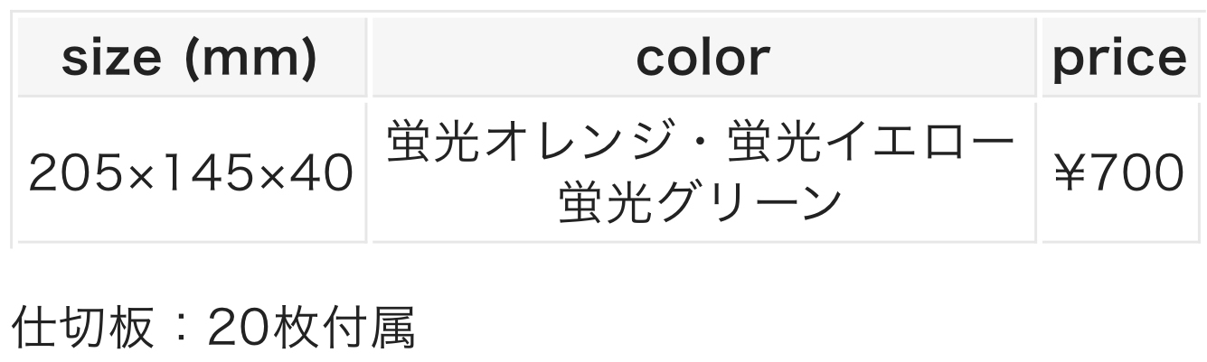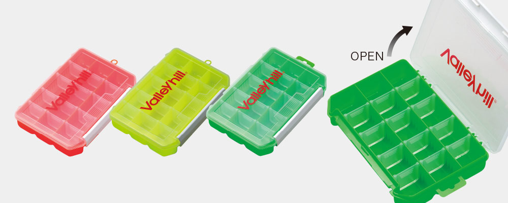 取り外し可能な仕切板を付属しているので様々なサイズの収納スペースを作り出せるます。小さめのルアーや、シンカー等の小物類を細かく収納できるケースです。バレーヒルのケースではお馴染みの蛍光カラーを採用しているので夜間でも視認性抜群です。
