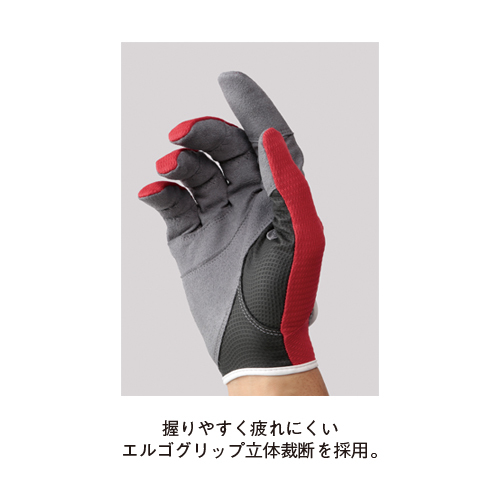 人間工学の見地から開発した立体裁断「エルゴグリップ」を採用することで優れた使用感を実現。こぶし部分に伸縮性に富んだ生地を使い、握った時のツッパリ感を解消。てのひら部分の素材は摩擦に強い人工皮革。人差し指部分の一体成型化で、さらにフィット感が向上しています。