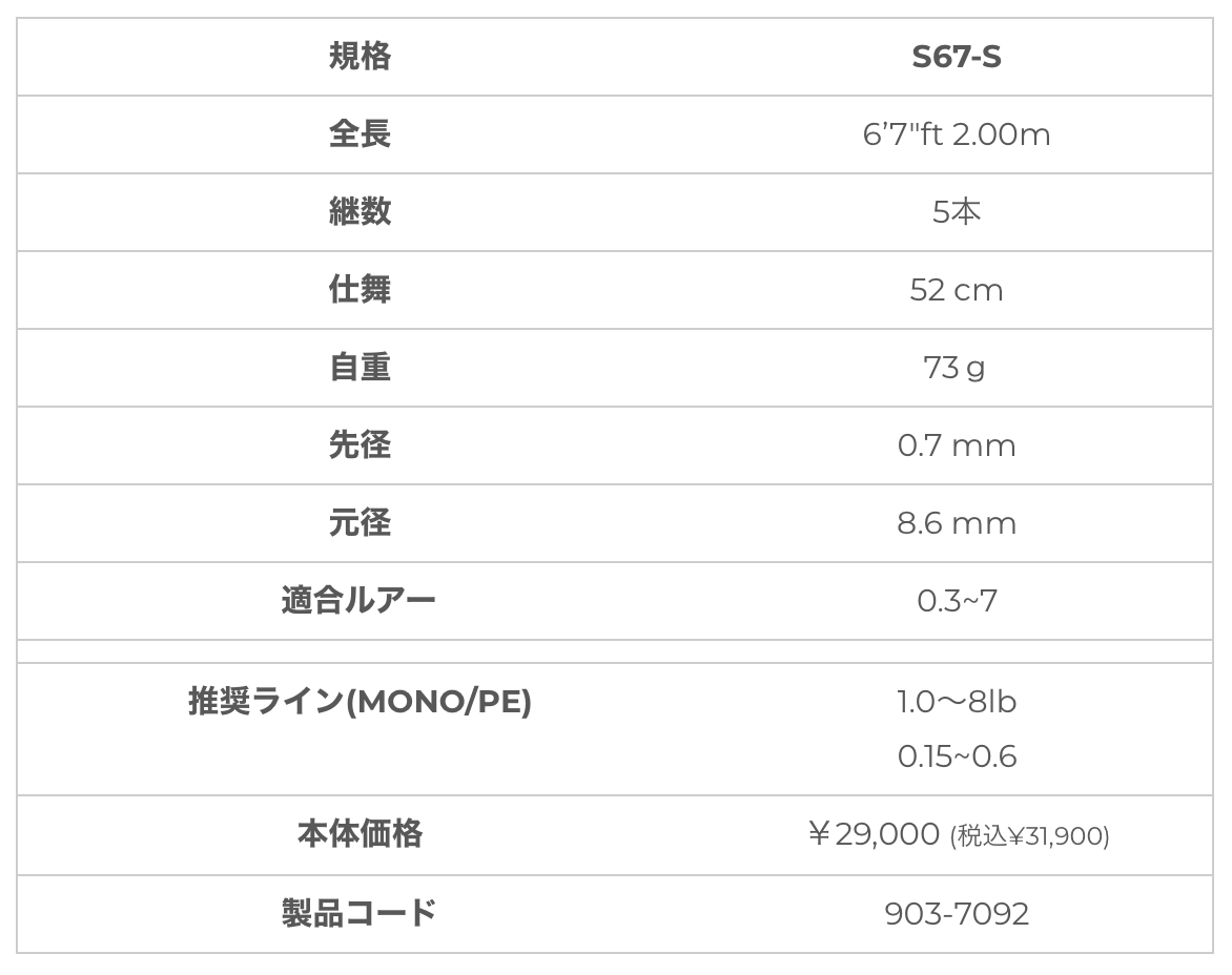 ファーストテーバーに設計したブランクスはレングスを感じさせない軽快な操作を持ち、ジグ単の釣りからキャロ、プラグ類などリグのの種類を選ばないマルチなブランクスに仕上げている。しなやかなディップとハリのあるベリーから生まれるシャープな操作性は細かなテゥイッチやジャークに対しても応答が良い。ライトゲームを幅広く、様々フィールドで手軽に楽しみたいアングラーへ送るマルチな1本である。