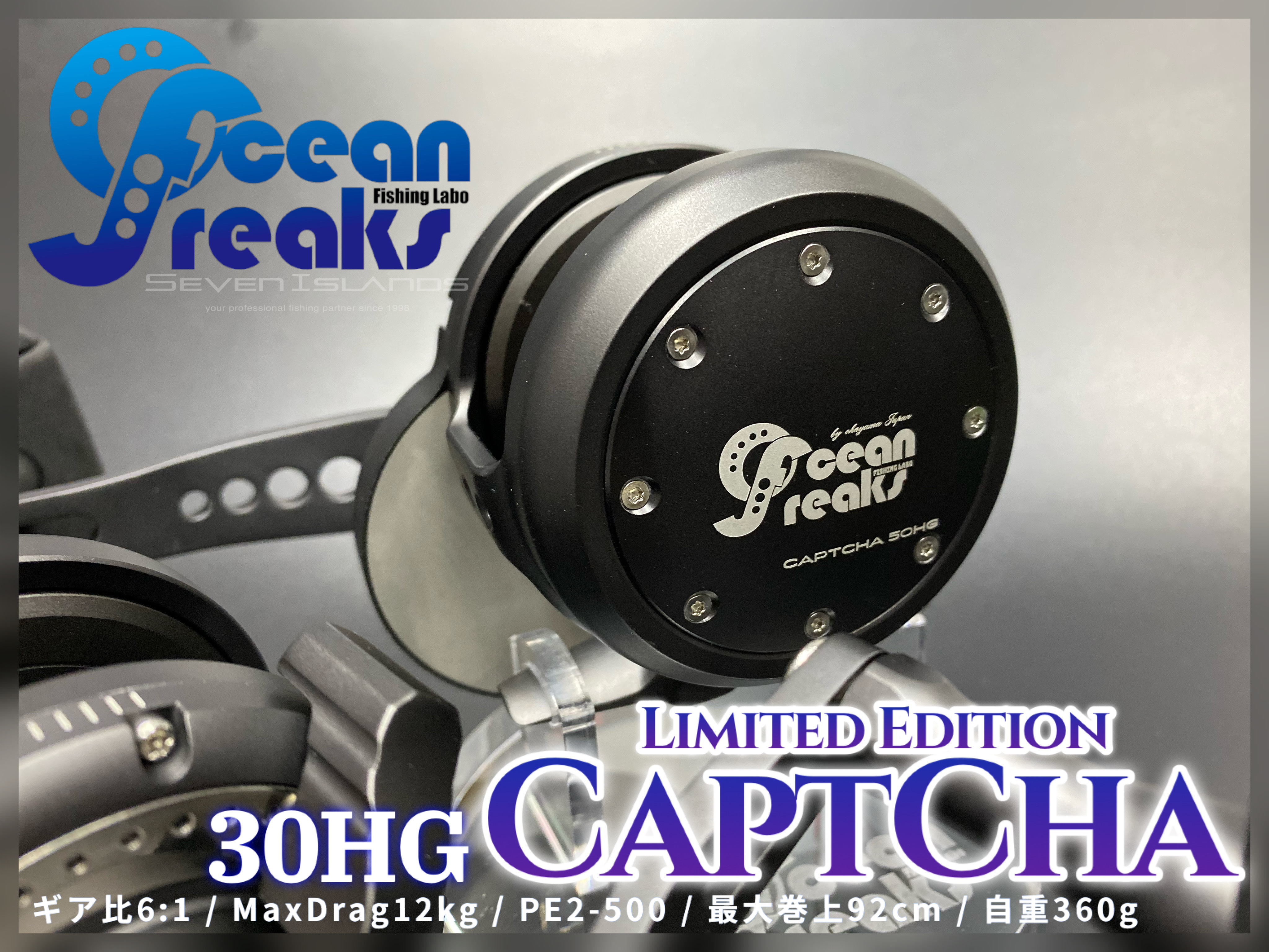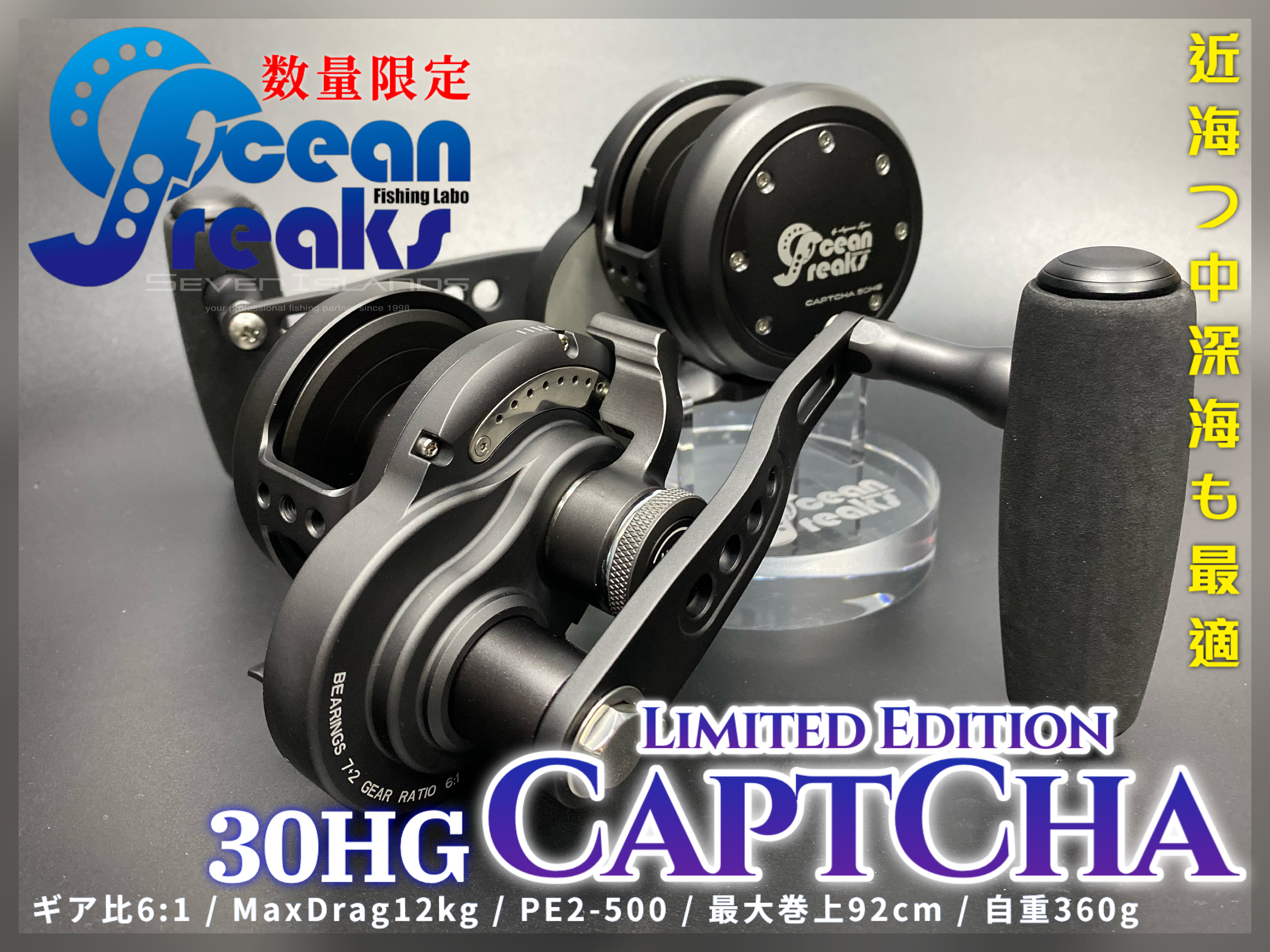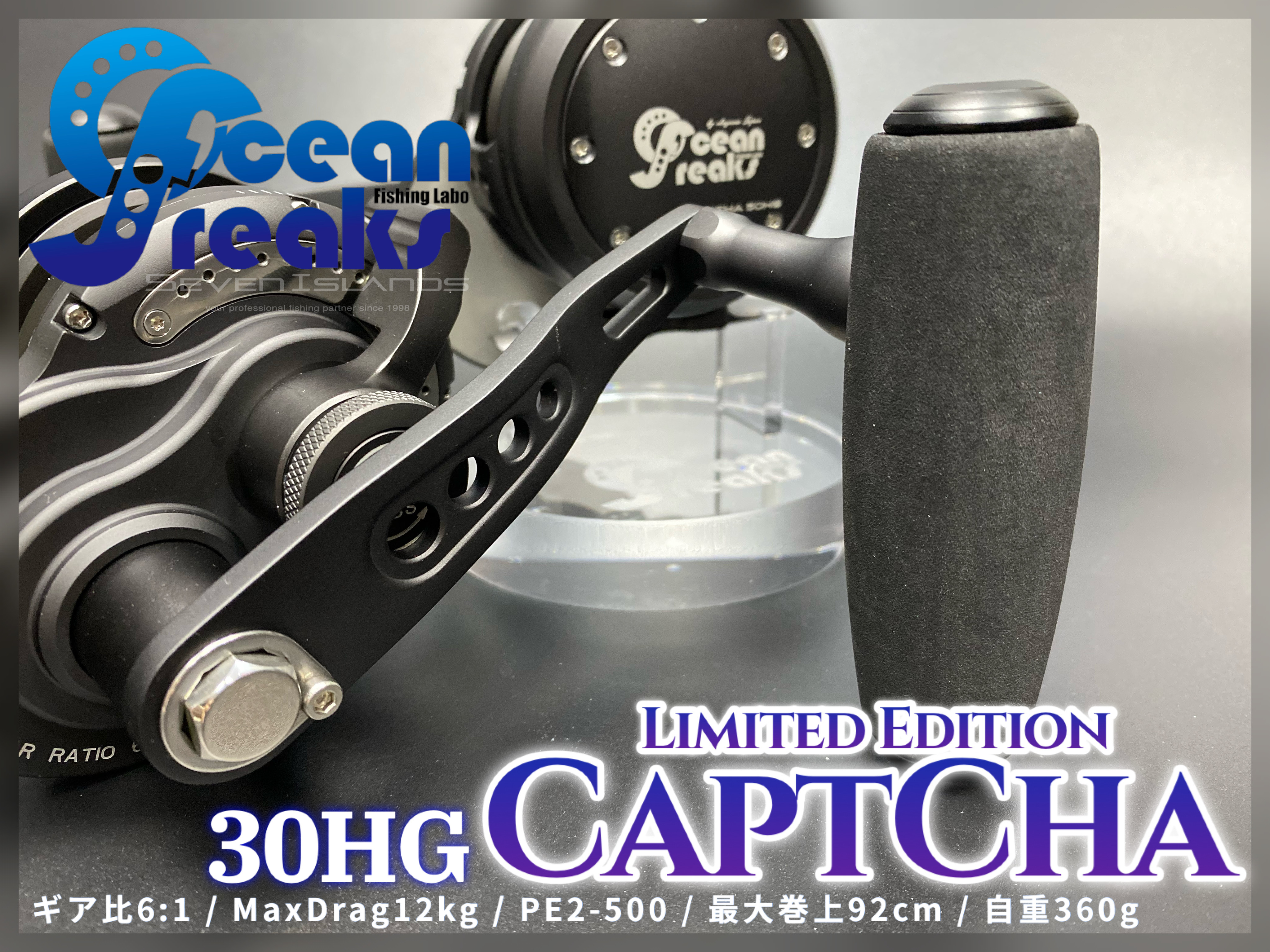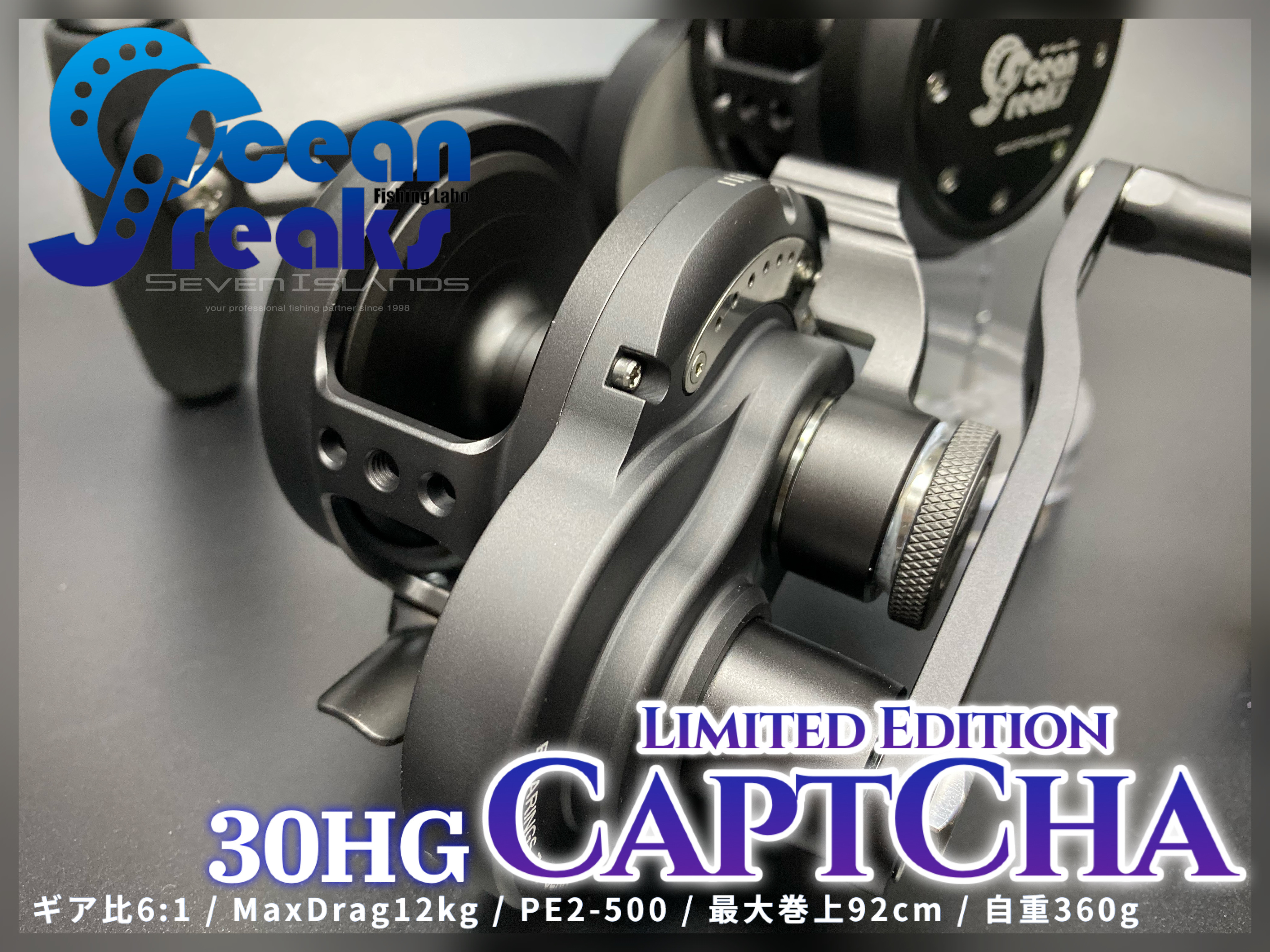 Are you looking for a powerful high capacity single lever clutch operated slow jigging reel in a small size? We at Ocean Freaks are proudly presenting the CaptCha 30HG. This is a one-of-a-kind slow jigging reel that uses a single touch operated lever to disengage and reengage the clutch in an instant. Also, it allows you to easily set the line drag with a simple touch of your finger. Most mainstream jigging reel in this class uses a conventional star pattern leaver to operate the clutch which can be a bit cumbersome in some situations. The benefits of a single-touch operated lever is being able to control the reels clutch in an instant, allowing you to keep your large catch under control. On a conventional star pattern lever reel, it can be difficult at times to return to a previous line drag setting value after changing the clutch setting. So we at Ocean Freaks have introduced the CaptCha 30HG as a new option for coastal water fishing. The CaptCha 30HG has been redesigned and based off of our popular Captcha 60HG reel. The design of all of our CaptCha products are exceptional. Also the materials used in hand building these product are the finest. The aluminum alloy that is used in this product is referred to as the A6061 alloy. This aluminum alloy is a precipitation-hardened aluminum alloy that contains magnesium and silicon as its major alloying elements. This allows us to machine a fine reel and body that is not only light but very strong. As a result this compact light weight reel can easily handle drag exceeding 10 Kg. The drag control washer uses a carbon fiber surface to allow for a sustainable smooth line control under any conditions. The gear drive in this reel adopts a reinforced aluminum alloy which has been treated for the harsh conditions of salt water fishing. When fishing in deep coastal waters with the goal of a big catch, it can be quite tiresome without the right equipment. But with the CaptCha 30HG you can catch more and larger heaver fish with the easy to use drag lever system with relative ease. The optimal gear ratio allows for quick line retraction and helps in hoisting heavy weight. Also, the compact design of the body which easily fits in your palm makes thumbing with one hand an easy task. This important feature makes the frequent on-and-off operation of the clutch much easier and can reduce the strain and stress of heavy costal water fishing. The Captcha 30HG is also suitable for benthic zone fishing with the goal to catch fish such as the prized rosy seabass. The high line capacity allows fishing in this zone a breeze. The excellent size-to-weight ratio makes light jigging in coastal waters a pleasant experience too. We have left hand drive reels available as well. The CaptCha 30HG is an excellent option for both beginner as well as experts do to the unique drag lever control system. Fish with confidence and ease with the CaptCha 30HG!
